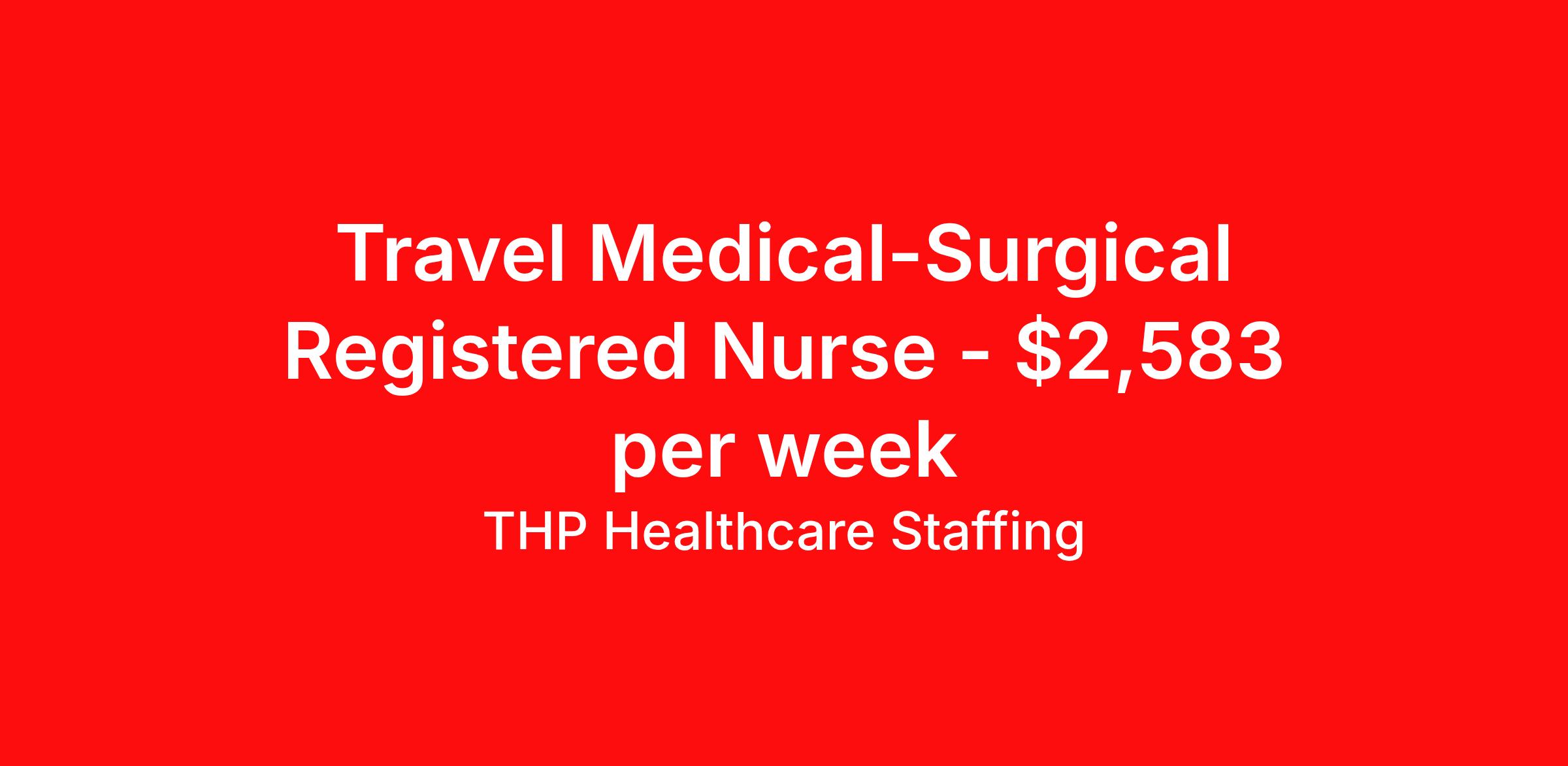 THP Healthcare Staffing is seeking a travel nurse RN Med Surg for a travel nursing job in Florence, South Carolina. Job Description & Requirements Specialty: Med Surg Discipline: RN Start Date: 04/13/2026 Duration: 13 weeks 48 hours per week Shift: 12 hours, nights Employment Type: Travel Our Client is currently seeking RN - MedSurg positions in Florence, SC for a 4x12 Nights shift. You must have current State Licensure and at least 1 year of recent experience. Requirements Current Resume State Licensure Current BLS and/or ACLS and/or Specialty Certifications 2 Current Clinical References Physical (Within 12 Months) TB Skin Test (Within 12 Months) Titers - MMR/Hep B/Varicella Respiratory Fit Test (Within 12 Months) Current - Tdap/Flu Vaccinations Must be able to pass pre-employment, background and urine drug screening Compensation and Benefits Compettive Pay Packages Health Benefit Package Travel pay - 1st pay check Extending Contract Bonus Refer a friend and earn extra cash! At THP Healthcare Staffing, we take care of you - work with us, not for us! THP Healthcare Staffing Job ID 17934668. Pay package is based on 12 hour shifts and 48.0 hours per week (subject to confirmation) with tax-free stipend amount to be determined. Posted job title: RN:MedSurg,19:00:00-07:00:00 About THP Healthcare Staffing At THP Staffing, we specialize in connecting healthcare facilities with highly skilled travel nurses and allied health professionals who bring exceptional care and expertise wherever they go. Our mission is to ensure that every healthcare provider has access to top nursing talent, regardless of location, to deliver superior patient outcomes. Benefits Weekly pay Life insurance Pet insurance License and certification reimbursement Medical benefits Employee assistance programs Referral bonus Vision benefits Holiday Pay Health savings account