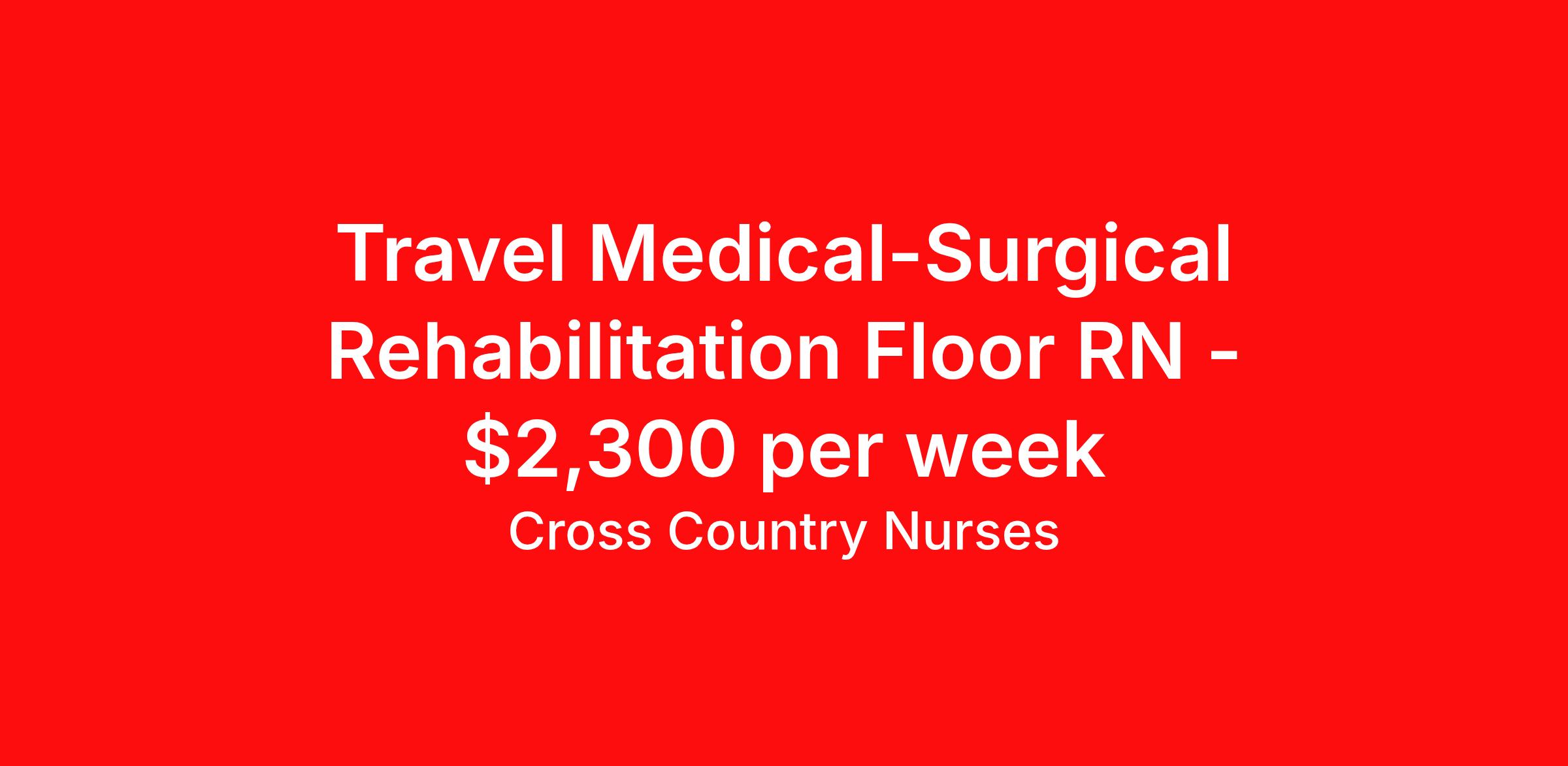 Cross Country Nurses is seeking a travel nurse RN Rehabilitation Med Surg for a travel nursing job in Peoria, Illinois. Job Description & Requirements Specialty: Rehabilitation Discipline: RN Start Date: 04/13/2026 Duration: 13 weeks 36 hours per week Shift: 12 hours, nights Employment Type: Travel Job Description As a medical/surgical nurse (RN M/S), you will extend bedside care to patients who are coping with illness, injury, or other medical or surgical circumstances. This includes assessing their condition, administering medication, changing dressings, monitoring vitals, and documenting in the patient charts. You're also responsible for providing continued support and education to patients, promoting their overall health and ensuring that they have the tools to adequately recuperate and prevent further health issues. Minimum Requirements At least 1 year of recent acute care experience in specialty Active RN license Benefits The benefits of taking a travel nursing job with Cross Country include: Private housing or generous housing allowance Comprehensive health insurance with prescription coverage Dependent health insurance with prescription coverage Competitive salaries Referral bonuses Travel reimbursement 401(k) retirement plan Direct deposit/free checking Unlimited free CE credits Cross Country Job ID 1236903. Pay package is based on 12 hour shifts and 36 hours per week (subject to confirmation) with tax-free stipend amount to be determined. Posted job title: Registered Nurse / Medical Surgical Rehabilitation Floor About Cross Country Nurses You care for others — we’re here to care for you. At Cross Country, we know travel nursing is about more than just the job. It’s about building a career that supports your lifestyle, your values, and your impact. We offer competitive pay, full benefits, and 24/7 support from a team that truly understands what it means to be on the front lines. Wherever your journey takes you, we’re with you every step of the way. Let’s build your best life — one assignment at a time. Benefits 401k retirement plan Referral bonus