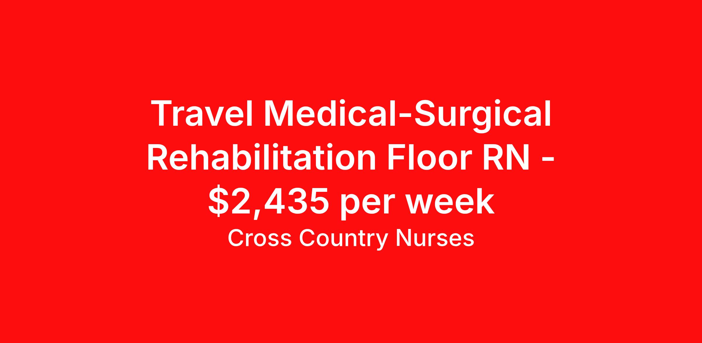 Cross Country Nurses is seeking a travel nurse RN Rehabilitation Med Surg for a travel nursing job in Albany, New York. Job Description & Requirements Specialty: Rehabilitation Discipline: RN Start Date: 03/23/2026 Duration: 13 weeks 36 hours per week Shift: 12 hours, nights Employment Type: Travel Job Description As a medical/surgical nurse (RN M/S), you will extend bedside care to patients who are coping with illness, injury, or other medical or surgical circumstances. This includes assessing their condition, administering medication, changing dressings, monitoring vitals, and documenting in the patient charts. You're also responsible for providing continued support and education to patients, promoting their overall health and ensuring that they have the tools to adequately recuperate and prevent further health issues. Minimum Requirements At least 1 year of recent acute care experience in specialty Active RN license Benefits The benefits of taking a travel nursing job with Cross Country include: Private housing or generous housing allowance Comprehensive health insurance with prescription coverage Dependent health insurance with prescription coverage Competitive salaries Referral bonuses Travel reimbursement 401(k) retirement plan Direct deposit/free checking Unlimited free CE credits Cross Country Job ID 1227604. Pay package is based on 12 hour shifts and 36 hours per week (subject to confirmation) with tax-free stipend amount to be determined. Posted job title: Registered Nurse / Medical Surgical Rehabilitation Floor About Cross Country Nurses You care for others — we’re here to care for you. At Cross Country, we know travel nursing is about more than just the job. It’s about building a career that supports your lifestyle, your values, and your impact. We offer competitive pay, full benefits, and 24/7 support from a team that truly understands what it means to be on the front lines. Wherever your journey takes you, we’re with you every step of the way. Let’s build your best life — one assignment at a time. Benefits 401k retirement plan Referral bonus
