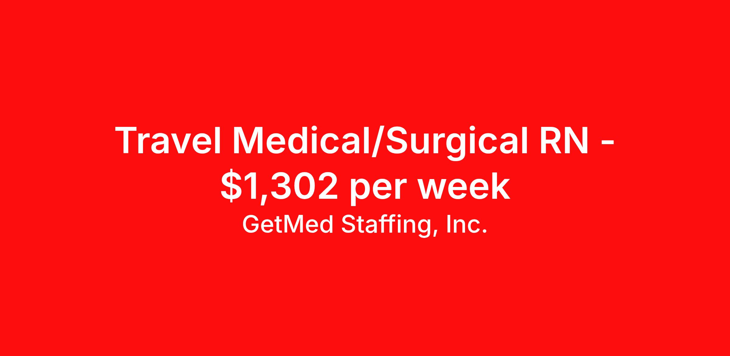 GetMed Staffing, Inc. is seeking a travel nurse RN Med Surg for a travel nursing job in Waco, Texas. Job Description & Requirements Specialty: Med Surg Discipline: RN Start Date: 04/05/2026 Duration: 13 weeks 36 hours per week Shift: 12 hours, nights Employment Type: Travel GetMed Staffing is searching for a strong MedSurg RN to assist our traveler-friendly client. A minimum of 1-2 years of experience is required. Traveling with GetMed Staffing offers the unique opportunity to gain diverse experiences, both personally and professionally. Gain experience that matters. GetMed Staffing, Inc. Job ID 36054218. Pay package is based on 12 hour shifts and 36.0 hours per week (subject to confirmation) with tax-free stipend amount to be determined. Posted job title: RN:MedSurg,19:00:00-07:00:00 About GetMed Staffing, Inc. We are a diversity owned company, specializing in healthcare recruiting services. We truly understand how important a healthcare travelers' relationship is with their recruiter, as well as our relationship is with our healthcare facilities. We recognize that the needs of our healthcare travelers can vary, and therefore we provide the personalized touch necessary to ensure a successful travel assignment each and every time. Our healthcare facilities and clients benefit from us putting our healthcare travelers first. GetMed Staffing is excited to be a leader within the industry by focusing on providing healthcare travelers with more choices and possibilities as they plan for their next healthcare travel assignment. Benefits Life insurance Medical benefits Dental benefits Vision benefits 401k retirement plan