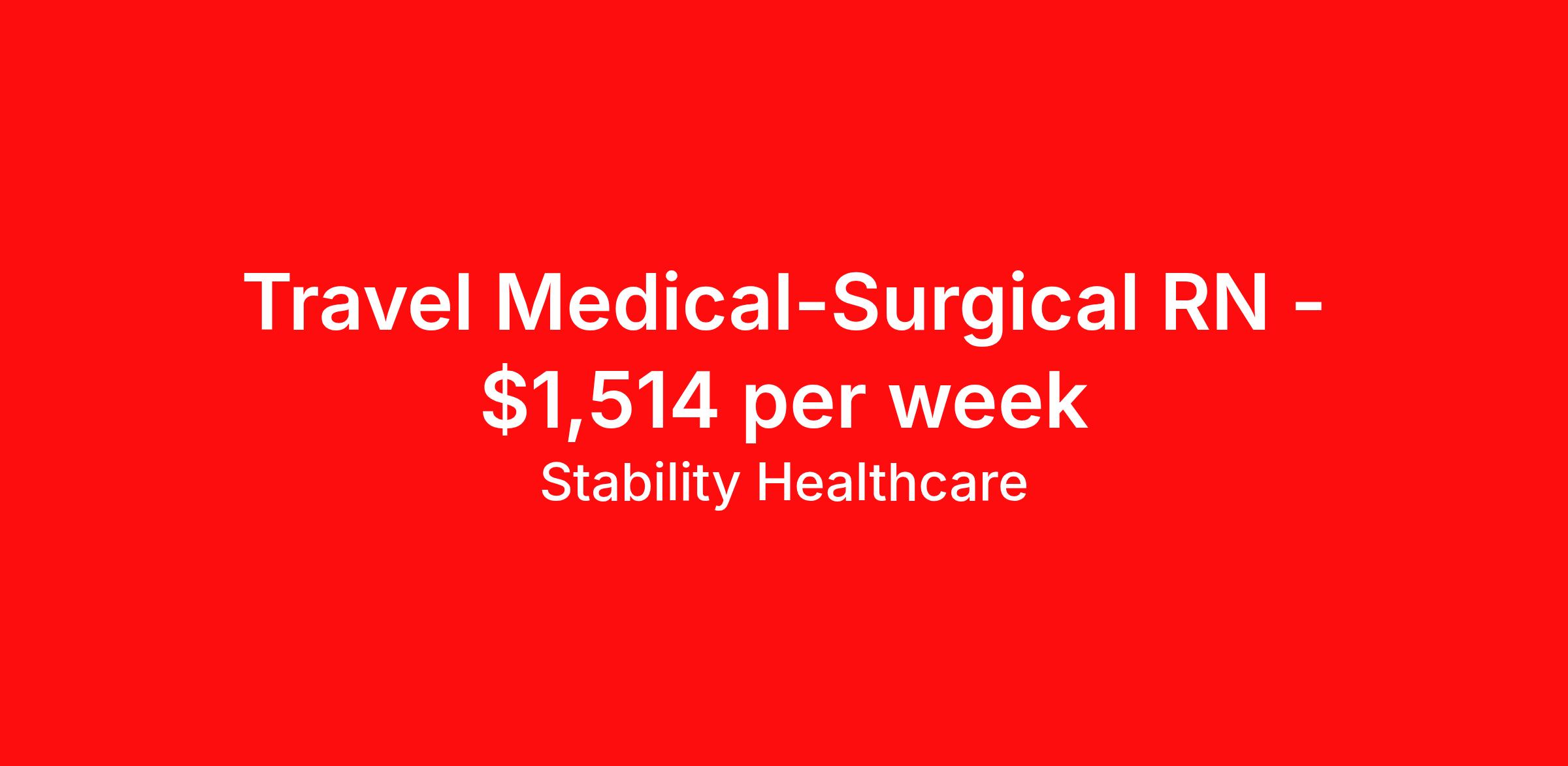 Stability Healthcare is seeking a travel nurse RN Med Surg for a travel nursing job in Tulsa, Oklahoma. Job Description & Requirements Specialty: Med Surg Discipline: RN Duration: 13 weeks 36 hours per week Shift: 12 hours, nights Employment Type: Travel Stability Healthcare is looking for a Med-Surg RN contract position in Tulsa, OK. The majority of hospitalized patients are admitted to M/S either directly or after surgery. M/S is also where patients who have been in critical care (ICU) are transferred when they no longer need critical care but still require nursing care. *$600 travel bonus *Day 1 health insurance with United Healthcare *PTO plan start accruing on day 1, use during contract or cash out at the end! *Guaranteed stipend if facility calls you off *Extra hour bonus earn an additional hourly bonus for working over your weekly contracted hours Stability Job ID 826803. Pay package is based on 12 hour shifts and 36 hours per week (subject to confirmation) with tax-free stipend amount to be determined. Posted job title: Med-Surg About Stability Healthcare Stability Healthcare was founded in 2009, with the mission of becoming the best Travel Nursing Agency in California. We have been rated one of the top travel nursing agencies and offer our nurses the highest paying travel nursing jobs available. We have access to the best travel assignments from 1000’s of facilities. You can start the year off in sunny California, spend the Spring in the Colorado Rockies, enjoy the Summer in the Mid-West, experience the change of seasons in Boston and New York, and hit the beaches of Florida in the winter. Our Nurses work in the best hospitals and health systems in the country. Benefits Guaranteed Hours Benefits start day 1