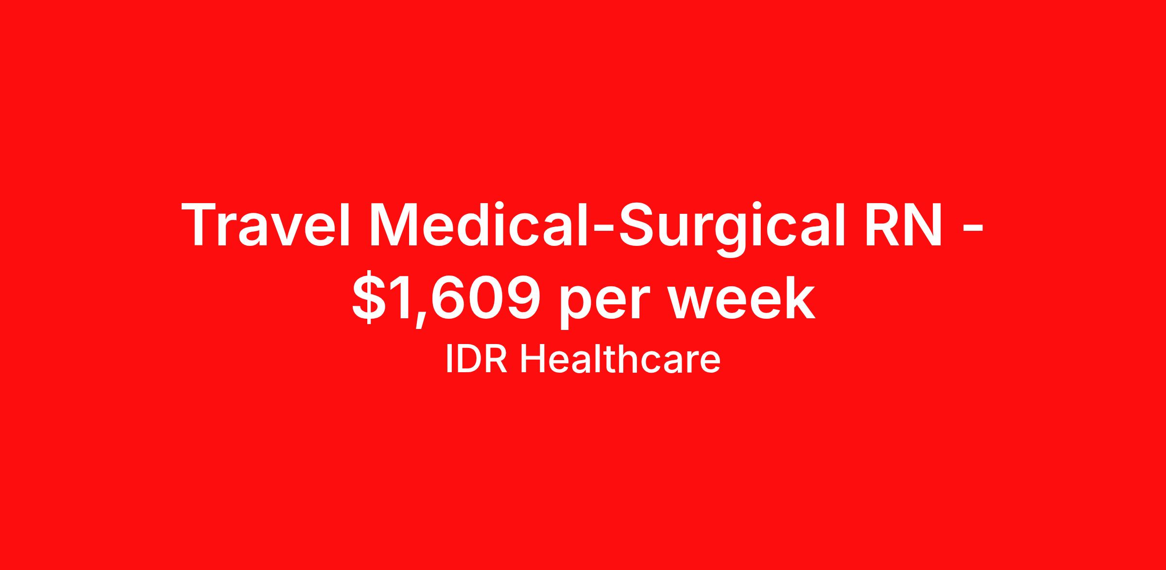 IDR Healthcare is seeking a travel nurse RN Med Surg for a travel nursing job in Charleston, South Carolina. Job Description & Requirements Specialty: Med Surg Discipline: RN Start Date: 04/13/2026 Duration: 13 weeks 36 hours per week Shift: 12 hours, nights Employment Type: Travel IDR Healthcare is an awarding winning staffing firm that believes it is a privilege and awesome responsibility to serve those who selflessly care for others. Our mission is to empower healthcare professionals to achieve their fullest potential both personally and professionally while they create positive change within the healthcare community. We exercise true grit, tenacity, and authenticity while embracing and ownership mindset to go above and beyond providing healthcare professionals a world class experience. We are employee owned and our travelers and clinicians earn shares/equity by just completing multiple assignments! We have been named SIA’s Fastest Growing Staffing Firms and have won ClearlyRated® Best of Staffing for 11 consecutive years! This cements our commitment to clinician satisfaction earning top net promoter scores putting us in the top 2% of agencies in North America! TravelFarWithIDR and see what an extraordinary experience is all about! Benefits 2024 World Staffing Best Staffing Firms to Work For! ESOP (Equity) Healthcare Benefits for up to 30 days Between Assignments Comprehensive Health Insurance Dental and Vision Insurance Sign-On, Completion, & Referral Bonus Programs License and Certification Reimbursement Weekly Pay and Competitive Compensation Large Network of Clients and Job Opportunities 401k retirement plan Exclusive Assignments IDR Job ID 497751. Pay package is based on 12 hour shifts and 36 hours per week (subject to confirmation) with tax-free stipend amount to be determined. About IDR Healthcare IDR Healthcare is an awarding winning staffing firm that believes it is a privilege and awesome responsibility to serve those who selflessly care for others. Our mission is to empower healthcare professionals to achieve their fullest potential both personally and professionally while they create positive change within the healthcare community. We exercise true grit, tenacity, and authenticity while embracing and ownership mindset to go above and beyond providing healthcare professionals a world class experience. We are employee owned and our travelers and clinicians earn shares/equity by just completing multiple assignments! We have been named SIA’s Fastest Growing Staffing Firms and have won ClearlyRated® Best of Staffing for 11 consecutive years! This cements our commitment to clinician satisfaction earning top net promoter scores putting us in the top 2% of agencies in North America! Help us give back! For every booked assignment, proceeds are donated to St. Jude and Feeding America! Last year we raised over $18,000 for St. Jude and provided over 49,000 meals for children in need. TravelFarWithIDR and see what it is all about! Benefits Weekly pay 401k retirement plan Referral bonus Medical benefits Dental benefits License and certification reimbursement Vision benefits