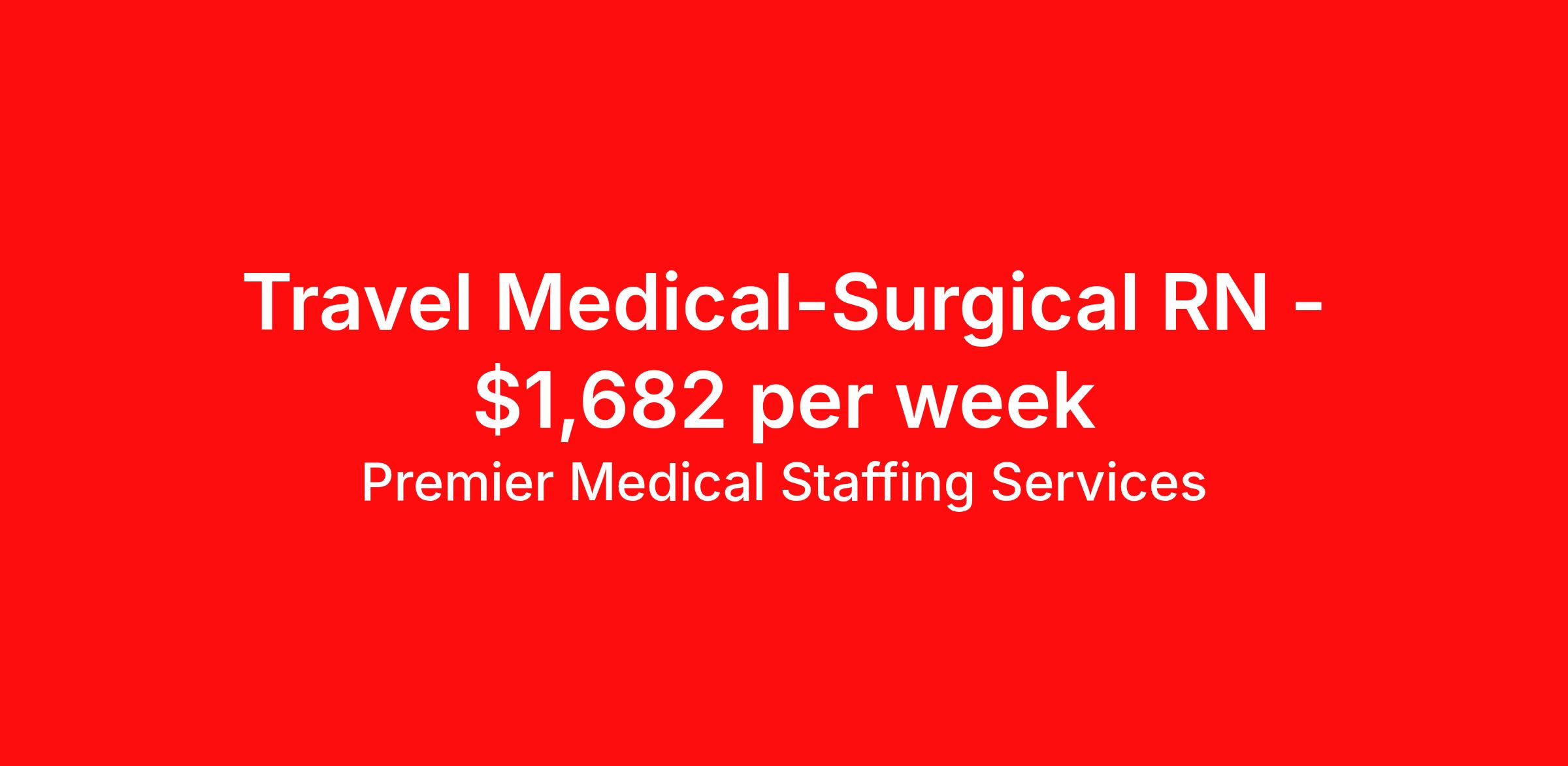 Premier Medical Staffing Services is seeking a travel nurse RN Med Surg for a travel nursing job in Charleston, South Carolina. Job Description & Requirements Specialty: Med Surg Discipline: RN Start Date: 04/13/2026 Duration: 13 weeks 36 hours per week Shift: 12 hours Employment Type: Travel Premier Medical Staffing Job ID 626466. Pay package is based on 12 hour shifts and 36 hours per week (subject to confirmation) with tax-free stipend amount to be determined. Posted job title: RN Med/Surg About Premier Medical Staffing Services Premier Medical Staffing Services, LLC is a nationally expanding healthcare staffing firm for healthcare professionals and companies. We understand our clients’ need for highly qualified, expertly trained medical professionals and are passionate about helping clinicians find employment opportunities that fit their personality and needs. Able to accommodate the ever-changing needs of the healthcare landscape, we offer per-diem, contract and direct hire placements to support the unique needs of each industry sector. Premier Medical Staffing Services is Joint Commission Certified, a Military Spouse Employment Partner and is certified as a Women’s Business Enterprise. We are proudly nurse owned.