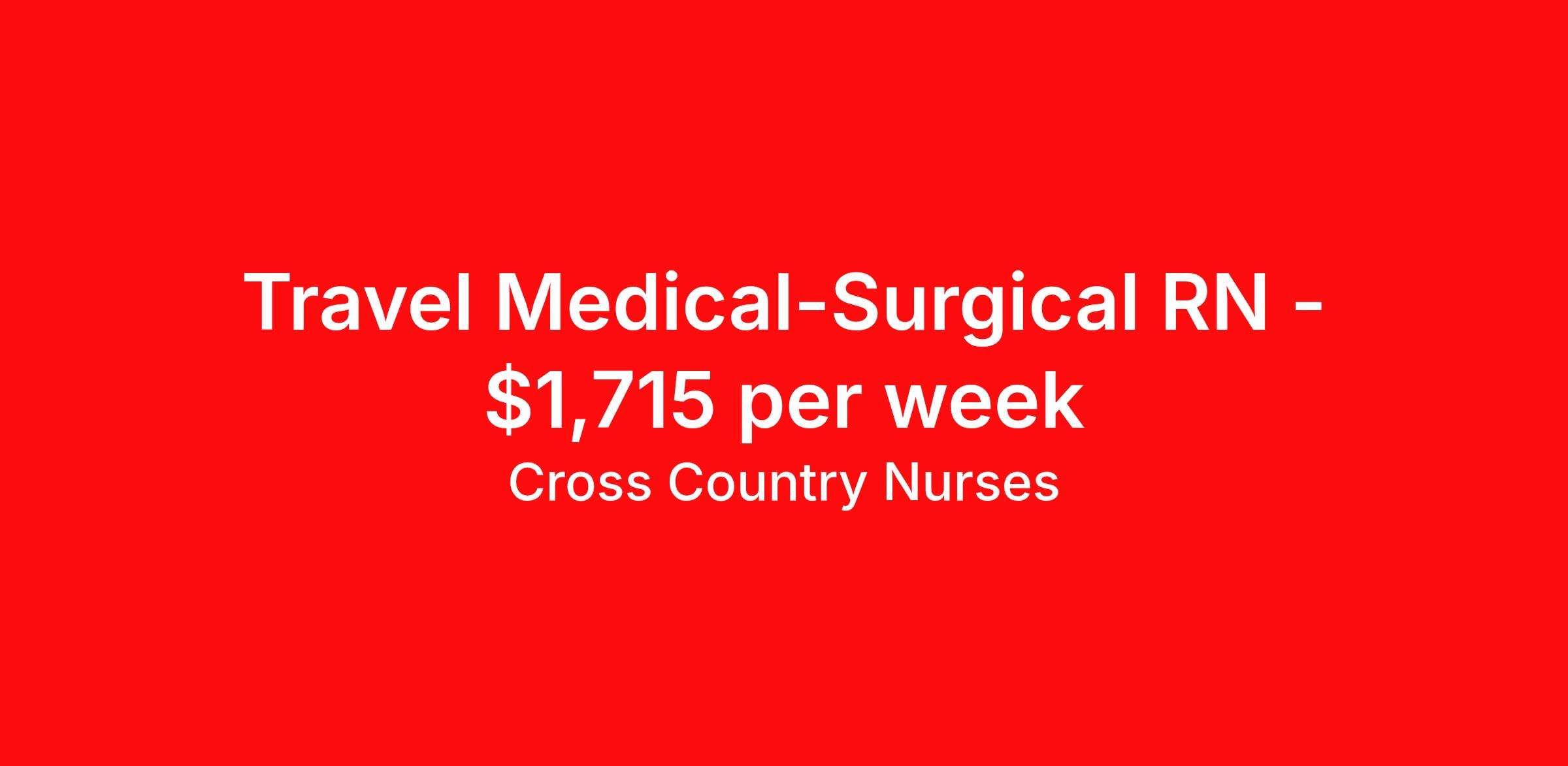 Cross Country Nurses is seeking a travel nurse RN Med Surg for a travel nursing job in Opelika, Alabama. Job Description & Requirements Specialty: Med Surg Discipline: RN Start Date: 04/06/2026 Duration: 13 weeks 36 hours per week Shift: 12 hours, nights Employment Type: Travel Job Description As a medical/surgical nurse (RN M/S), you will extend bedside care to patients who are coping with illness, injury, or other medical or surgical circumstances. This includes assessing their condition, administering medication, changing dressings, monitoring vitals, and documenting in the patient charts. You're also responsible for providing continued support and education to patients, promoting their overall health and ensuring that they have the tools to adequately recuperate and prevent further health issues. Minimum Requirements At least 1 year of recent acute care experience in specialty Active RN license Benefits The benefits of taking a travel nursing job with Cross Country include: Private housing or generous housing allowance Comprehensive health insurance with prescription coverage Dependent health insurance with prescription coverage Competitive salaries Referral bonuses Travel reimbursement 401(k) retirement plan Direct deposit/free checking Unlimited free CE credits Cross Country Job ID 1231164. Pay package is based on 12 hour shifts and 36 hours per week (subject to confirmation) with tax-free stipend amount to be determined. Posted job title: Registered Nurse / Medical Surgical Floor About Cross Country Nurses You care for others — we’re here to care for you. At Cross Country, we know travel nursing is about more than just the job. It’s about building a career that supports your lifestyle, your values, and your impact. We offer competitive pay, full benefits, and 24/7 support from a team that truly understands what it means to be on the front lines. Wherever your journey takes you, we’re with you every step of the way. Let’s build your best life — one assignment at a time. Benefits 401k retirement plan Referral bonus