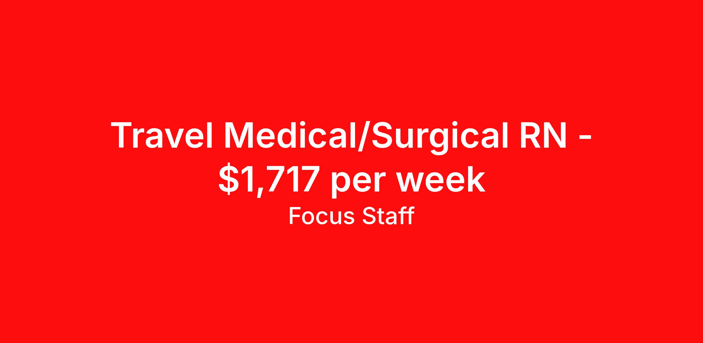 Focus Staff is seeking a travel nurse RN Med Surg for a travel nursing job in Tulsa, Oklahoma. Job Description & Requirements Specialty: Med Surg Discipline: RN Start Date: 04/12/2026 Duration: 13 weeks 36 hours per week Shift: 12 hours, nights Employment Type: Travel Want to be a crucial part of the care continuum? Join the Focus Staff team as a travel Medical/Surgical Nurse (Med/Surg RN) for a rewarding travel contract in Tulsa, OK. Your daily work will directly contribute to optimal patient outcomes by providing meticulous care and compassionate support to individuals on their path to wellness. Contract Length: 13 Weeks Start Date: 04/12/2026 Shift: 3x12 Nights Ready to advance your career while seeing the country? Focus Staff provides the benefits and support you need to thrive on every assignment: Comprehensive Benefits : Get paid fast with weekly direct deposits and save for your future with our 401(k) matching and generous bonuses. Instant Peace of Mind : We provide immediate protection with day one medical, dental, vision, and life insurance and no waiting period. Travel with Confidence : Our team handles the details. We offer licensure reimbursement, relocation support, and exclusive discounts to make your next move effortless. Tailored to You : A dedicated recruiter is always available to provide 24/7 support and flexible scheduling options, including pet-friendly housing. Med/Surg RN Requirements: Minimum of 1-2 years of experience Valid OK RN License Current Basic Life Support (BLS) and Advanced Cardiac Life Support (ACLS) certification Must be eligible to work in the United States About Focus Staff: Focus Staff is a traveler-first healthcare staffing agency connecting talented travel nurses and allied health professionals with top assignments nationwide, prioritizing your unique needs and giving you complete control over your journey. Our mission is to help you create the life you love while exploring the country, advancing your healthcare career with competitive pay, and doing what you do best, providing exceptional patient care that makes a difference. Interested in becoming a traveler with Focus Staff? Discover why travelers choose us, apply today! Other Information: Job Title: Travel Med/Surg Nurse RN Employment Time: Contract/Travel Date Posted: 02/10/2026 01:26:04 PM Valid Through: 07/11/2026 Job City: Tulsa Job State: OK Job Country: USA Shift: 3x12 Nights Job ID: a0xVt00000I1GbTIAV Hiring Organization: Focus Staff Focus Staff is an EEO/AA (Equal Employment Opportunity and Affirmative Action) Employer. *Estimated pay package based on bill rate at time job was posted. Bill rates can change frequently and without notice. Exact pay package may vary based on several factors, including, but not limited to, guaranteed hours, travel distance, demand, experience, etc. Focus Staff Job ID a0xVt00000I1GbTIAV. Pay package is based on 12 hour shifts and 36 hours per week (subject to confirmation) with tax-free stipend amount to be determined. Posted job title: Travel M/S RN - Med/Surg Registered Nurse About Focus Staff Your Journey, Our Focus. Travel Confidently, Care Boldly with Focus Staff. At Focus Staff, we’re here to make your travel healthcare career rewarding, seamless, and stress-free. Whether you’re a travel nurse, therapist, or allied health professional, we take care of the details so you can focus on what you do best — caring for others. Our mission is simple: to help healthcare heroes like you thrive, no matter where your journey takes you. With thousands of job opportunities across all 50 states, our dedicated recruiters work closely with you to match you to the right assignment, based on what matters most to you — pay, location, benefits, or career growth. From day one, you’ll enjoy premium benefits like medical coverage that bridges between assignments, 401K matching, travel and licensing reimbursements, and personalized housing support. Plus, our team is here for you 24/7, with clinical support available whenever you need guidance or backup. At Focus Staff, we believe in making every assignment a smooth, comfortable, and empowering experience. Let’s make your next adventure your best one yet.