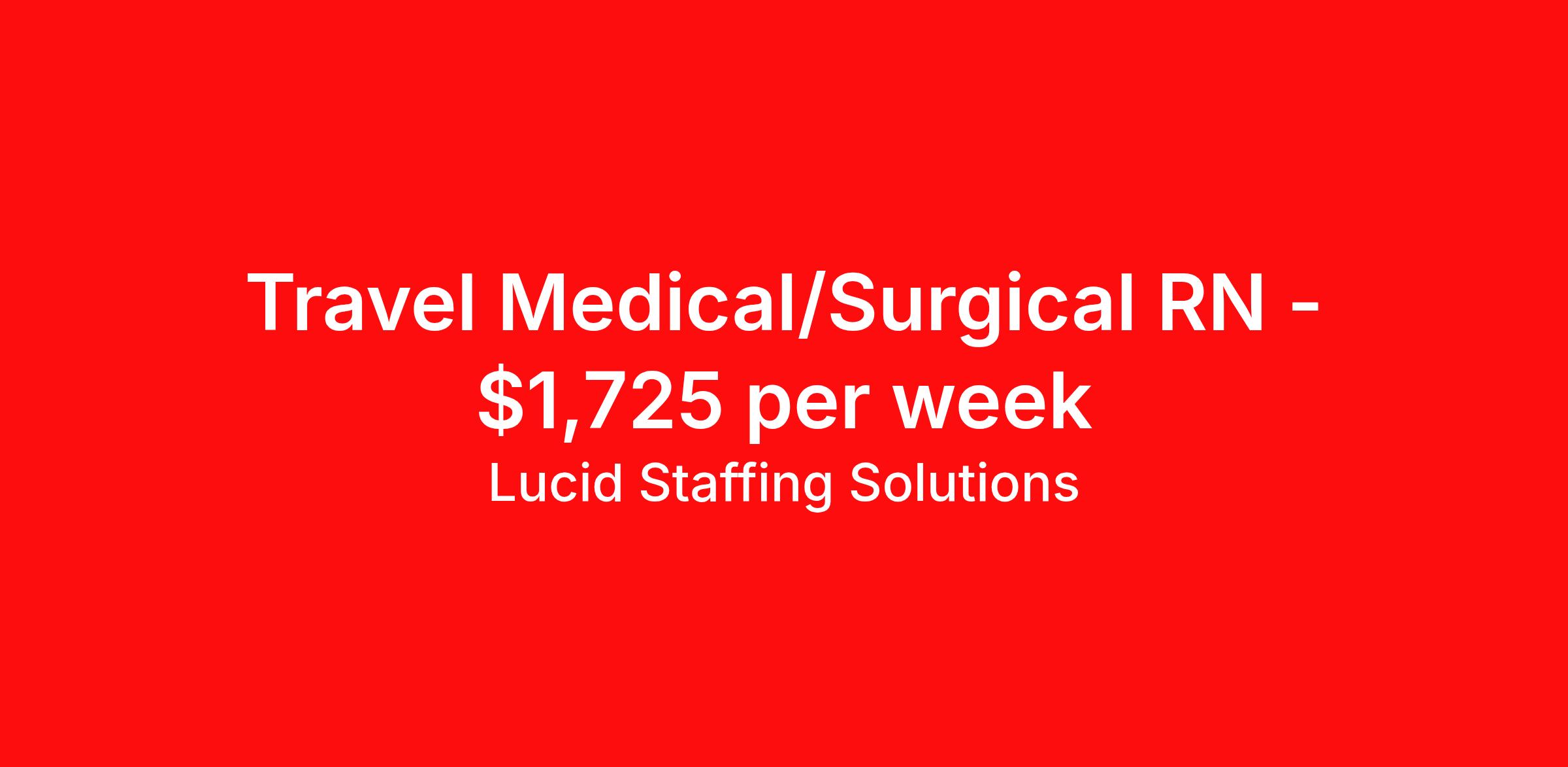 Lucid Staffing Solutions is seeking a travel nurse RN Med Surg for a travel nursing job in Cleveland, Ohio. Job Description & Requirements Specialty: Med Surg Discipline: RN Duration: 13 weeks 36 hours per week Shift: 12 hours, days Employment Type: Travel Job Description Position: Travel Registered Nurse (RN) with experience in MS Location: Cleveland, Ohio Shift: hr Day Weekly Gross: $1725.04 Lucid Staffing Solutions was created by former healthcare workers who lived the short staffing, the chaotic workflows, and the nonstop pressure that comes with patient care. We built an agency powered by real clinical experience, kept simple and supportive, so you never have to guess whether the people guiding you actually know what they’re talking about. Minimum Requirements: Active license as a Registered Nurse (RN) Licensed in Ohio (If applicable) or compact eligible Two years of recent MS experience Active BLS Why Lucid Works for Travelers Paid Weekly: Stipends pushed to GSA limits whenever possible $500 Travel Reimbursement: Paid at the start of each assignment Clinician-Led Team: Recruiters and Account Managers with real clinical experience In-House Compliance: fast updates, real communication, and none of the delays that come with outsourced vendors. Health Coverage Options: Multiple medical plans plus dental, vision, and workers compensation 401(k) Match: 4 percent match after 6 months License & Certification Reimbursement: We help cover the cost of staying compliant Liability Insurance: Included automatically Referral Bonuses: $500 per referral, $750 after five referrals Ready to start your journey? Apply today to connect with a Clinician-Recruiter! Lucid Staffing Solutions Job ID 36803. Pay package is based on 12 hour shifts and 36 hours per week (subject to confirmation) with tax-free stipend amount to be determined. Posted job title: MS About Lucid Staffing Solutions Clinician Owned & Operated At Lucid Staffing Solutions, we do things differently—because we’ve been in your shoes. Founded by actual healthcare professionals, Lucid was built to fix the issues we experienced as travelers. We know what makes a great assignment: competitive pay, seamless onboarding, honest recruiters, and most importantly—working with a team that truly sees and supports you. Our entire team is made up of former clinicians who understand the demands of the job and what travelers truly need to succeed. We offer some of the highest paying allied health and nursing contracts across the country, along with some amazing benefits & perks. Whether you're chasing freedom, flexible schedules, bigger paychecks, or your next adventure, Lucid helps you get there—with real support, real respect , and real healthcare experts. Benefits Dental benefits Medical benefits Vision benefits