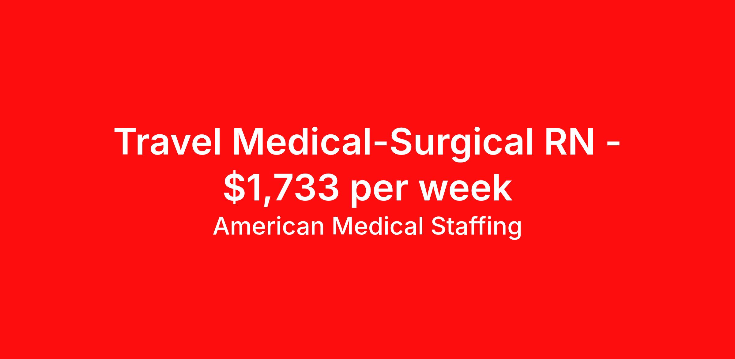 American Medical Staffing is seeking a travel nurse RN Med Surg for a travel nursing job in Cullison, Kansas. Job Description & Requirements Specialty: Med Surg Discipline: RN Start Date: 04/06/2026 Duration: 13 weeks 36 hours per week Shift: 12 hours, nights Employment Type: Travel We’re living in the new normal. Lives and careers look different today. So why shouldn’t you have a role that delivers excitement, fewer restrictions, and brings you closer to loved ones? At American Medical Staffing (AMS), we believe in supporting the pioneers who embody the sense of adventure each new placement brings and we’re looking for a RN: MedSurg for our Hospital contract assignment. Job Title : RN: MedSurg Location : Cullison, Kansas Pay Range : Competitive, Negotiable, with Weekly Pay Schedule : 12-Hour Nights, 19:00:00-07:00:00, 12.00-3 Contract Length : 13 Weeks Requirements : · 2 years of experience as a RN · Qualified applicants MUST have at least 2 years of experience in the MedSurg · Valid RN license · Be willing to obtain Kansas licensure Why Choose American Medical Staffing? · Day-One Benefits : Medical, dental, and vision plans with no waiting period. · Wellness PTO : Build 1 or 2 weeks of paid time off into your contract. · Hotel Discounts : Save up to 60% on hotel bookings with access to 700,000 discounted properties. · Loyalty Program : Earn financial incentives automatically based on hours worked and assignment type. · Referral Program : $500 for you and $500 for each referral after 450 hours—no limits. · Working Advantage : Access exclusive discounts on retail, entertainment, and travel. · Scrub Discount : 20% off all scrubs through our customized AMS store. · Retirement Plans : 401(k) options to help you plan for the future. · Compliance & Credentialing Support : Let us handle the logistics so you can focus on patient care. Responsibilities · Deliver specialized care to patients across a variety of acute and subacute units. · Work closely with a multidisciplinary team of healthcare professionals to provide comprehensive and compassionate care. · Monitor patient conditions, administer treatments and document outcomes. · Advocate for the best possible patient experience while supporting recovery, safety, and continuity of care. Apply now to take the next step in your journey. American Medical Staffing is an Equal Employment Opportunity Employer and does not discriminate on the basis of race, color, religion, sex, national origin, sexual orientation, gender identity, disability, age, or any other non-merit factor. American Medical Staffing Job ID 109562. Pay package is based on 12 hour shifts and 36.0 hours per week (subject to confirmation) with tax-free stipend amount to be determined. Posted job title: RN:MedSurg,19:00:00-07:00:00 About American Medical Staffing American Medical Staffing is a staffing agency headquartered in Baltimore, MD. Our goal is to CREATE an extraordinary experience for our health care professionals. Our roots are nurse owned and operated so we know what clinicians want - lots of options, a smooth and informed placement process, competitive and accurate pay, great customer service and responsiveness to requests, and advocacy when there is an issue. When AMS was founded in 2001, we started our company with a mission to be a better agency than our competitors. We have always put a heavy emphasis into what is best for our employees, not necessarily just our clients or our company. You are not an expense as you may be to a hospital; you are an asset. We take employee advocacy seriously; you are not just a number to us. The end result is that you don`t work for us; we work for you. Since starting in Baltimore, MD, we continue to grow throughout the country. Check out our industry leading reviews on Google and Indeed to see how much our clinicians enjoy working with us! · Benefits: AMS offers an array of benefits for any employee working 30 hours or more! Those eligible employees who choose to participate will pay the premiums with deductions from their pre-tax earnings. We offer a complete benefits package including Health Insurance, 401K with up to 2% match, Life, Vision, and Dental. From health and wellness support, financial or legal needs, or help with life's everyday challenges, our Employee Assistance Program provides you with resources, services and discounts to help you manage your unique concerns and save time, energy and money. We also offer additional Employee Perks that you can enjoy as an AMS employee: Scrubin – Uniform Discounts Working Advantage – unlimited access to thousands of exclusive discounts and special offers nationwide for theme parks, shows, tours, attractions, sports, concerts, hotels, rental cars, retail gift cards, movie tickets and much more Hotel Engine - Save up to 60% when booking hotel rooms, with access to more than 700,000 deeply discounted hotels worldwide. Discounted Pet Insurance Wellness Program, including fitness, nutrition and financial wellness Betterhelp - 1 month of free therapy, followed by a discounted rate for our Healthcare Professionals and their family members. Win Win Referral Bonus - $500 for you, and $500 for them! Benefits 401k retirement plan Life insurance Medical benefits Dental benefits Vision benefits
