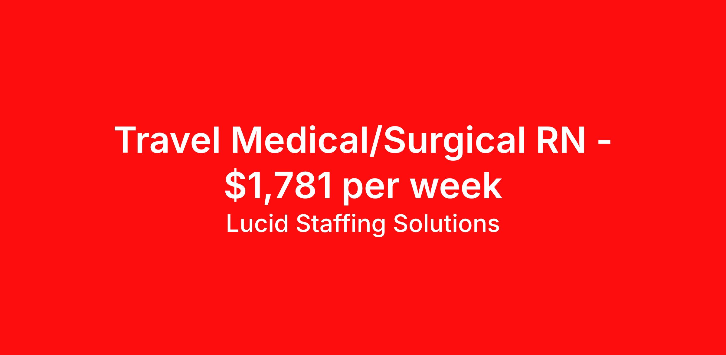 Lucid Staffing Solutions is seeking a travel nurse RN Med Surg for a travel nursing job in Tulsa, Oklahoma. Job Description & Requirements Specialty: Med Surg Discipline: RN Duration: 13 weeks 36 hours per week Shift: 12 hours, nights Employment Type: Travel Job Description Position: Travel Registered Nurse (RN) with experience in OR Location: Tulsa, Oklahoma Shift: hr Night Weekly Gross: $1781.31 Lucid Staffing Solutions was created by former healthcare workers who lived the short staffing, the chaotic workflows, and the nonstop pressure that comes with patient care. We built an agency powered by real clinical experience, kept simple and supportive, so you never have to guess whether the people guiding you actually know what they’re talking about. Minimum Requirements: Active license as a Registered Nurse (RN) Licensed in Oklahoma (If applicable) or compact eligible Two years of recent OR experience Active BLS Why Lucid Works for Travelers Paid Weekly: Stipends pushed to GSA limits whenever possible $500 Travel Reimbursement: Paid at the start of each assignment Clinician-Led Team: Recruiters and Account Managers with real clinical experience In-House Compliance: fast updates, real communication, and none of the delays that come with outsourced vendors. Health Coverage Options: Multiple medical plans plus dental, vision, and workers compensation 401(k) Match: 4 percent match after 6 months License & Certification Reimbursement: We help cover the cost of staying compliant Liability Insurance: Included automatically Referral Bonuses: $500 per referral, $750 after five referrals Ready to start your journey? Apply today to connect with a Clinician-Recruiter! Lucid Staffing Solutions Job ID 36364. Pay package is based on 12 hour shifts and 36 hours per week (subject to confirmation) with tax-free stipend amount to be determined. Posted job title: MS About Lucid Staffing Solutions Clinician Owned & Operated At Lucid Staffing Solutions, we do things differently—because we’ve been in your shoes. Founded by actual healthcare professionals, Lucid was built to fix the issues we experienced as travelers. We know what makes a great assignment: competitive pay, seamless onboarding, honest recruiters, and most importantly—working with a team that truly sees and supports you. Our entire team is made up of former clinicians who understand the demands of the job and what travelers truly need to succeed. We offer some of the highest paying allied health and nursing contracts across the country, along with some amazing benefits & perks. Whether you're chasing freedom, flexible schedules, bigger paychecks, or your next adventure, Lucid helps you get there—with real support, real respect , and real healthcare experts. Benefits Dental benefits Medical benefits Vision benefits