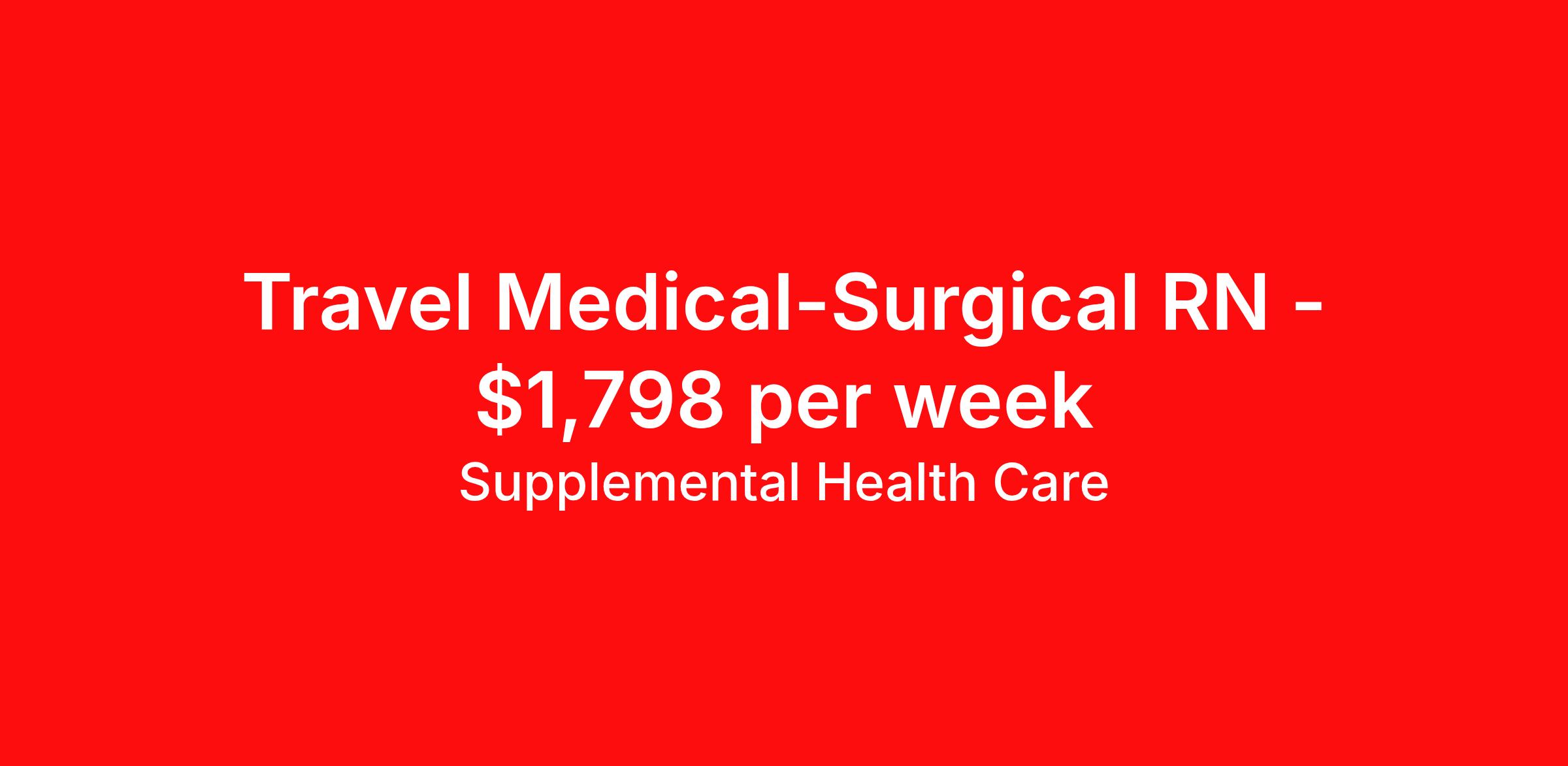 Supplemental Health Care is seeking a travel nurse RN Med Surg for a travel nursing job in Sylva, North Carolina. Job Description & Requirements Specialty: Med Surg Discipline: RN Start Date: ASAP Duration: 13 weeks 36 hours per week Shift: 12 hours, days Employment Type: Travel Job Description: Supplemental Health Care is hiring Medical Surgical Registered Nurses for contract assignments at partnering hospitals in Sylva, North Carolina. Whether you’re looking to travel or stay local, we’re committed to helping Med Surg RNs find the right fit with top hospitals across the country. With more than 40 years of experience in healthcare staffing, Supplemental Health Care offers reliable support, competitive pay, and great benefits every step of the way. Qualifications: Current RN License in North Carolina or Compact RN License where applicable American Heart Association BLS 1 to 2 years of recent Medical - Surgical nursing experience Tele course preferred Med Surg RN Contract Details: $1,638 - $1,798 per week* AM shift available 13-week contract with possibility to extend Consult and coordinate with facility health care team members to assess, plan, implement and evaluate patient care plans Administer and record prescribed medications Report adverse reactions to medications or treatments *Estimated weekly payment may include both taxable wages and tax-free reimbursements for meals, housing, and incidentals. Please speak with a recruiter for details. Apply today to get started with this Medical Surgical RN contract opportunity, or talk to our team about the full range of Registered Nurse opportunities available. What We Offer: Full medical, dental, vision, life, and even pet insurance! Round the clock support. No matter where you are or what time it is, Supplemental Health Care is standing by. SHC's Share the Care referral program is the most dynamic, profitable referral program in the industry. 401(k) Retirement Savings Program with a wide range of investment options. Discounted and free online access to CEU courses through Supplemental University. Supplemental Health Care is an Equal Opportunity Employer. All candidates, including veterans and those with disabilities, are encouraged to apply. SHC will consider for employment qualified applicants with criminal histories in a manner consistent with the requirements of applicable local, state, or federal law. To learn more, visit www.shccares.com/eeo Supplemental Health Care Job ID 1471203. Pay package is based on 12 hour shifts and 36 hours per week (subject to confirmation) with tax-free stipend amount to be determined. Posted job title: Med Surg Registered Nurse - RN About Supplemental Health Care At Supplemental Health Care, a simple belief in the power of caring guides a unique commitment to world-class service in healthcare staffing. For 40 years, we’ve supported talented professionals pursuing their life calling in hospitals, schools, home health, corrections, behavioral health, and other settings. At SHC, we inspire vital connections and enrich lives and inspire better outcomes. As recipients of the Best in Staffing Awards for both Client and Talent, Supplemental Health Care is proud to be among only 2% of staffing companies singled out for the distinction based on the real feedback of our employees and the clients we serve. SHC has also earned The Joint Commission’s Gold Seal of Approval and is named among the Largest Health Care Staffing companies in the United States by Staffing Industry Analysts. We are also thrilled to recognize our very own SLP, Dr. Kelly Byrd as the American Staffing Association 2024 National Staffing Employee of the Year and Health Care Sector All-Star. We’re honored to connect Dr. Byrd to employment, share her incredible story, and support her family literacy nonprofit. For everyone that we serve, SHC is the place where caring hearts thrive. Benefits Referral bonus Benefits start day 1 401k retirement plan Continuing Education Discount program Health savings account