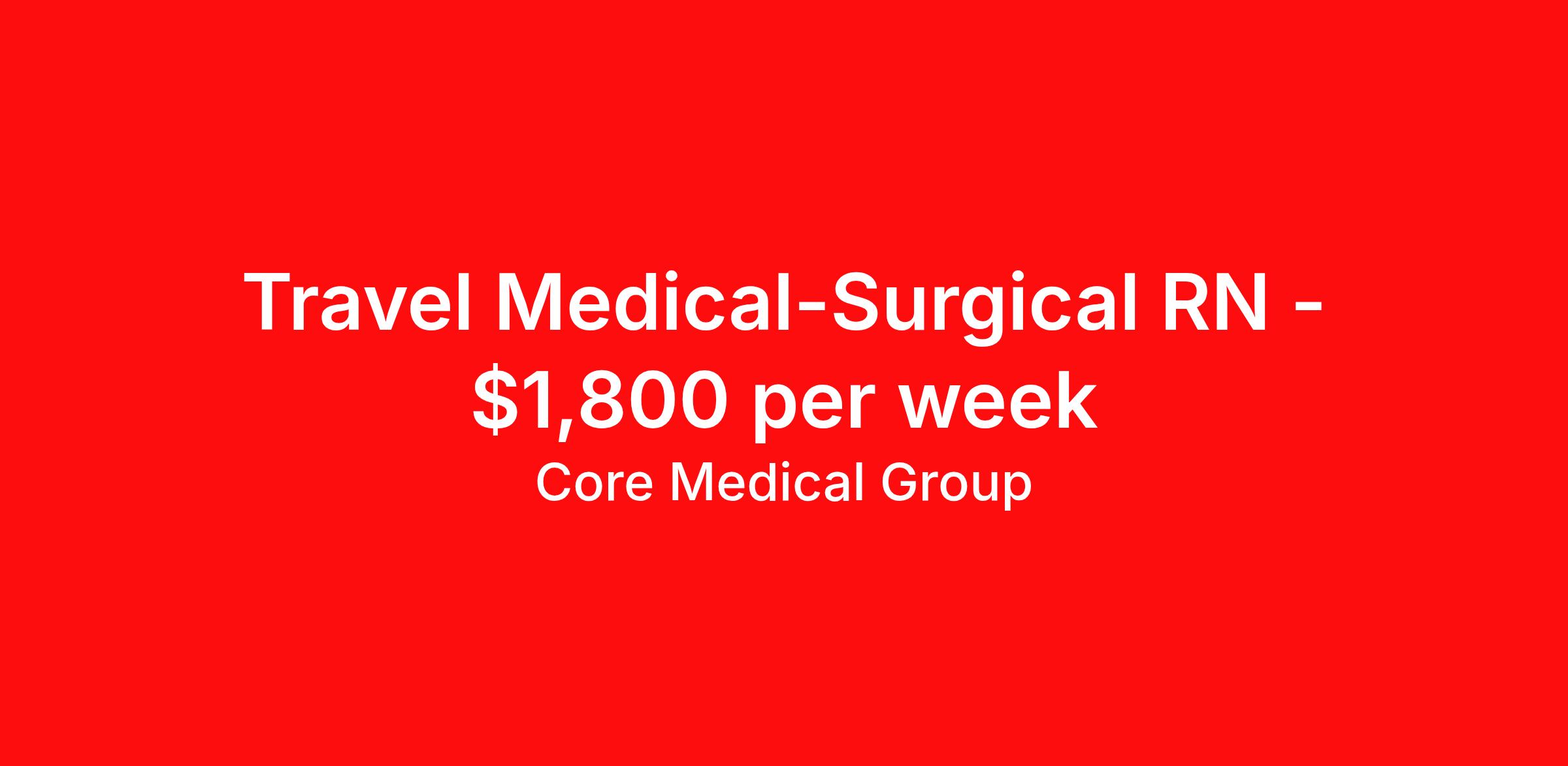Core Medical Group is seeking a travel nurse RN Med Surg for a travel nursing job in Vicksburg, Mississippi. Job Description & Requirements Specialty: Med Surg Discipline: RN Start Date: ASAP Duration: 13 weeks 36 hours per week Shift: 12 hours Employment Type: Travel Client in MS seeking Registered Nurse: Med/Surg for the following shift(s): Nights We are looking for a healthcare professional who is ready to provide exceptional patient care in this contract/travel role. Contract/travel assignments are typically 13 weeks, with potential to extend. Help us continue our mission to connect people, improve lives, and give back to the community by joining the CoreMedical Group team. When you work with CoreMedical Group, we put you first and treat you like family, supporting you every step of the way. CoreMedical Group is one of the largest healthcare staffing agencies in the country, with travel and contract positions located across the United States. Our recruiters will help you find the perfect job, whether it's across the country or across the street. In addition to dedicated, personalized support from your recruiter, when you work with CoreMedical Group you'll receive: Access to an extensive benefits package, including day 1 health, dental, and vision insurance, employer paid life insurance, a health reimbursement account, and more! Weekly paychecks with competitive pay packages Matching 401(k) benefits to help you save for retirement Licensure assistance and reimbursement to set you up for success on your contract Travel reimbursement and dedicated housing support while on assignment Referral cash bonuses when you connect us with other clinicians CoreMedical Group also offers you a free, all-inclusive vacation each year as our way of saying "thank you" for your hard work. Join other healthcare professionals on the annual Club CoreMed retreat and you'll see why our contract and travel professionals come back to us year after year! Your career is too valuable to tackle on your own. Let CoreMedical Group help you with your healthcare journey! *Estimate of weekly payments is intended for informational purposes and includes hourly wages, as well as reimbursements for meal & incidental expenses, and housing expenses incurred on behalf of the Company. Any benefits (medical/dental/vision) are in addition to the weekly pay. Please speak with your Recruiter for additional details. Estimated payments are subject to change until formal offer of assignment is made and accepted. Core Medical Group Job ID 1360129. Pay package is based on 12 hour shifts and 36 hours per week (subject to confirmation) with tax-free stipend amount to be determined. Posted job title: RN About Core Medical Group CoreMedical Group is one of the largest healthcare staffing agencies in the country. We have jobs nationwide in travel nursing, travel allied health, interim, locum tenens, and permanent placements! Join the staffing agency with Club CoreMed, the best perk in the industry - an all inclusive paid trip to a tropical resort! Benefits Weekly pay Holiday Pay Guaranteed Hours Continuing Education 401k retirement plan Pet insurance Company provided housing options Sick pay Wellness and fitness programs Mileage reimbursement Referral bonus Employee assistance programs Medical benefits Dental benefits Vision benefits Benefits start day 1 License and certification reimbursement Life insurance Discount program