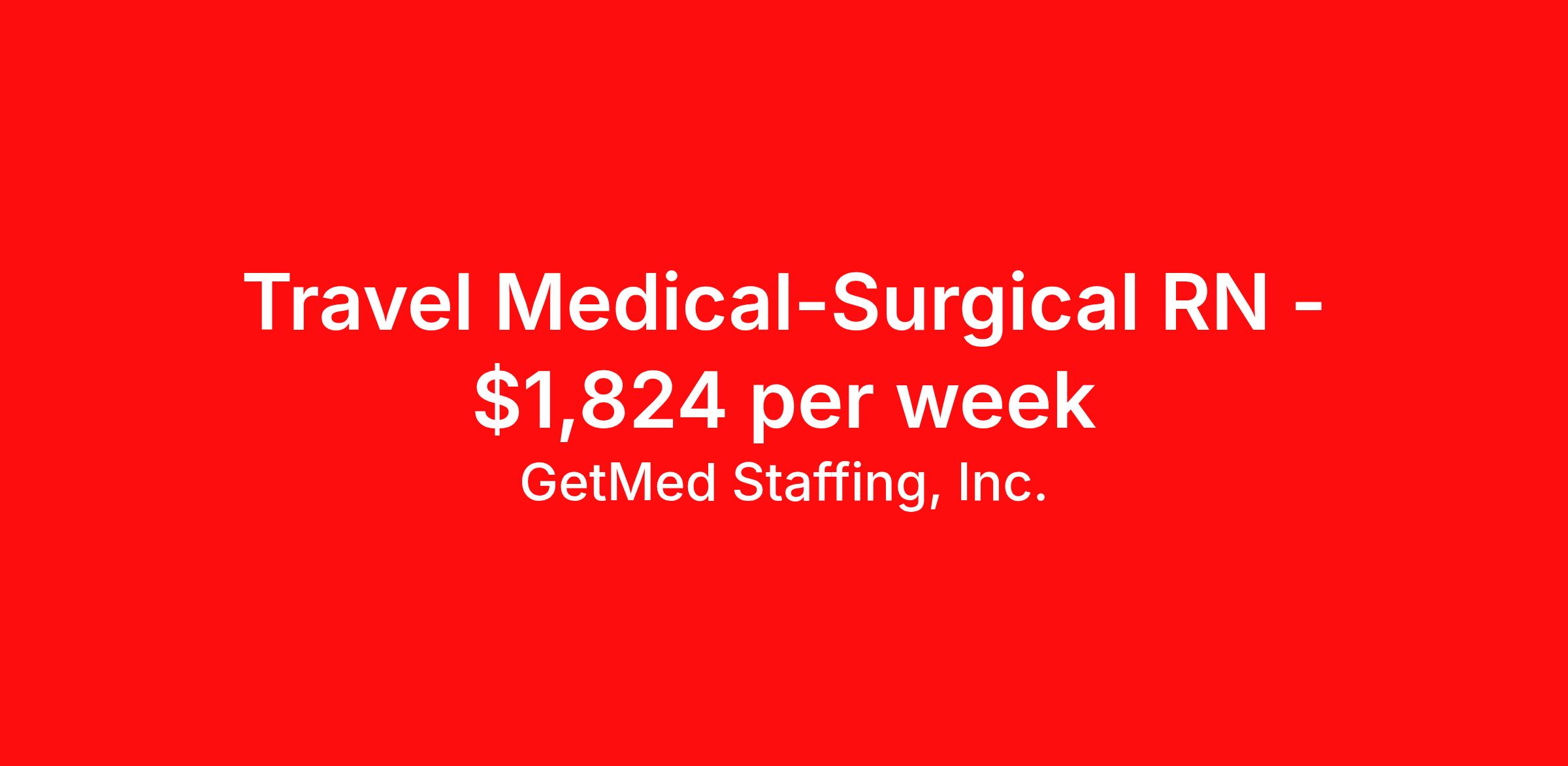 GetMed Staffing, Inc. is seeking a travel nurse RN Med Surg for a travel nursing job in Oakes, North Dakota. Job Description & Requirements Specialty: Med Surg Discipline: RN Start Date: 05/18/2026 Duration: 13 weeks 36 hours per week Shift: 12 hours, nights Employment Type: Travel GetMed Staffing is searching for a strong MedSurg RN to assist our traveler-friendly client. A minimum of 1-2 years of experience is required. Traveling with GetMed Staffing offers the unique opportunity to gain diverse experiences, both personally and professionally. Gain experience that matters. GetMed Staffing, Inc. Job ID 35878535. Pay package is based on 12 hour shifts and 36.0 hours per week (subject to confirmation) with tax-free stipend amount to be determined. Posted job title: RN:MedSurg,19:00:00-07:00:00 About GetMed Staffing, Inc. We are a diversity owned company, specializing in healthcare recruiting services. We truly understand how important a healthcare travelers' relationship is with their recruiter, as well as our relationship is with our healthcare facilities. We recognize that the needs of our healthcare travelers can vary, and therefore we provide the personalized touch necessary to ensure a successful travel assignment each and every time. Our healthcare facilities and clients benefit from us putting our healthcare travelers first. GetMed Staffing is excited to be a leader within the industry by focusing on providing healthcare travelers with more choices and possibilities as they plan for their next healthcare travel assignment. Benefits Life insurance Medical benefits Dental benefits Vision benefits 401k retirement plan