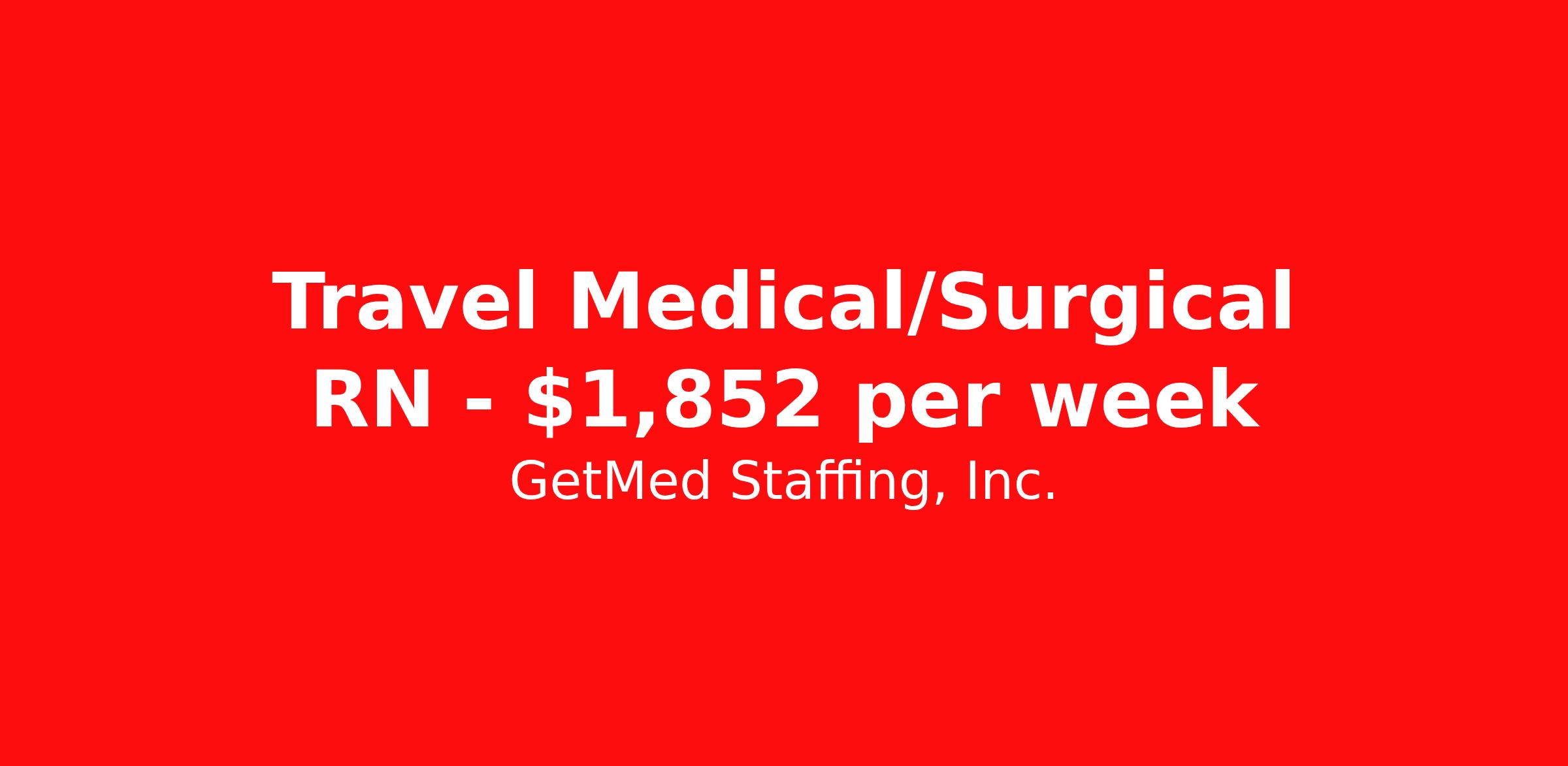 GetMed Staffing, Inc. is seeking a travel nurse RN Med Surg for a travel nursing job in Ida Grove, Iowa. Job Description & Requirements Specialty: Med Surg Discipline: RN Start Date: 03/30/2026 Duration: 13 weeks 36 hours per week Shift: 12 hours, nights Employment Type: Travel GetMed Staffing, Inc. Job ID 36103052. Pay package is based on 12 hour shifts and 36.0 hours per week (subject to confirmation) with tax-free stipend amount to be determined. Posted job title: RN:MedSurg,19:00:00-07:00:00 About GetMed Staffing, Inc. We are a diversity owned company, specializing in healthcare recruiting services. We truly understand how important a healthcare travelers' relationship is with their recruiter, as well as our relationship is with our healthcare facilities. We recognize that the needs of our healthcare travelers can vary, and therefore we provide the personalized touch necessary to ensure a successful travel assignment each and every time. Our healthcare facilities and clients benefit from us putting our healthcare travelers first. GetMed Staffing is excited to be a leader within the industry by focusing on providing healthcare travelers with more choices and possibilities as they plan for their next healthcare travel assignment. Benefits Life insurance Medical benefits Dental benefits Vision benefits 401k retirement plan