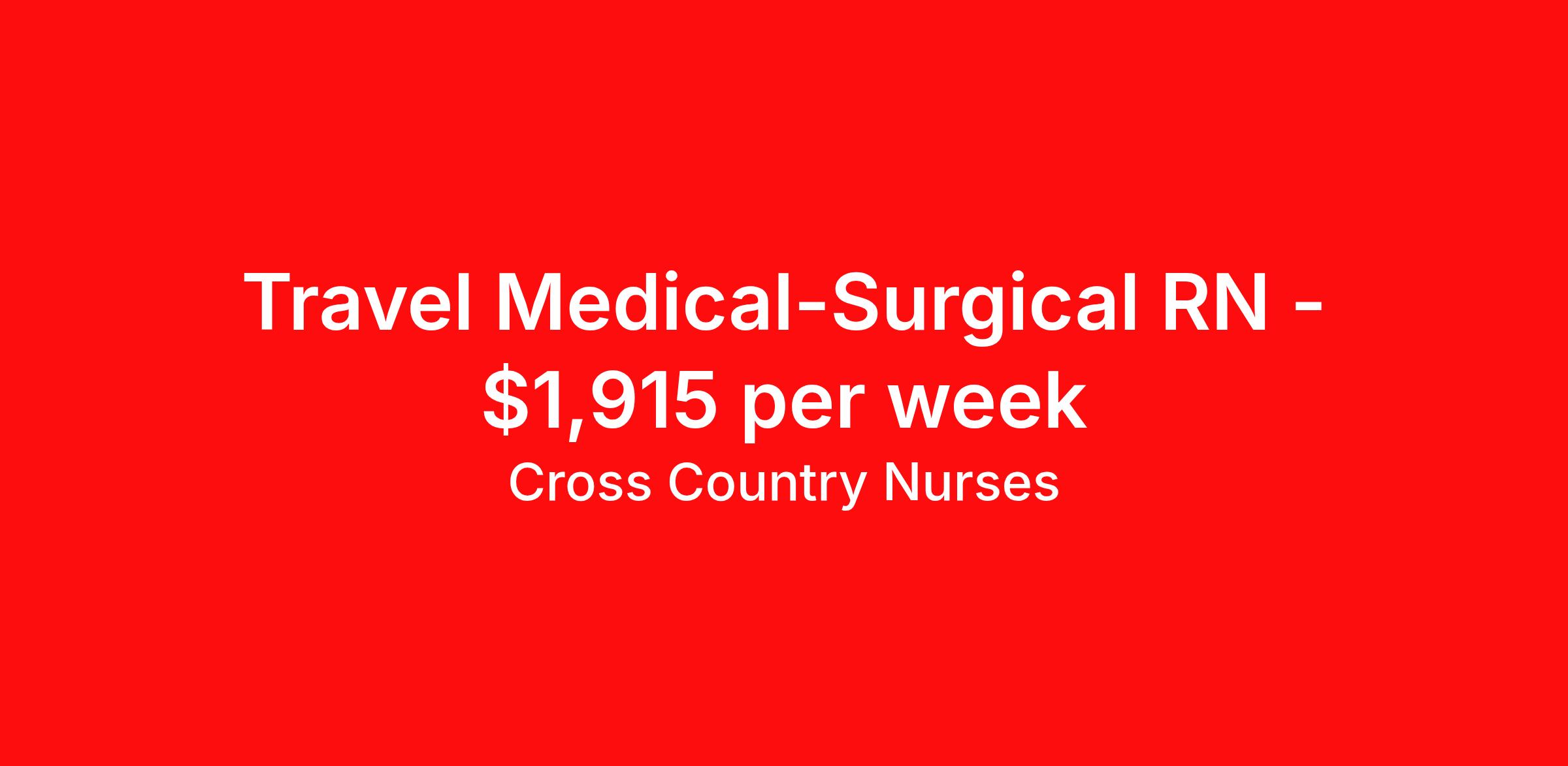 Cross Country Nurses is seeking a travel nurse RN Med Surg for a travel nursing job in Hilo, Hawaii. Job Description & Requirements Specialty: Med Surg Discipline: RN Start Date: 04/20/2026 Duration: 13 weeks 36 hours per week Shift: 12 hours Employment Type: Travel Job Description As a medical/surgical nurse (RN M/S), you will extend bedside care to patients who are coping with illness, injury, or other medical or surgical circumstances. This includes assessing their condition, administering medication, changing dressings, monitoring vitals, and documenting in the patient charts. You're also responsible for providing continued support and education to patients, promoting their overall health and ensuring that they have the tools to adequately recuperate and prevent further health issues. Minimum Requirements At least 1 year of recent acute care experience in specialty Active RN license Benefits The benefits of taking a travel nursing job with Cross Country include: Private housing or generous housing allowance Comprehensive health insurance with prescription coverage Dependent health insurance with prescription coverage Competitive salaries Referral bonuses Travel reimbursement 401(k) retirement plan Direct deposit/free checking Unlimited free CE credits Cross Country Job ID 1234601. Pay package is based on 12 hour shifts and 36 hours per week (subject to confirmation) with tax-free stipend amount to be determined. Posted job title: Registered Nurse / Medical Surgical Floor About Cross Country Nurses You care for others — we’re here to care for you. At Cross Country, we know travel nursing is about more than just the job. It’s about building a career that supports your lifestyle, your values, and your impact. We offer competitive pay, full benefits, and 24/7 support from a team that truly understands what it means to be on the front lines. Wherever your journey takes you, we’re with you every step of the way. Let’s build your best life — one assignment at a time. Benefits 401k retirement plan Referral bonus