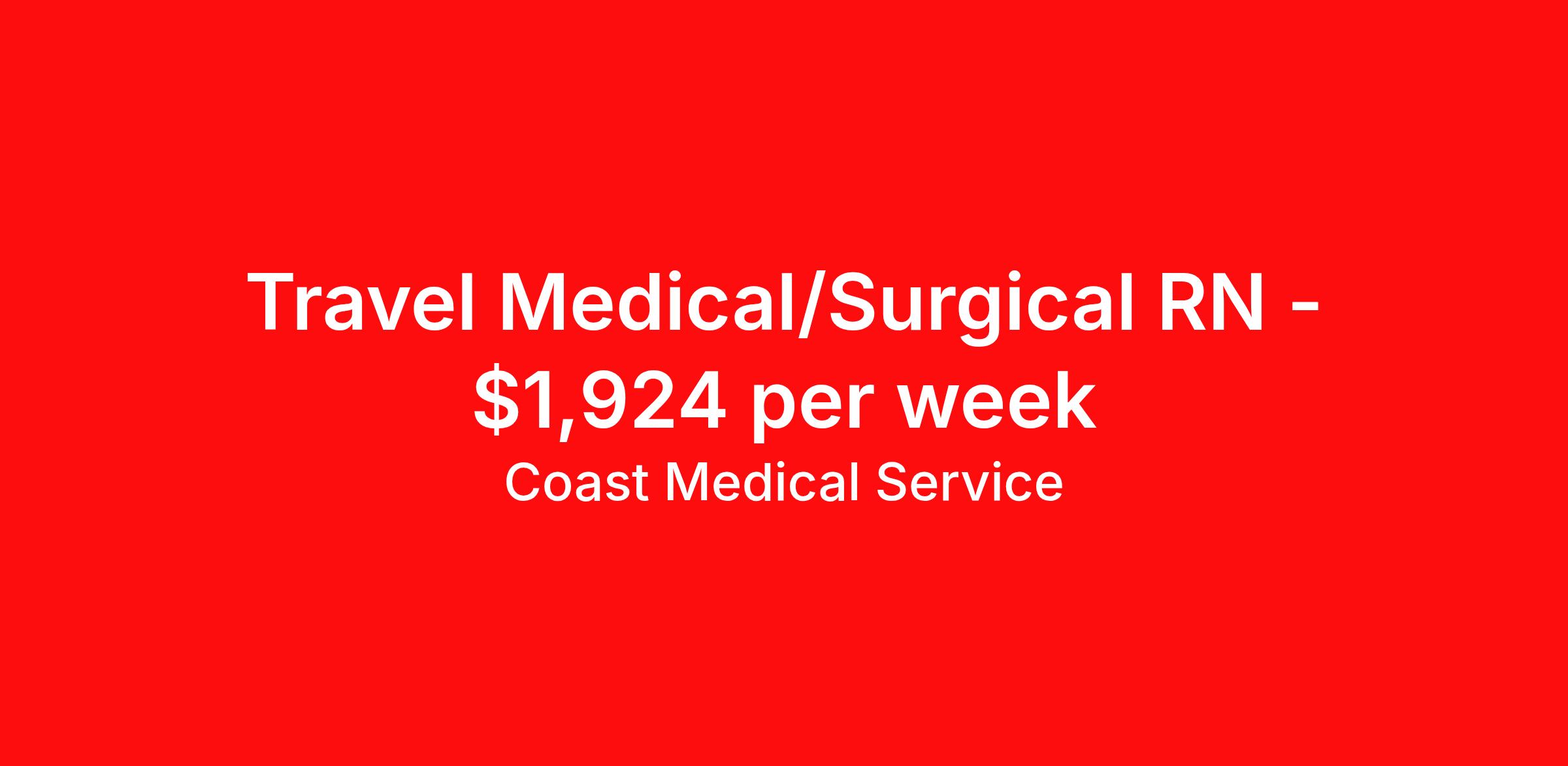 Coast Medical Service is seeking a travel nurse RN Med Surg for a travel nursing job in Aiken, South Carolina. Job Description & Requirements Specialty: Med Surg Discipline: RN Start Date: ASAP Duration: 13 weeks 36 hours per week Shift: 12 hours, nights Employment Type: Travel Coast Medical Service is a nationwide travel nursing & allied healthcare staffing agency dedicated to providing an elite traveler experience for the experienced or first-time traveler. Coast is featured on Blue Pipes' 2023 Best Travel Agencies and named a 2022 Top Rated Healthcare Staffing Firm & 2023 First Half Top Rated Healthcare Staffing Firm by Great Recruiters. Please note that pay rate may differ for locally based candidates. Please apply here or contact a recruiter directly to learn more about this position & the facility, and/or explore others that may be of interest to you. We look forward to speaking with you! Coast Medical Services Job ID 35822766. Pay package is based on 12 hour shifts and 36.0 hours per week (subject to confirmation) with tax-free stipend amount to be determined. Posted job title: RN:Medical-Surgical,19:00:00-07:30:00