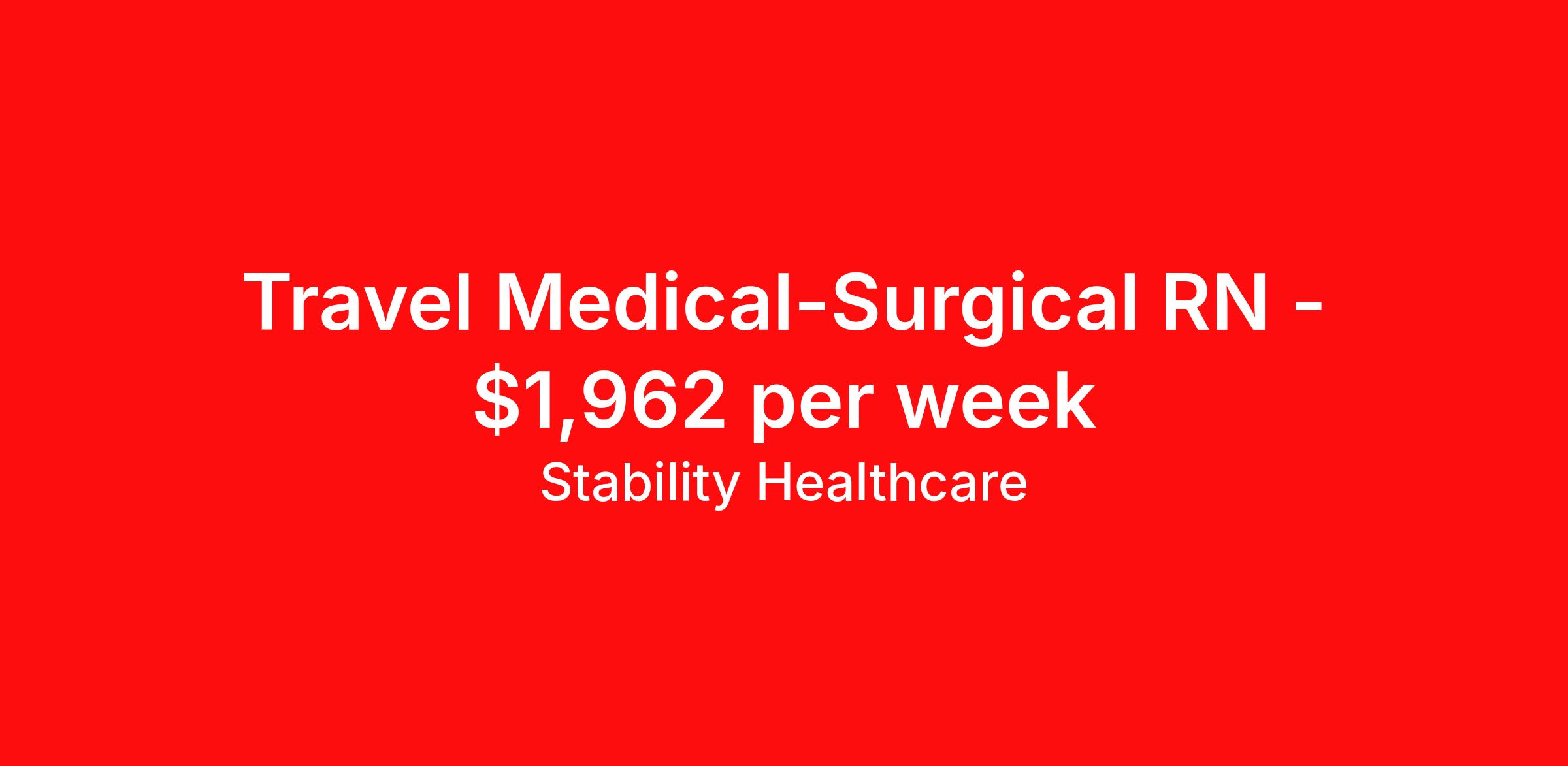 Stability Healthcare is seeking a travel nurse RN Med Surg for a travel nursing job in Oakes, North Dakota. Job Description & Requirements Specialty: Med Surg Discipline: RN Start Date: 05/18/2026 Duration: 13 weeks 36 hours per week Shift: 12 hours, nights Employment Type: Travel Stability Healthcare is looking for a Med-Surg RN contract position in Oakes, ND. The majority of hospitalized patients are admitted to M/S either directly or after surgery. M/S is also where patients who have been in critical care (ICU) are transferred when they no longer need critical care but still require nursing care. *$600 travel bonus *Day 1 health insurance with United Healthcare *PTO plan start accruing on day 1, use during contract or cash out at the end! *Guaranteed stipend if facility calls you off *Extra hour bonus earn an additional hourly bonus for working over your weekly contracted hours Stability Job ID 820720. Pay package is based on 12 hour shifts and 36 hours per week (subject to confirmation) with tax-free stipend amount to be determined. Posted job title: Med-Surg About Stability Healthcare Stability Healthcare was founded in 2009, with the mission of becoming the best Travel Nursing Agency in California. We have been rated one of the top travel nursing agencies and offer our nurses the highest paying travel nursing jobs available. We have access to the best travel assignments from 1000’s of facilities. You can start the year off in sunny California, spend the Spring in the Colorado Rockies, enjoy the Summer in the Mid-West, experience the change of seasons in Boston and New York, and hit the beaches of Florida in the winter. Our Nurses work in the best hospitals and health systems in the country. Benefits Guaranteed Hours Benefits start day 1
