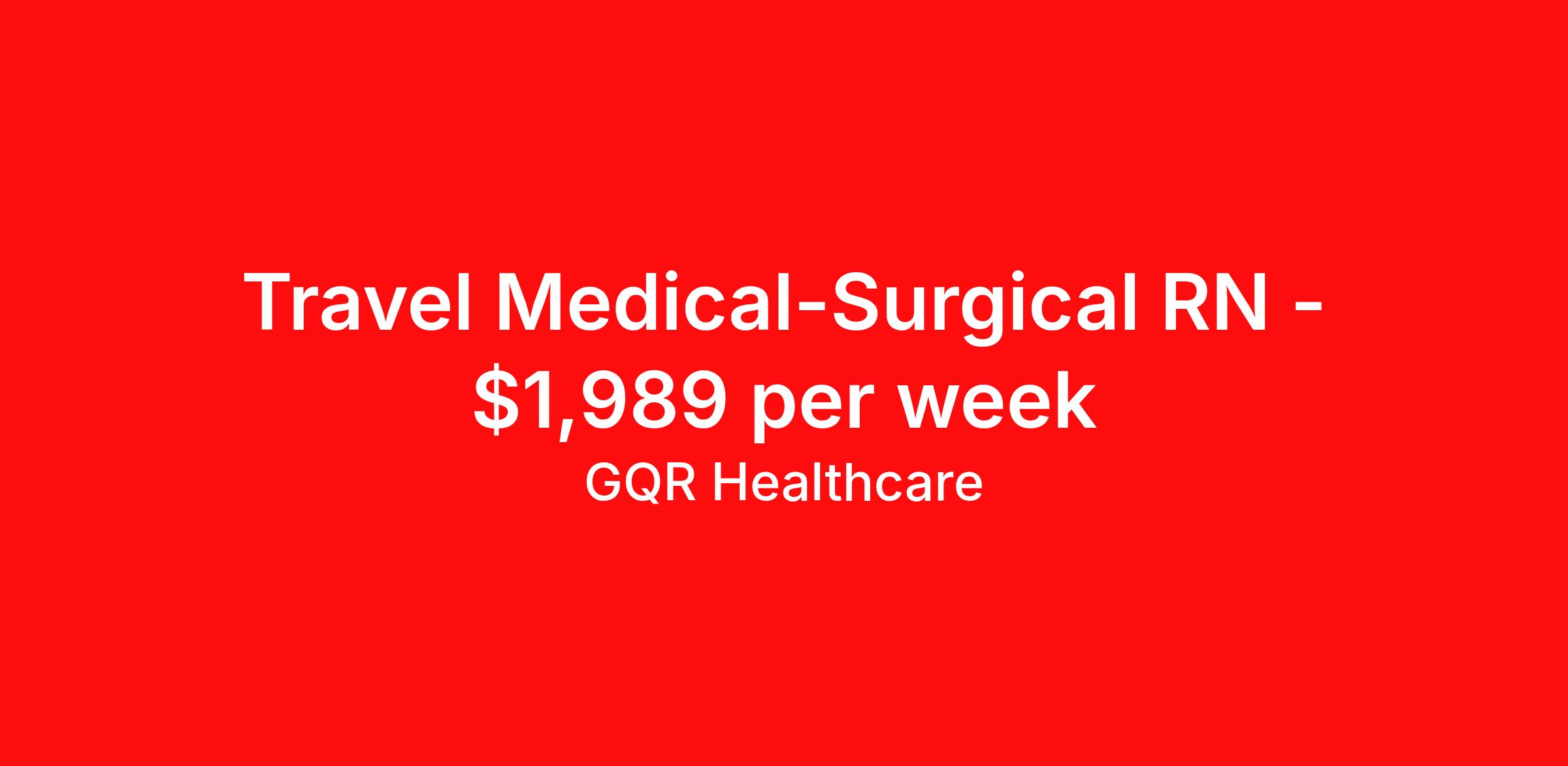 GQR Healthcare is seeking a travel nurse RN Med Surg for a travel nursing job in Wheeling, West Virginia. Job Description & Requirements Specialty: Med Surg Discipline: RN Start Date: ASAP Duration: 13 weeks 36 hours per week Shift: 12 hours, nights Employment Type: Travel Contract - W2 Med/Surg Registered Nurse (RN) Job Location: Wheeling, West Virginia Start Date: March 13, 2026 Profession: Registered Nurse (RN) Facility: Hospital Estimated Pay: $1988.68 - $2083.6800000000003 Duration:13 weeks Specialty:Med/Surg Shift: Night Shift Details: 3x12 Night Job Type: Travel *Estimated weekly pay includes projected hourly wages and weekly meal and lodging per diems for eligible clinicians based on nationally published GSA rates. Actual weekly pay and per diems may differ from the amount shown and are subject to change during an assignment. Benefits: Day 1 Insurance Cigna medical, MetLife dental and vision insurance License reimbursement for new licenses needed for each assignment Discounts with hotels and rental cars A dedicated recruiter and support team that will help you every step of the way to sure you start on time and have an exceptional experience Referral bonus up to $700 About the Company: Finding the right role is about more than just matching skills to a job—it’s about aligning with your goals, values, and the way you want to work. As an award-winning talent partner, we support healthcare professionals through every step of that process, offering meaningful opportunities, clear guidance, and long-term partnership. From our first conversation to your first day on the job (and beyond!), we’re here to help you move forward with confidence. GQR Job ID 787789. Pay package is based on 12 hour shifts and 36 hours per week (subject to confirmation) with tax-free stipend amount to be determined. Posted job title: Registered Nurse (RN) About GQR Healthcare GQR’s Healthcare team specializes in connecting experts within the industry to highly skilled healthcare professionals across the US market. In the competitive healthcare market, we recognize that the industry’s common goals of improved quality of care and patient outcomes are wholly reliant upon the professionals directly supporting these initiatives. Leveraging our extensive candidate network, we deliver continuity of care for the communities our partners serve to ensure the patient experience is of the highest quality. Through deep market specialization and a unique approach to talent acquisition, GQR Healthcare provides an unparalleled and personalized experience across all medical specialties in nursing and within diverse healthcare platforms across the industry.
