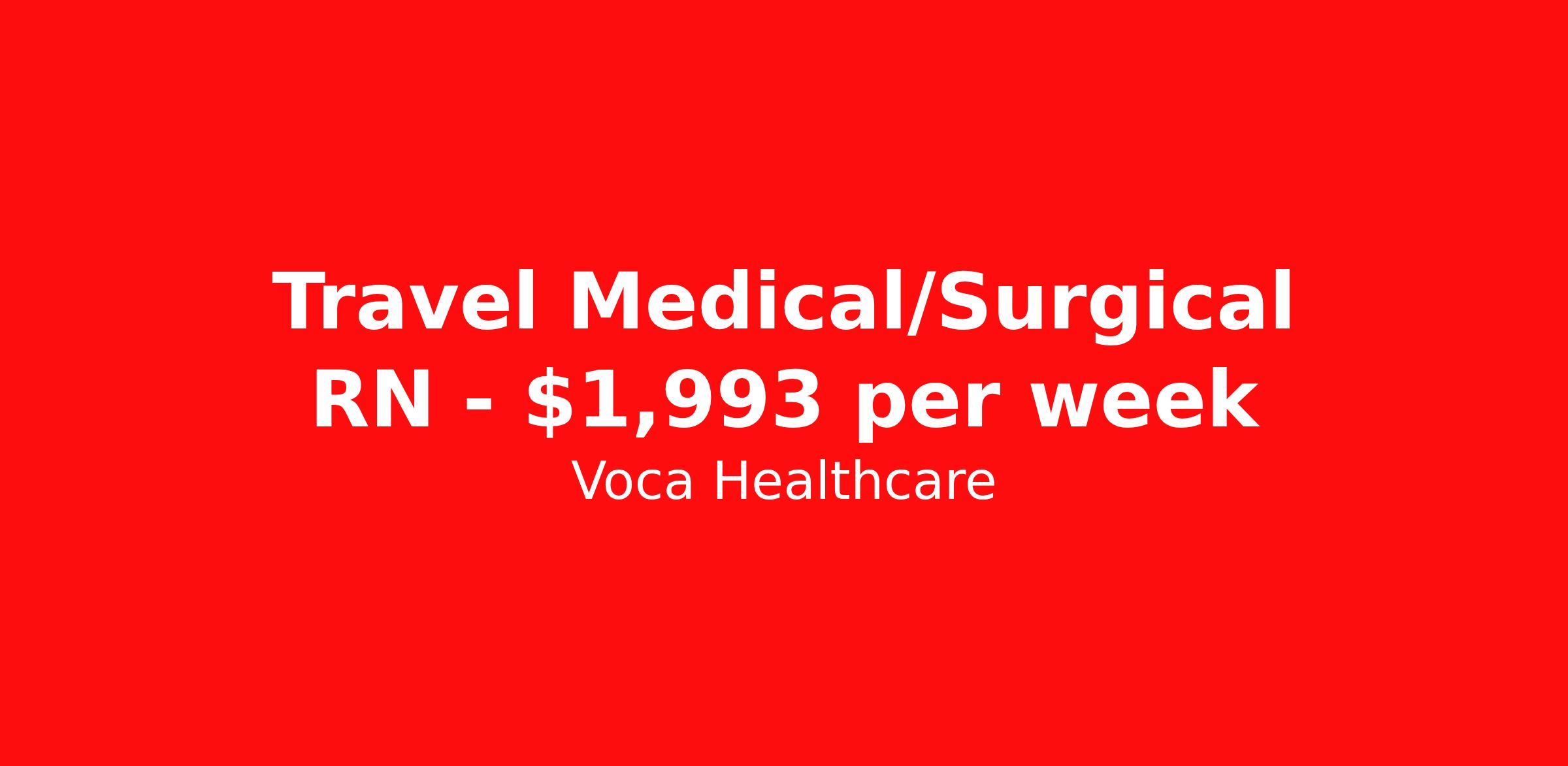 Voca Healthcare is seeking a travel nurse RN Med Surg for a travel nursing job in Wichita, Kansas. Job Description & Requirements Specialty: Med Surg Discipline: RN Start Date: 04/12/2026 Duration: 13 weeks 36 hours per week Shift: 12 hours, days Employment Type: Travel Benefits available on 1st of the month after start: Holiday pay Weekly pay Retention bonus 401k retirement plan Medical benefits Dental benefits Vision benefits Referral bonus Voca Healthcare Job ID 17976093. Pay package is based on 12 hour shifts and 36.0 hours per week (subject to confirmation) with tax-free stipend amount to be determined. Posted job title: RN:Med Surg,07:00:00-19:00:00 About Voca Healthcare As a Voca Traveler, you will gain new clinical skills, visit amazing places and meet awesome healthcare professionals. As a travel health professional, your experience and dedication to patient care is in high demand throughout the United States. Whether you are a veteran traveler looking for your next opportunity, or you are looking to travel for the first time, Voca is here to support you. Voca’s experienced and dedicated travel team works in concert with you every step of the way. Our long-standing partnerships with some of the most respected and recognized healthcare organizations in the country allow us to identify career opportunities to help you increase your knowledge and experience while working with some of the best physicians and healthcare professionals in the world. At Voca, we strongly believe a better career results in a happier you. We are here to help you find a position that is professionally and personally rewarding. Benefits Holiday Pay 401k retirement plan Medical benefits Dental benefits Vision benefits Guaranteed Hours