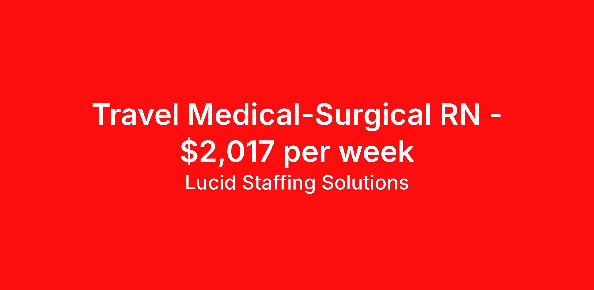 Lucid Staffing Solutions is seeking a travel nurse RN Med Surg for a travel nursing job in Johnstown, Pennsylvania. Job Description & Requirements Specialty: Med Surg Discipline: RN Duration: 13 weeks 36 hours per week Shift: 12 hours, nights Employment Type: Travel Job Description Position: Travel Registered Nurse (RN) with experience in OR Location: Johnstown, Pennsylvania Shift: 12hr Night Weekly Gross: $2017.48 Lucid Staffing Solutions was created by former healthcare workers who lived the short staffing, the chaotic workflows, and the nonstop pressure that comes with patient care. We built an agency powered by real clinical experience, kept simple and supportive, so you never have to guess whether the people guiding you actually know what they’re talking about. Minimum Requirements: Active license as a Registered Nurse (RN) Licensed in Pennsylvania (If applicable) or compact eligible Two years of recent OR experience Active BLS Why Lucid Works for Travelers Paid Weekly: Stipends pushed to GSA limits whenever possible $500 Travel Reimbursement: Paid at the start of each assignment Clinician-Led Team: Recruiters and Account Managers with real clinical experience In-House Compliance: fast updates, real communication, and none of the delays that come with outsourced vendors. Health Coverage Options: Multiple medical plans plus dental, vision, and workers compensation 401(k) Match: 4 percent match after 6 months License & Certification Reimbursement: We help cover the cost of staying compliant Liability Insurance: Included automatically Referral Bonuses: $500 per referral, $750 after five referrals Ready to start your journey? Apply today to connect with a Clinician-Recruiter! Lucid Staffing Solutions Job ID 35981. Pay package is based on 12 hour shifts and 36 hours per week (subject to confirmation) with tax-free stipend amount to be determined. Posted job title: MS About Lucid Staffing Solutions Clinician Owned & Operated At Lucid Staffing Solutions, we do things differently—because we’ve been in your shoes. Founded by actual healthcare professionals, Lucid was built to fix the issues we experienced as travelers. We know what makes a great assignment: competitive pay, seamless onboarding, honest recruiters, and most importantly—working with a team that truly sees and supports you. Our entire team is made up of former clinicians who understand the demands of the job and what travelers truly need to succeed. We offer some of the highest paying allied health and nursing contracts across the country, along with some amazing benefits & perks. Whether you're chasing freedom, flexible schedules, bigger paychecks, or your next adventure, Lucid helps you get there—with real support, real respect , and real healthcare experts. Benefits Dental benefits Medical benefits Vision benefits