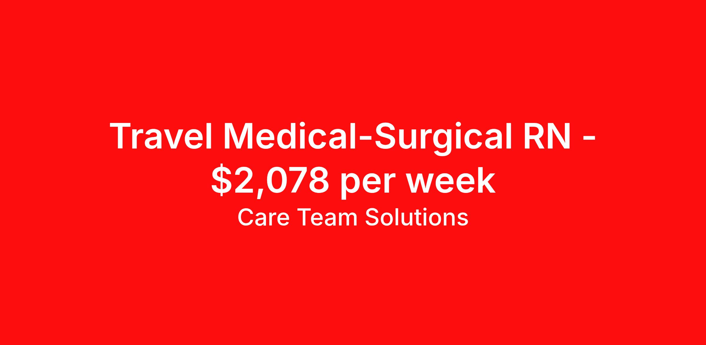 Care Team Solutions is seeking a travel nurse RN Med Surg for a travel nursing job in Lebanon, New Hampshire. Job Description & Requirements Specialty: Med Surg Discipline: RN Start Date: 04/06/2026 Duration: 13 weeks 36 hours per week Shift: 12 hours Employment Type: Travel Registered Nurse must have 2 years of recent experience in particular specialty Details: Must Have 2 Years of recent Medical-Surgical experience. Specialty: Medical-Surgical Discipline: Registered Nurse Start Date: 2026-04-06 Duration: 13 Weeks Shift: 12 Hours Day shift Hours Per Week: 36 Hours Employment Type: Contract Gross Weekly Pay: $2078.10 Six things that won’t happen if you apply to this job: You won’t have to guess what the downsides are. We’ll tell you up front. You won’t show up on day 1 and find out this is not what you signed up for. We won't leave your phone call ringing when it's inconvenient. Business hours for you are business hours for us. You won’t get shuffled to some customer service rep when a problem pops up. If we screw up something in securing your placement, we'll own it. That means it's on us to make it right. You won’t figure out your credentials alone. Our credentialing experts will walk you through it step by step. We've talked to thousands of travel nurses like you. We know you want good pay. You want to choose when you work. But the one thing nurse after nurse has said they want and don't have is someone in their corner. There's a lot in this business that’s messed up. We’re trying to be the people that fix it. You and every nurse with the guts to travel deserve it. We've worked hard for you to enjoy some one-of-a-kind benefits you'll not likely find anywhere else, because they benefit you more than they benefit us: Our early pay program Student loan reimbursement Free well-being tele-visits with a psychologist Care Team Solutions Job ID 586652. Pay package is based on 12 hour shifts and 36 hours per week (subject to confirmation) with tax-free stipend amount to be determined. Posted job title: Temp - RN - Med/Surg (Nights) Lebanon, NH About Care Team Solutions Two brothers who give an enormous damn. We're Justin and Kyle. Neither of us are nurses. It doesn’t take a nurse to see that the way travel nurses are treated sucks. Nursing is already hard enough. Travel nursing takes serious guts. You get the toughest assignments in places you’ve never been. Which can be fun, but it’s also stressful. You’re in your element but outside of your hometown. You can be a stranger on the team. If anyone deserves someone in their corner, it’s you. But that’s not how most agencies operate. Which is why travel nurses hate working with them. We got into this business because we saw bucket-loads of nurses moving through the "churn and burn" travel machinery. We absolutely hate that. You'll do your best work when you have the placements you want and feel fully supported in your work. We pay our people well because we want them to treat you well. Our recruiters are amazing (we picked each of them ourselves), but if you've got a problem too big for them, they can come straight to us. We work like ten feet away. The "Churners and Burners" promise you the same benefits. They might as well copy/paste them from each other. We have them too: 401k, holiday pay, healthcare, dental, travel reimbursement, etc But we've worked hard for you to enjoy some one-of-a-kind benefits you'll not likely find anywhere else, because they benefit you more than they benefit us: Our early pay program Student loan reimbursement Free well-being tele-visits with a psychologist Benefits Weekly pay Holiday Pay Guaranteed Hours 401k retirement plan Wellness and fitness programs Referral bonus Medical benefits Dental benefits Vision benefits School loan reimbursement