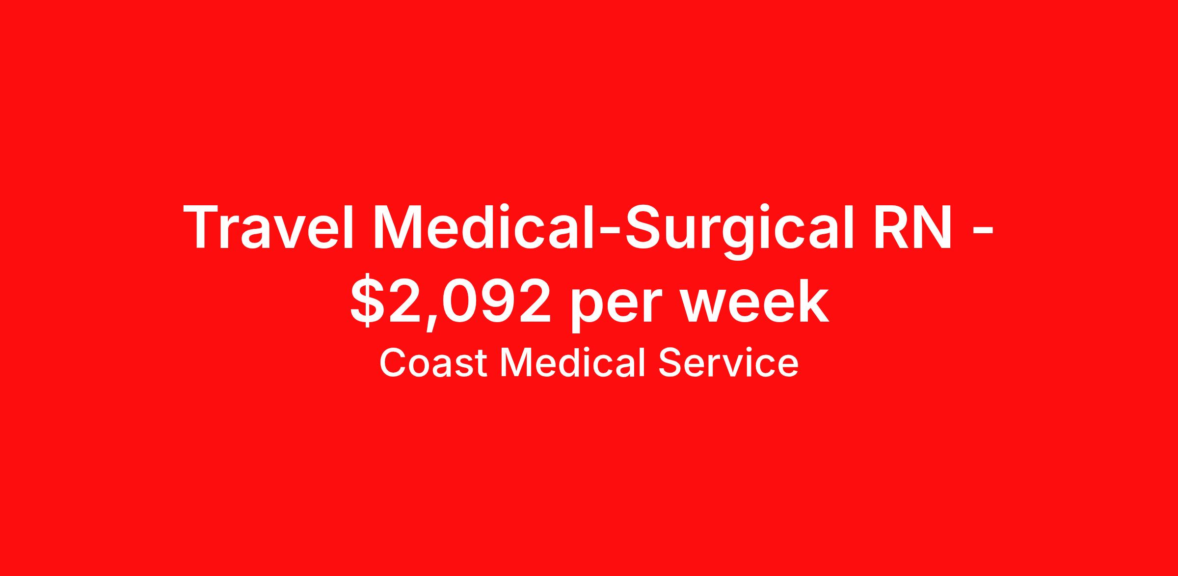 Coast Medical Service is seeking a travel nurse RN Med Surg for a travel nursing job in Oakes, North Dakota. Job Description & Requirements Specialty: Med Surg Discipline: RN Start Date: 05/18/2026 Duration: 13 weeks 36 hours per week Shift: 12 hours, nights Employment Type: Travel Coast Medical Service is a nationwide travel nursing & allied healthcare staffing agency dedicated to providing an elite traveler experience for the experienced or first-time traveler. Coast is featured on Blue Pipes' 2023 Best Travel Agencies and named a 2022 Top Rated Healthcare Staffing Firm & 2023 First Half Top Rated Healthcare Staffing Firm by Great Recruiters. Please note that pay rate may differ for locally based candidates. Please apply here or contact a recruiter directly to learn more about this position & the facility, and/or explore others that may be of interest to you. We look forward to speaking with you! Coast Medical Services Job ID 35878459. Pay package is based on 12 hour shifts and 36.0 hours per week (subject to confirmation) with tax-free stipend amount to be determined. Posted job title: RN:Medical-Surgical,19:00:00-07:30:00
