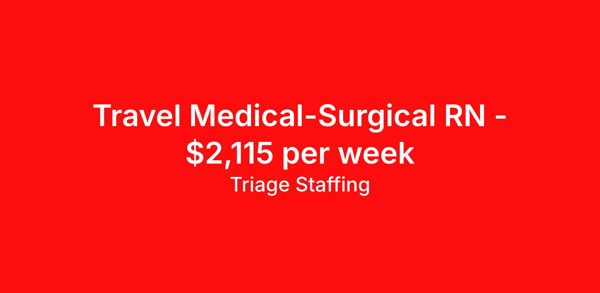 Triage Staffing is seeking a travel nurse RN Med Surg for a travel nursing job in Weirton, West Virginia. Job Description & Requirements Specialty: Med Surg Discipline: RN Start Date: ASAP Duration: 13 weeks 36 hours per week Shift: 12 hours, flexible Employment Type: Travel Travel Nursing: Med/Surg Weirton, WV Location: Weirton, WV Start Date: 3/20/2026 Shift Details: 12H Variable 36 hours per week Length: 13 WEEKS Apply for specific facility details.Med Surg RN Triage Staffing Job ID 6XPPTPTX. Posted job title: Nursing: Med/Surg About Triage Staffing At Triage, we prefer to be real . Real about expectations—both ours and yours. Real about how a decision you make today could affect your tomorrows. Real about how compensation actually works. Real about how great—or grating—your next supervisor may be. Being real allows everyone at Triage to be ready . Ready to serve you with real honesty. So if that gig near the ocean is really no day at the beach, or that third shift comes with a second-class rate, we tell you. So you can be ready, too. We staff all five major divisions of acute care—nursing, lab, radiology, cardiopulmonary and rehab therapy, offering: - Competitive, custom pay packages - One point of contact for both travelers and facilities (per division) - A reliable recruiter who's got your back throughout your entire assignment - In-house compliance and accounting specialists - A clinical liaison team available 24/7 to offer medical and professional support and career development - A mentoring program that is run and managed by actual clinicians—yeah, you read that right - And more (because of course there’s more) Are we the biggest? No. Are we the best? That’s rather subjective, but we’re trying to be. Will we work like hell to get you as close to your idea of heaven as possible? Yes. Yes, we will. Benefits: Day One comprehensive, nationwide insurance plans for health, vision and dental and life—including a HSA option Day One 401(k) program with employer-matching contributions once eligible Facility cancelling protection—your time is money on and off-the-clock Guaranteed hours Weekly paychecks via direct deposit Earned vacation bonuses for time worked Paid holidays Employee assistance program (EAP)—your mental health is important, too Continuing education, certification and licensing reimbursement Workers comp—because accidents happen Top-rated professional liability insurance Company provided housing options Referral bonus—$750 in your pocket after they’ve completed a 13-week assignment