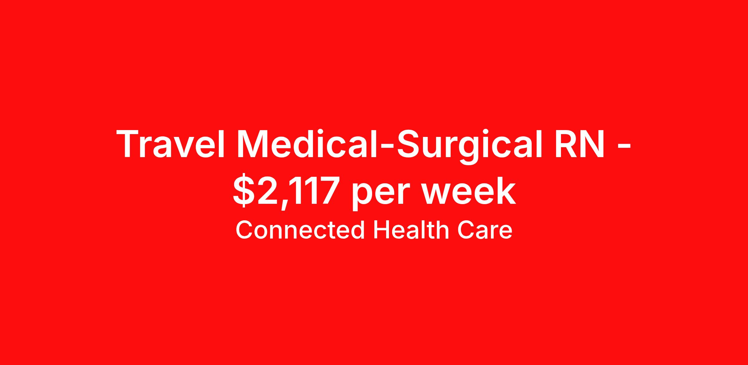 Connected Health Care is seeking a travel nurse RN Med Surg for a travel nursing job in Sheboygan, Wisconsin. Job Description & Requirements Specialty: Med Surg Discipline: RN Start Date: 04/06/2026 Duration: 13 weeks 36 hours per week Shift: 12 hours Employment Type: Travel Travel/Contract Medical-Surgical Registered Nurse Competitive WEEKLY Pay for Qualified Candidates! Connected Health Care is seeking a compassionate and experienced Travel/Contract Medical-Surgical Registered Nurse for an immediate opportunity in WI. Whether you are looking to take your next adventure across the country or simply looking for a new contract opportunity close to home, our team is committed to finding the perfect opportunity for you. Job Description & Requirements: Position: Travel/Contract Medical-Surgical Registered Nurse Discipline: Registered Nurse Specialty/Department: Medical-Surgical Duration: 13 weeks Benefits What To Expect From The Connected Team: Weekly, On time Pay Access to exclusive travel/contract assignments through our dedicated team at Connected Health Care Quick Offers and submittals through direct relationships with partners and facilities in all 50 states Weekly, On time Pay Holiday Overtime Rates that are typically 50% higher than our competitors Premium Health Benefits starting on the first day of your assignment 401K Plans with generous matching programs Paid Housing or generous housing allowances in the form of stipends Paid Time Off and Paid Sick Time Referral Bonuses ranging from $500 - $1,500 depending on the role Completion Bonuses for every assignment Reimbursements for Travel, Licensure, Relocation, and other expenses when applicable A dedicated team who care, with 24/7 support If you're ready to elevate your career while enjoying the flexibility of travel, apply now and let our team connect you to exciting opportunities across the nation! *Note: Per Diem Hours are NOT guaranteed on a weekly basis. Connected Healthcare Job ID 174495. Pay package is based on 12 hour shifts and 36 hours per week (subject to confirmation) with tax-free stipend amount to be determined. Posted job title: Travel/Contract Medical-Surgical Registered Nurse About Connected Health Care Connected Health Care is a nationally recognized healthcare recruiting and staffing agency specializing in travel nursing, travel allied health, interim leadership, per-diem staffing, and permanent placement. Our team of professional account managers, recruits, and credentialists are focused on providing you with the most fulfilling career path that aligns with your personal goals, whether you are traveling with us for a season or looking for a permanent place to call home. Benefits Weekly pay Holiday Pay Guaranteed Hours Continuing Education 401k retirement plan Company provided housing options Cancelation protection Mileage reimbursement Referral bonus Employee assistance programs Medical benefits Dental benefits Vision benefits Benefits start day 1 License and certification reimbursement