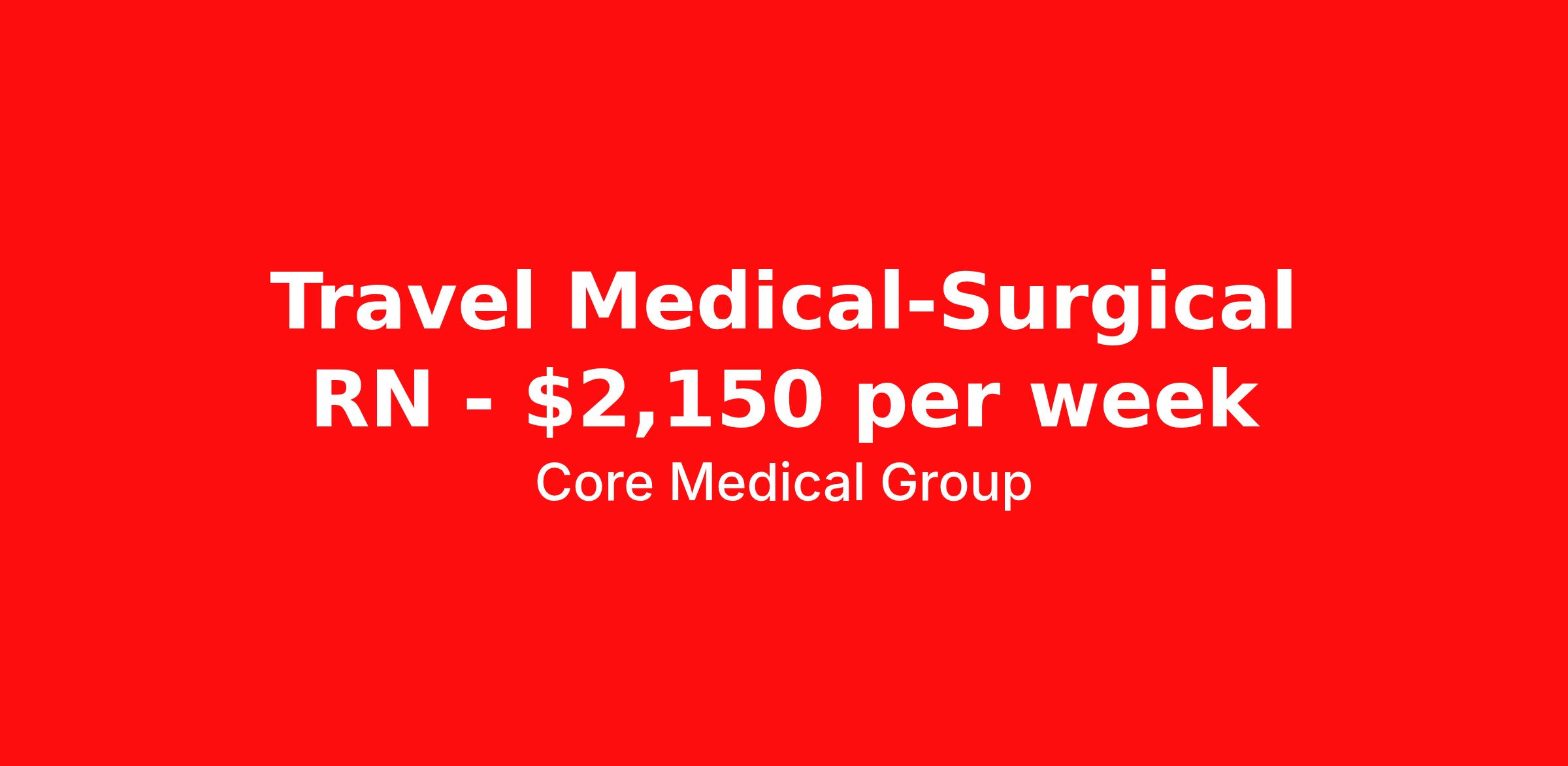 Core Medical Group is seeking a travel nurse RN Med Surg for a travel nursing job in Albany, New York. Job Description & Requirements Specialty: Med Surg Discipline: RN Start Date: ASAP Duration: 13 weeks 36 hours per week Shift: 12 hours Employment Type: Travel Client in NY seeking Registered Nurse: Med/Surg for the following shift(s): Nights We are looking for a healthcare professional who is ready to provide exceptional patient care in this contract/travel role. Contract/travel assignments are typically 13 weeks, with potential to extend. Help us continue our mission to connect people, improve lives, and give back to the community by joining the CoreMedical Group team. When you work with CoreMedical Group, we put you first and treat you like family, supporting you every step of the way. CoreMedical Group is one of the largest healthcare staffing agencies in the country, with travel and contract positions located across the United States. Our recruiters will help you find the perfect job, whether it's across the country or across the street. In addition to dedicated, personalized support from your recruiter, when you work with CoreMedical Group you'll receive: Access to an extensive benefits package, including day 1 health, dental, and vision insurance, employer paid life insurance, a health reimbursement account, and more! Weekly paychecks with competitive pay packages Matching 401(k) benefits to help you save for retirement Licensure assistance and reimbursement to set you up for success on your contract Travel reimbursement and dedicated housing support while on assignment Referral cash bonuses when you connect us with other clinicians CoreMedical Group also offers you a free, all-inclusive vacation each year as our way of saying "thank you" for your hard work. Join other healthcare professionals on the annual Club CoreMed retreat and you'll see why our contract and travel professionals come back to us year after year! Your career is too valuable to tackle on your own. Let CoreMedical Group help you with your healthcare journey! *Estimate of weekly payments is intended for informational purposes and includes hourly wages, as well as reimbursements for meal & incidental expenses, and housing expenses incurred on behalf of the Company. Any benefits (medical/dental/vision) are in addition to the weekly pay. Please speak with your Recruiter for additional details. Estimated payments are subject to change until formal offer of assignment is made and accepted. Core Medical Group Job ID 1359702. Pay package is based on 12 hour shifts and 36 hours per week (subject to confirmation) with tax-free stipend amount to be determined. Posted job title: RN About Core Medical Group CoreMedical Group is one of the largest healthcare staffing agencies in the country. We have jobs nationwide in travel nursing, travel allied health, interim, locum tenens, and permanent placements! Join the staffing agency with Club CoreMed, the best perk in the industry - an all inclusive paid trip to a tropical resort! Benefits Weekly pay Holiday Pay Guaranteed Hours Continuing Education 401k retirement plan Pet insurance Company provided housing options Sick pay Wellness and fitness programs Mileage reimbursement Referral bonus Employee assistance programs Medical benefits Dental benefits Vision benefits Benefits start day 1 License and certification reimbursement Life insurance Discount program