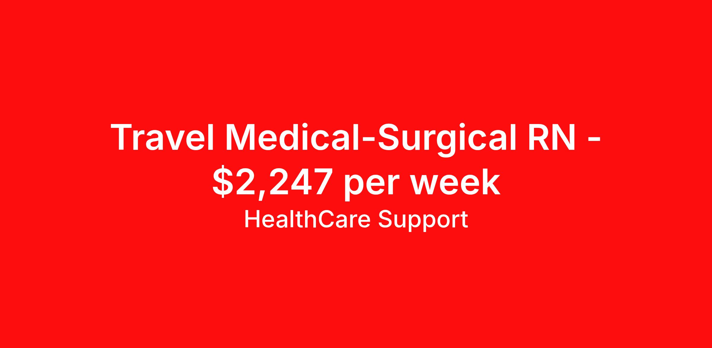 Healthcare Support is seeking a travel nurse RN Med Surg for a travel nursing job in Cleveland, Ohio. Job Description & Requirements Specialty: Med Surg Discipline: RN Start Date: 04/19/2026 Duration: 13 weeks 36 hours per week Shift: 12 hours Employment Type: Travel Healthcare Support Job ID 492114. Pay package is based on 12 hour shifts and 36 hours per week (subject to confirmation) with tax-free stipend amount to be determined. Posted job title: rn medical surgical (m/s) About Healthcare Support Healthcare Support excels at providing a streamlined and red-carpet experience for our travelers. Whether you are a nurse, a therapist, or an allied health professional, our goal is to connect you with top-rated facilities throughout the country and get you on the road to your next adventure. We leverage 20 years of relationships with the industry’s most respectable companies across all 50 states, both through direct client partnerships and via national MSP programs. From health systems and hospitals to specialty clinics and post-acute facilities, you can work where you want to work and go where you want to go. Not only does HealthCare Support reimburse for relocation and travel costs on your first check, but we also offer license and certification reimbursements required for your assignments so that you can focus on building your career. During your assignment, you’ll have access to medical benefits, 24/7 support from our Clinical Advocacy Team, and a travel team with stateside operations. Your travel team will include a designated credentialing expert to help you navigate every step of the on-boarding process, a payroll specialist who you can communicate with directly, and a skilled recruiter who takes the time to understand your needs and works hard to find the right position for you. Don’t get lost in the shuffle of another overblown staffing agency. Choose HealthCare Support to be your trusted partner that you can rely on for all your travel assignments. We can’t wait to hear about the amazing adventures you’ll have! Pst! Ask us about our Direct Hire Opportunities! Benefits License and certification reimbursement Medical benefits Dental benefits Mileage reimbursement Employee assistance programs Referral bonus 401k retirement plan Holiday Pay Weekly pay