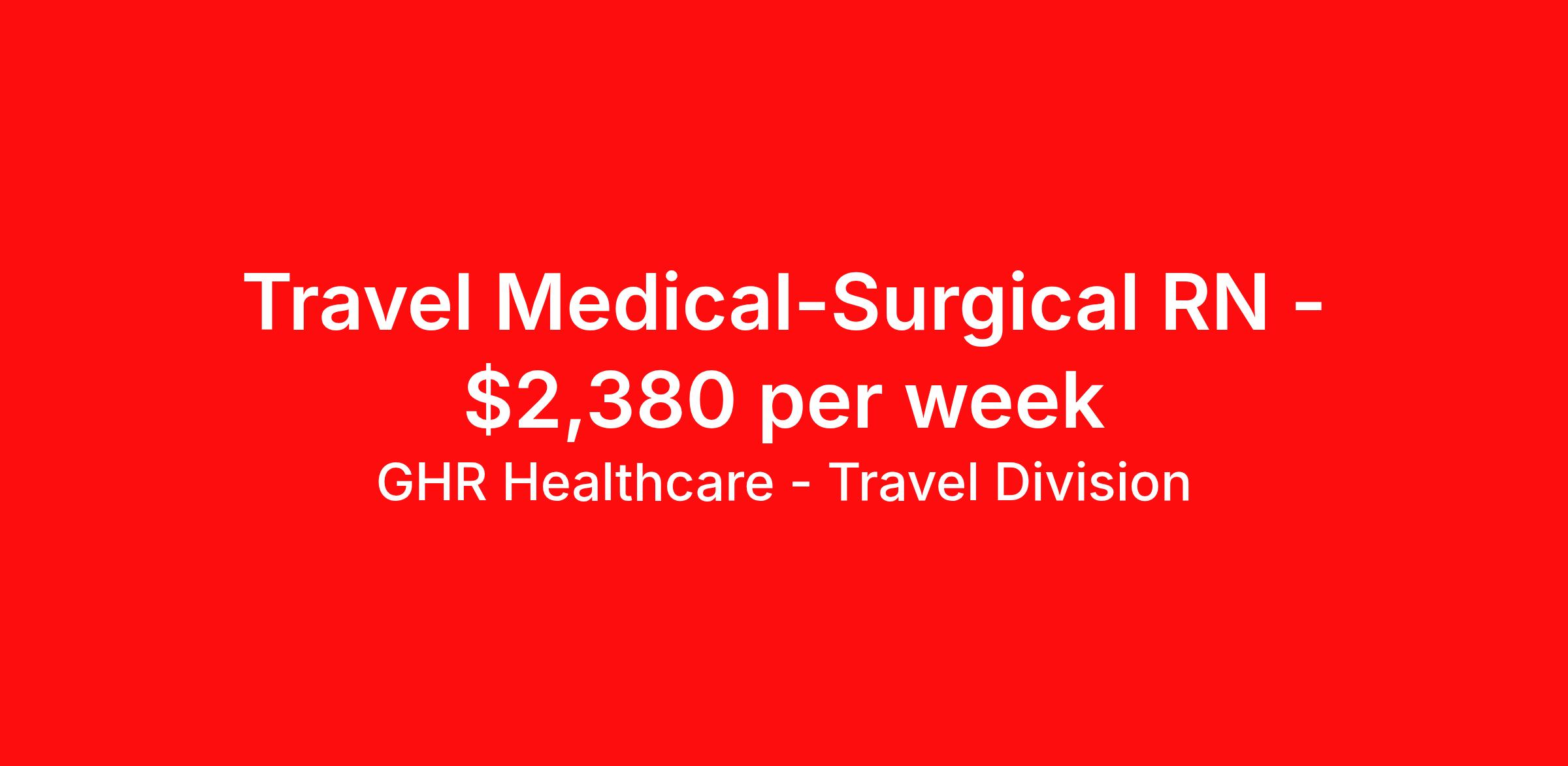 GHR Healthcare - Travel Division is seeking a travel nurse RN Med Surg for a travel nursing job in Ithaca, New York. Job Description & Requirements Specialty: Med Surg Discipline: RN Start Date: 03/30/2026 Duration: 13 weeks 40 hours per week Shift: 8 hours Employment Type: Travel GHR Healthcare - Travel Division Job ID 76228796. Pay package is based on 8 hour shifts and 40 hours per week (subject to confirmation) with tax-free stipend amount to be determined. About GHR Healthcare - Travel Division For over 30 years, GHR Healthcare has been the bridge between healthcare professionals and the facilities that need them nationwide. We're committed to uncovering your ideal fit, supported by GHR's dedication to competitive compensation, transparent communication, and a devoted team that genuinely cares about your career journey. You can trust us to stand by your side as your advocate, confidante, and partner in advancing your career. At GHR, care and consideration are at the heart of everything we do. Visit ghrhealthcare.com to learn more.