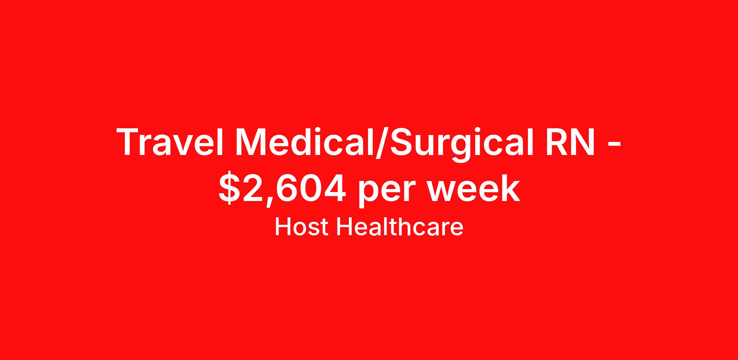 Host Healthcare is seeking a travel nurse RN Med Surg for a travel nursing job in Wichita, Kansas. Job Description & Requirements Specialty: Med Surg Discipline: RN Start Date: 04/19/2026 Duration: 13 weeks 48 hours per week Shift: 12 hours, nights Employment Type: Travel Host Healthcare Job ID a1fVX000002uwbFYAQ. Pay package is based on 12 hour shifts and 48 hours per week (subject to confirmation) with tax-free stipend amount to be determined. Posted job title: RN - Medical-Surgical About Host Healthcare At Host Healthcare, we provide a truly comfortable experience as you explore your travel nursing, therapy, or allied career. We make your travel healthcare journey easy by taking care of all the details, so you don’t have to. We are on a mission to help others live better and we do this by helping the healers of the world be as comfortable as possible. With access to tens of thousands of travel nursing, therapy, and allied jobs in all 50 states, our responsive and friendly recruiters find your dream position based on what’s important to you. During your assignment, get access to premium benefits, including Day 1 medical that continues up to 30 days between assignments, 401K matching, travel reimbursements, dedicated housing support, and more. We also offer 24/7 support from our team and access to our on-staff clinicians so you can feel comfortable and confident throughout your entire assignment. Travel comfortably with Host Healthcare. Benefits Referral bonus School loan reimbursement Vision benefits Wellness and fitness programs Company provided housing options License and certification reimbursement Life insurance Medical benefits Mileage reimbursement Pet insurance Discount program Employee assistance programs Guaranteed Hours Health savings account Holiday Pay 401k retirement plan Continuing Education Dental benefits
