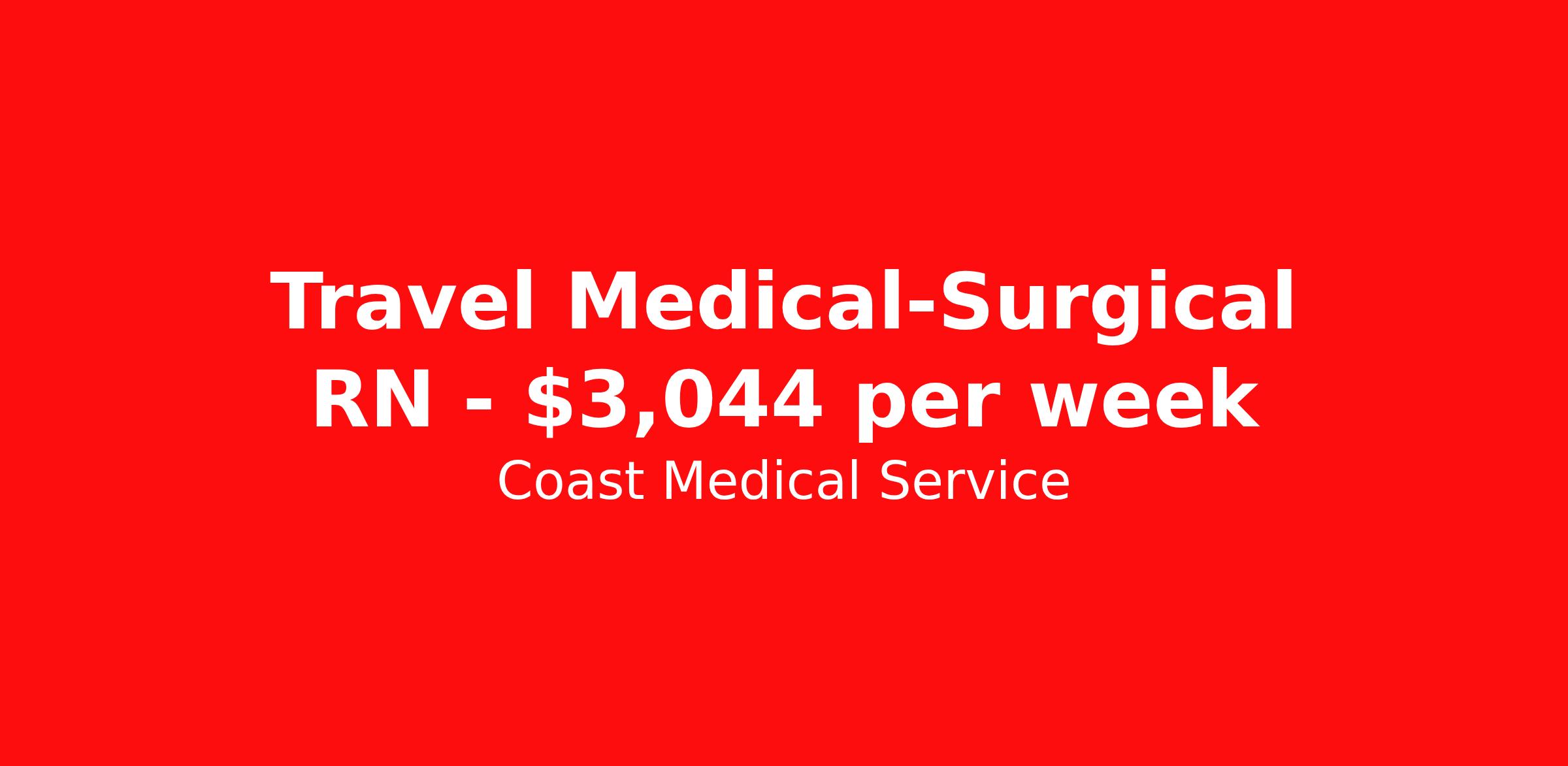 Coast Medical Service is seeking a travel nurse RN Med Surg for a travel nursing job in Rochester, New York. Job Description & Requirements Specialty: Med Surg Discipline: RN Start Date: 05/11/2026 Duration: 13 weeks 48 hours per week Shift: 12 hours, rotating Employment Type: Travel Coast Medical Service is a nationwide travel nursing & allied healthcare staffing agency dedicated to providing an elite traveler experience for the experienced or first-time traveler. Coast is featured on Blue Pipes' 2023 Best Travel Agencies and named a 2022 Top Rated Healthcare Staffing Firm & 2023 First Half Top Rated Healthcare Staffing Firm by Great Recruiters. Please note that pay rate may differ for locally based candidates. Please apply here or contact a recruiter directly to learn more about this position & the facility, and/or explore others that may be of interest to you. We look forward to speaking with you! Coast Medical Services Job ID 36198150. Pay package is based on 12 hour shifts and 48.0 hours per week (subject to confirmation) with tax-free stipend amount to be determined. Posted job title: RN:Medical-Surgical,07:00:00-19:00:00