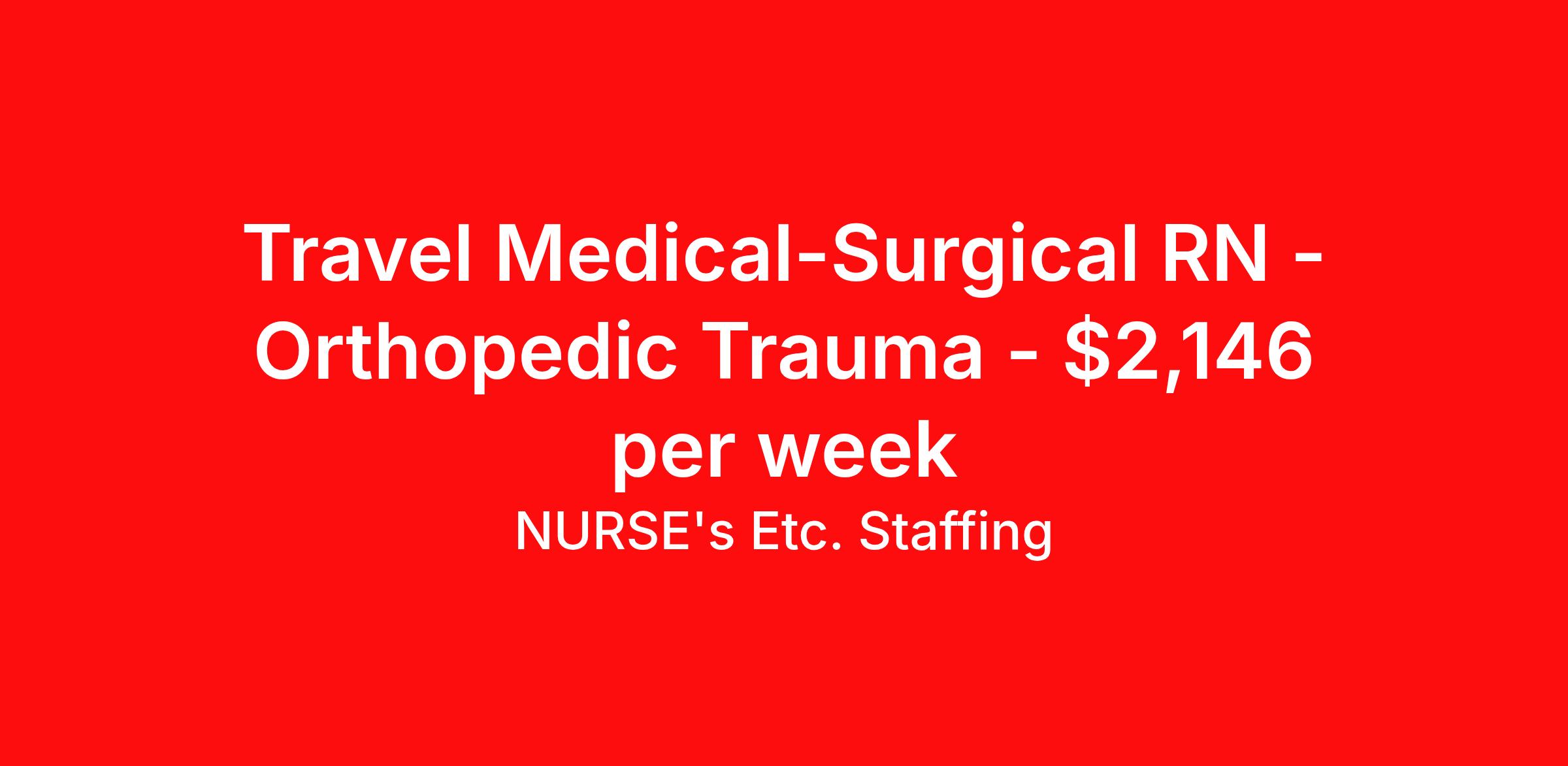 NURSE's Etc. Staffing is seeking a travel nurse RN Med Surg for a travel nursing job in Lafayette, Louisiana. Job Description & Requirements Specialty: Med Surg Discipline: RN Start Date: ASAP Duration: 8 weeks 36 hours per week Shift: 12 hours, nights Employment Type: Travel EducationRequired - Registered nurse diploma. Preferred - Associate or bachelor's degree in nursing. Experience Required - 2 years Certifications Required - Current registered nurse (RN) license in state of practice.Current Basic Life Support (BLS) certification from the American Heart Association.Preferred -Certification in clinical specialty area. NURSE's Etc. Staffing Job ID 505900. Pay package is based on 12 hour shifts and 36 hours per week (subject to confirmation) with tax-free stipend amount to be determined.