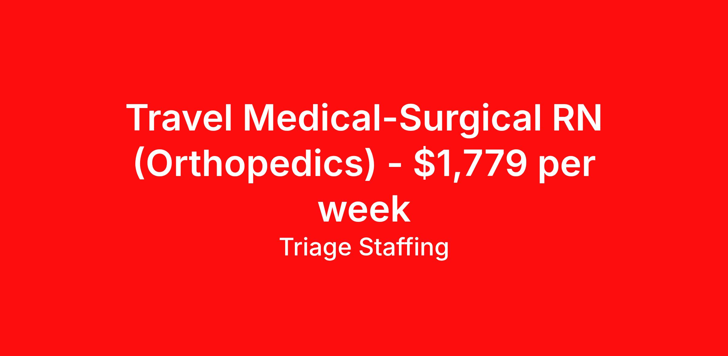 Triage Staffing is seeking a travel nurse RN Med Surg for a travel nursing job in Lafayette, Louisiana. Job Description & Requirements Specialty: Med Surg Discipline: RN Start Date: 04/13/2026 Duration: 13 weeks 36 hours per week Shift: 12 hours, nights Employment Type: Travel Travel Nursing: Med/Surg Lafayette Location: Lafayette Start Date: 4/13/2026 Shift Details: 12H Nights 36 hours per week Length: 13 WEEKS Apply for specific facility details.Med Surg RN Triage Staffing Job ID MNDJHTWM. Posted job title: Nursing: Med/Surg About Triage Staffing At Triage, we prefer to be real . Real about expectations—both ours and yours. Real about how a decision you make today could affect your tomorrows. Real about how compensation actually works. Real about how great—or grating—your next supervisor may be. Being real allows everyone at Triage to be ready . Ready to serve you with real honesty. So if that gig near the ocean is really no day at the beach, or that third shift comes with a second-class rate, we tell you. So you can be ready, too. We staff all five major divisions of acute care—nursing, lab, radiology, cardiopulmonary and rehab therapy, offering: - Competitive, custom pay packages - One point of contact for both travelers and facilities (per division) - A reliable recruiter who's got your back throughout your entire assignment - In-house compliance and accounting specialists - A clinical liaison team available 24/7 to offer medical and professional support and career development - A mentoring program that is run and managed by actual clinicians—yeah, you read that right - And more (because of course there’s more) Are we the biggest? No. Are we the best? That’s rather subjective, but we’re trying to be. Will we work like hell to get you as close to your idea of heaven as possible? Yes. Yes, we will. Benefits: Day One comprehensive, nationwide insurance plans for health, vision and dental and life—including a HSA option Day One 401(k) program with employer-matching contributions once eligible Facility cancelling protection—your time is money on and off-the-clock Guaranteed hours Weekly paychecks via direct deposit Earned vacation bonuses for time worked Paid holidays Employee assistance program (EAP)—your mental health is important, too Continuing education, certification and licensing reimbursement Workers comp—because accidents happen Top-rated professional liability insurance Company provided housing options Referral bonus—$750 in your pocket after they’ve completed a 13-week assignment