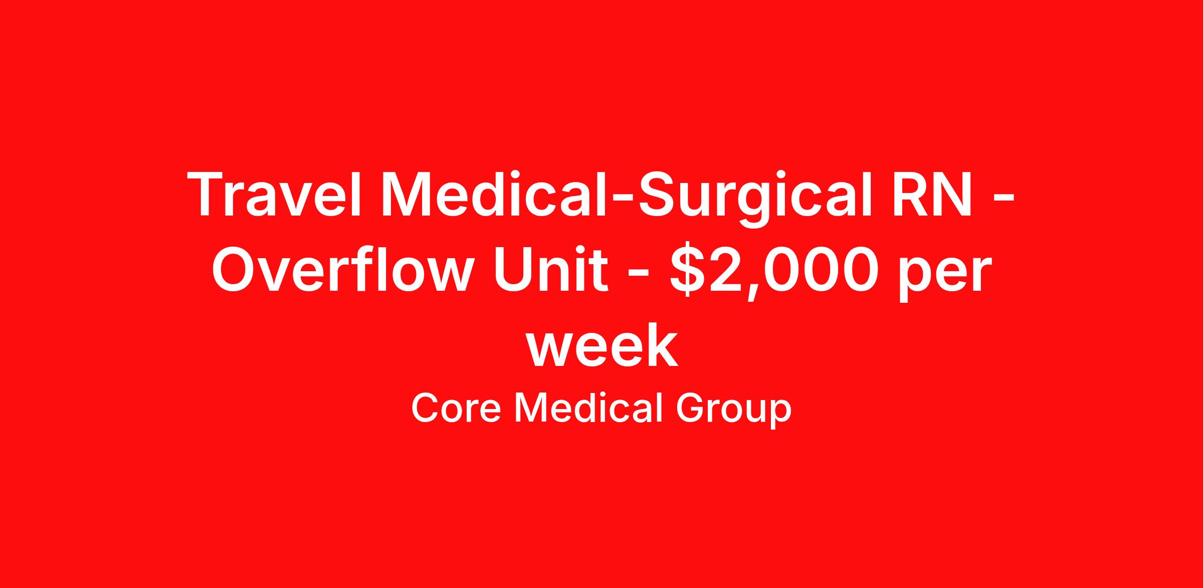 Core Medical Group is seeking a travel nurse RN Med Surg for a travel nursing job in Wheeling, West Virginia. Job Description & Requirements Specialty: Med Surg Discipline: RN Start Date: 03/23/2026 Duration: 13 weeks 36 hours per week Shift: 12 hours Employment Type: Travel Client in WV seeking Registered Nurse: Med/Surg for the following shift(s): Nights We are looking for a healthcare professional who is ready to provide exceptional patient care in this contract/travel role. Contract/travel assignments are typically 13 weeks, with potential to extend. Help us continue our mission to connect people, improve lives, and give back to the community by joining the CoreMedical Group team. When you work with CoreMedical Group, we put you first and treat you like family, supporting you every step of the way. CoreMedical Group is one of the largest healthcare staffing agencies in the country, with travel and contract positions located across the United States. Our recruiters will help you find the perfect job, whether it's across the country or across the street. In addition to dedicated, personalized support from your recruiter, when you work with CoreMedical Group you'll receive: Access to an extensive benefits package, including day 1 health, dental, and vision insurance, employer paid life insurance, a health reimbursement account, and more! Weekly paychecks with competitive pay packages Matching 401(k) benefits to help you save for retirement Licensure assistance and reimbursement to set you up for success on your contract Travel reimbursement and dedicated housing support while on assignment Referral cash bonuses when you connect us with other clinicians CoreMedical Group also offers you a free, all-inclusive vacation each year as our way of saying "thank you" for your hard work. Join other healthcare professionals on the annual Club CoreMed retreat and you'll see why our contract and travel professionals come back to us year after year! Your career is too valuable to tackle on your own. Let CoreMedical Group help you with your healthcare journey! *Estimate of weekly payments is intended for informational purposes and includes hourly wages, as well as reimbursements for meal & incidental expenses, and housing expenses incurred on behalf of the Company. Any benefits (medical/dental/vision) are in addition to the weekly pay. Please speak with your Recruiter for additional details. Estimated payments are subject to change until formal offer of assignment is made and accepted. Core Medical Group Job ID 1357140. Pay package is based on 12 hour shifts and 36 hours per week (subject to confirmation) with tax-free stipend amount to be determined. Posted job title: RN About Core Medical Group CoreMedical Group is one of the largest healthcare staffing agencies in the country. We have jobs nationwide in travel nursing, travel allied health, interim, locum tenens, and permanent placements! Join the staffing agency with Club CoreMed, the best perk in the industry - an all inclusive paid trip to a tropical resort! Benefits Weekly pay Holiday Pay Guaranteed Hours Continuing Education 401k retirement plan Pet insurance Company provided housing options Sick pay Wellness and fitness programs Mileage reimbursement Referral bonus Employee assistance programs Medical benefits Dental benefits Vision benefits Benefits start day 1 License and certification reimbursement Life insurance Discount program