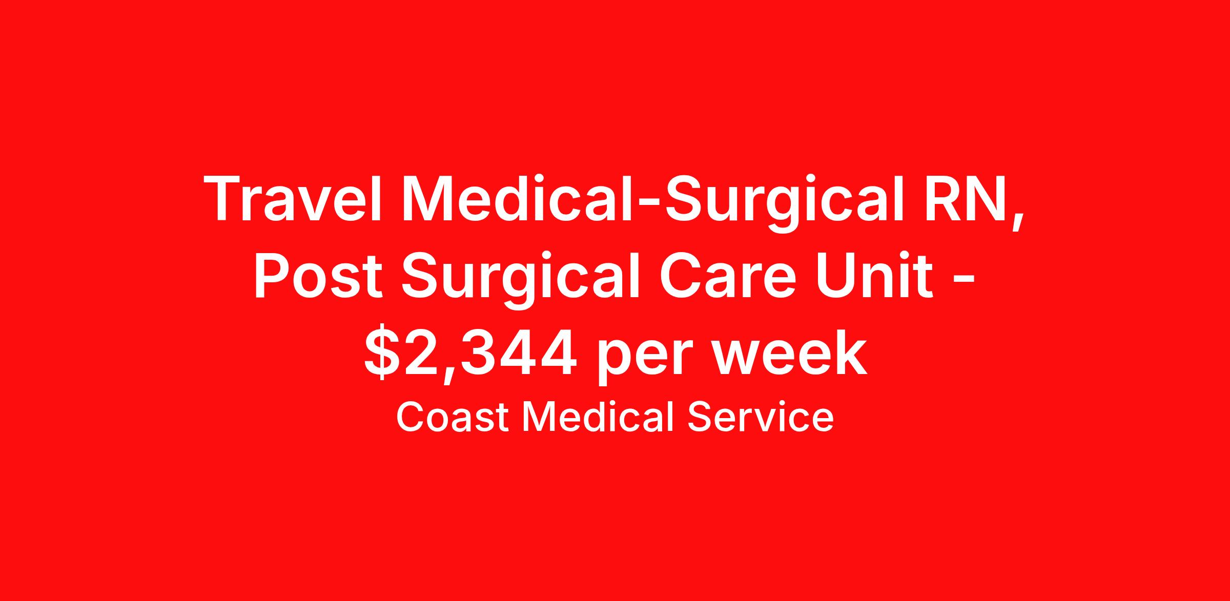 Coast Medical Service is seeking a travel nurse RN Med Surg for a travel nursing job in Wausau, Wisconsin. Job Description & Requirements Specialty: Med Surg Discipline: RN Start Date: 05/04/2026 Duration: 13 weeks 36 hours per week Shift: 12 hours, nights Employment Type: Travel Coast Medical Service is a nationwide travel nursing & allied healthcare staffing agency dedicated to providing an elite traveler experience for the experienced or first-time traveler. Coast is featured on Blue Pipes' 2023 Best Travel Agencies and named a 2022 Top Rated Healthcare Staffing Firm & 2023 First Half Top Rated Healthcare Staffing Firm by Great Recruiters. Please note that pay rate may differ for locally based candidates. Please apply here or contact a recruiter directly to learn more about this position & the facility, and/or explore others that may be of interest to you. We look forward to speaking with you! Coast Medical Services Job ID 36198489. Pay package is based on 12 hour shifts and 36.0 hours per week (subject to confirmation) with tax-free stipend amount to be determined. Posted job title: RN:Medical-Surgical,19:00:00-07:30:00