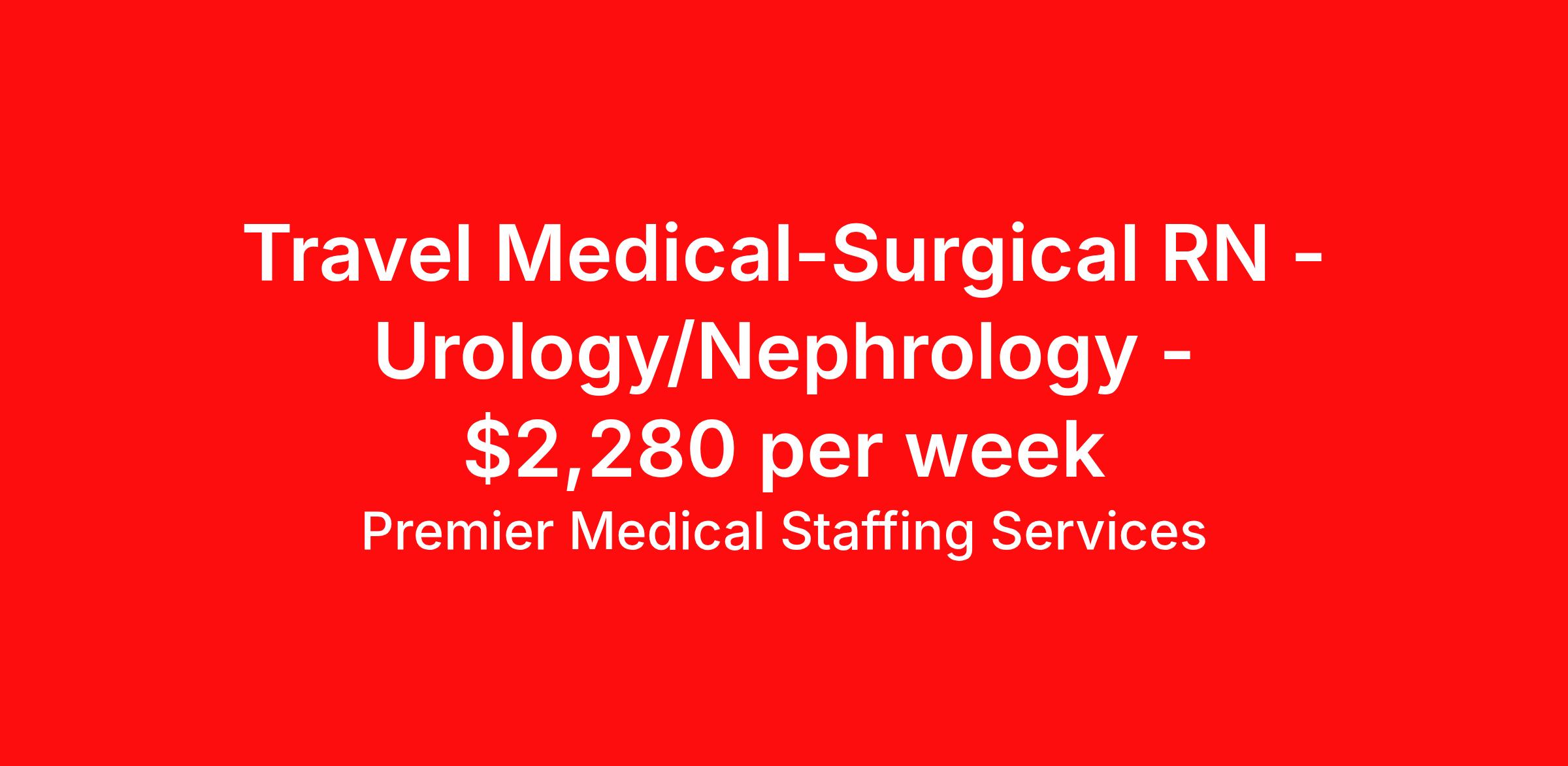 Premier Medical Staffing Services is seeking a travel nurse RN Med Surg for a travel nursing job in Springfield, Illinois. Job Description & Requirements Specialty: Med Surg Discipline: RN Start Date: 04/13/2026 Duration: 13 weeks 36 hours per week Shift: 12 hours Employment Type: Travel Premier Medical Staffing Job ID 620911. Pay package is based on 12 hour shifts and 36 hours per week (subject to confirmation) with tax-free stipend amount to be determined. Posted job title: RN Med/Surg About Premier Medical Staffing Services Premier Medical Staffing Services, LLC is a nationally expanding healthcare staffing firm for healthcare professionals and companies. We understand our clients’ need for highly qualified, expertly trained medical professionals and are passionate about helping clinicians find employment opportunities that fit their personality and needs. Able to accommodate the ever-changing needs of the healthcare landscape, we offer per-diem, contract and direct hire placements to support the unique needs of each industry sector. Premier Medical Staffing Services is Joint Commission Certified, a Military Spouse Employment Partner and is certified as a Women’s Business Enterprise. We are proudly nurse owned.