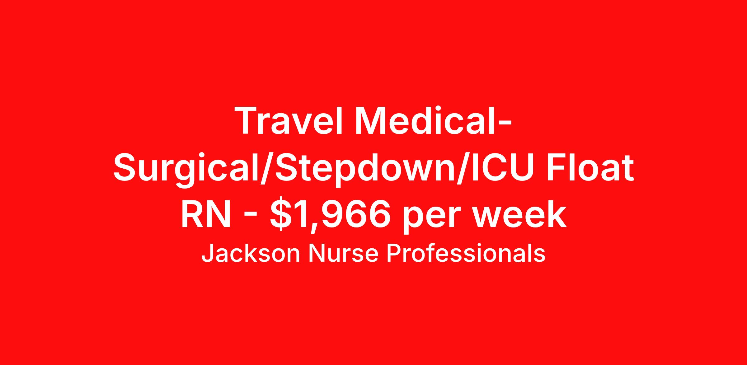 Jackson Nurse Professionals is seeking a travel nurse RN Float Med Surg for a travel nursing job in Boone, North Carolina. Job Description & Requirements Specialty: Med Surg Discipline: RN Start Date: 04/13/2026 Duration: 13 weeks 36 hours per week Shift: 12 hours, nights Employment Type: Travel At Jackson Nurse Professionals , we are dedicated to supporting travel nurses and helping you build a fulfilling nursing career. Whether you’re looking for your first or next travel nursing assignment, we specialize in connecting healthcare professionals with leading medical facilities. With a focus on personalized service and a wide range of opportunities, we make it easier than ever for nurses to find the right balance of adventure and professional growth. Qualifications: 2 years of recent experience in area of specialty listed on job Current BLS required (certifications vary by location – job may require ACLS) Valid license and/or certification in state of practice Valid Driver's License Background and drug screen Benefits: Full Medical, Dental and Vision Insurance 401(k) with Employer Match 24/7/365 Support from your Recruiter available by text, phone, or email Referral Bonus Program: Give $200, Get $500 for every referral Same Day Immediate Pay Access Certification & Licensure Reimbursement Apply today to experience the Jackson Nurse Professionals difference! Jackson Nurse Professionals Job ID 2473739. Pay package is based on 12 hour shifts and 36 hours per week (subject to confirmation) with tax-free stipend amount to be determined. About Jackson Nurse Professionals Filling critical needs in patient care, Jackson Nurse Professionals delivers cost-effective travel nurse staffing solutions to over 500 hospitals, outpatient clinics, and home health clients nationwide. Awarded Best of Staffing - Talent and Client 2024, and rated as a Top Workplace 2023 by the Orlando Sentinel, Jackson Nurse Professionals goes the extra mile to provide travel nurses the career they deserve, while providing clients with a large range of highly skilled nurses to fill short, long-term, and temporary assignments. As a member of Jackson Healthcare’s family of award-winning staffing companies, we’re part of a growing community that’s impacting 10 million patients nationwide. Join our mission to improve the delivery of patient care, and the lives of everyone we touch.
