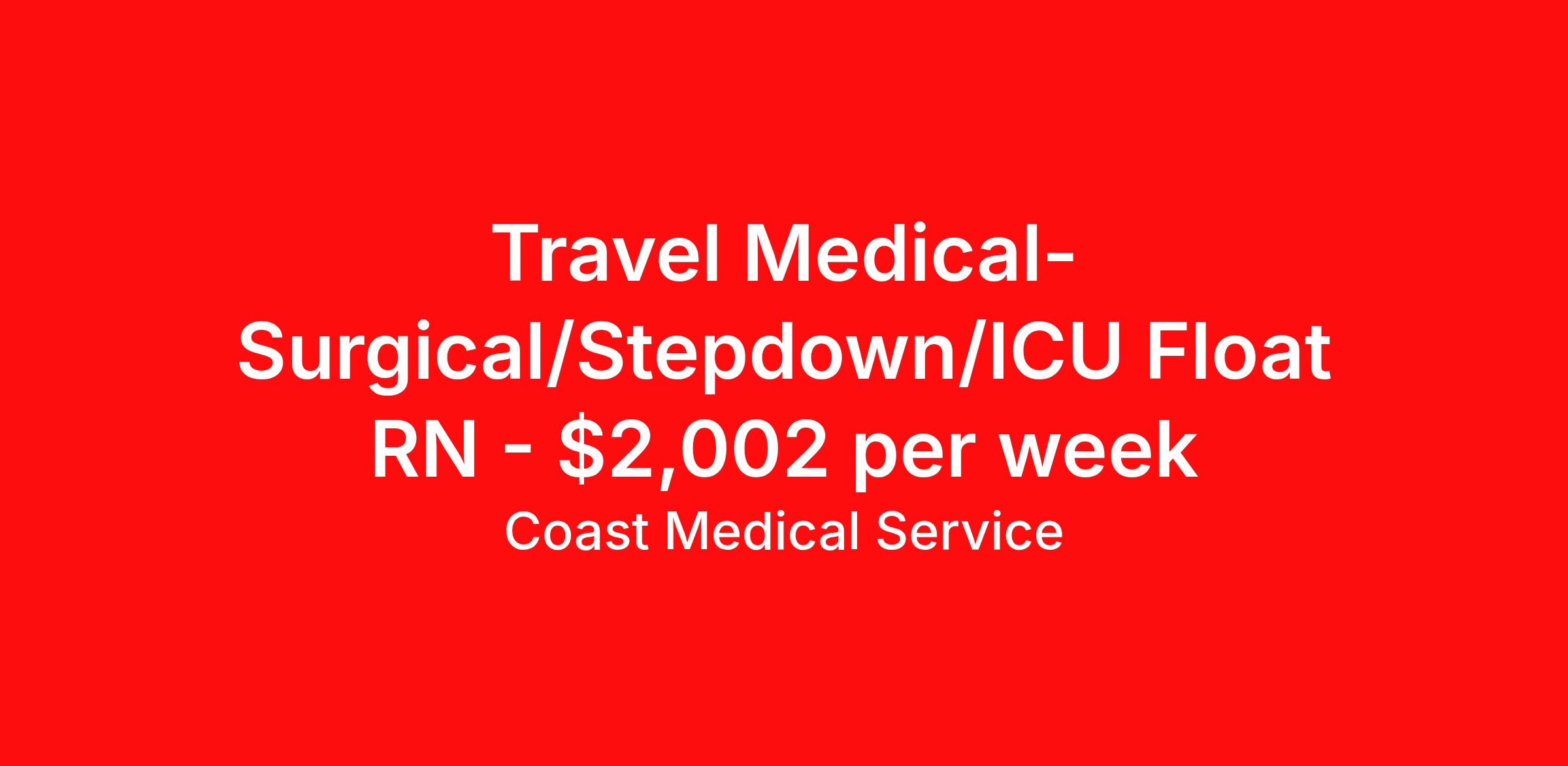 Coast Medical Service is seeking a travel nurse RN Float Med Surg for a travel nursing job in Boone, North Carolina. Job Description & Requirements Specialty: Med Surg Discipline: RN Start Date: 04/13/2026 Duration: 13 weeks 36 hours per week Shift: 12 hours, nights Employment Type: Travel Coast Medical Service is a nationwide travel nursing & allied healthcare staffing agency dedicated to providing an elite traveler experience for the experienced or first-time traveler. Coast is featured on Blue Pipes' 2023 Best Travel Agencies and named a 2022 Top Rated Healthcare Staffing Firm & 2023 First Half Top Rated Healthcare Staffing Firm by Great Recruiters. Please note that pay rate may differ for locally based candidates. Please apply here or contact a recruiter directly to learn more about this position & the facility, and/or explore others that may be of interest to you. We look forward to speaking with you! Coast Medical Services Job ID 36140889. Pay package is based on 12 hour shifts and 36.0 hours per week (subject to confirmation) with tax-free stipend amount to be determined. Posted job title: RN:Medical-Surgical,19:00:00-07:30:00