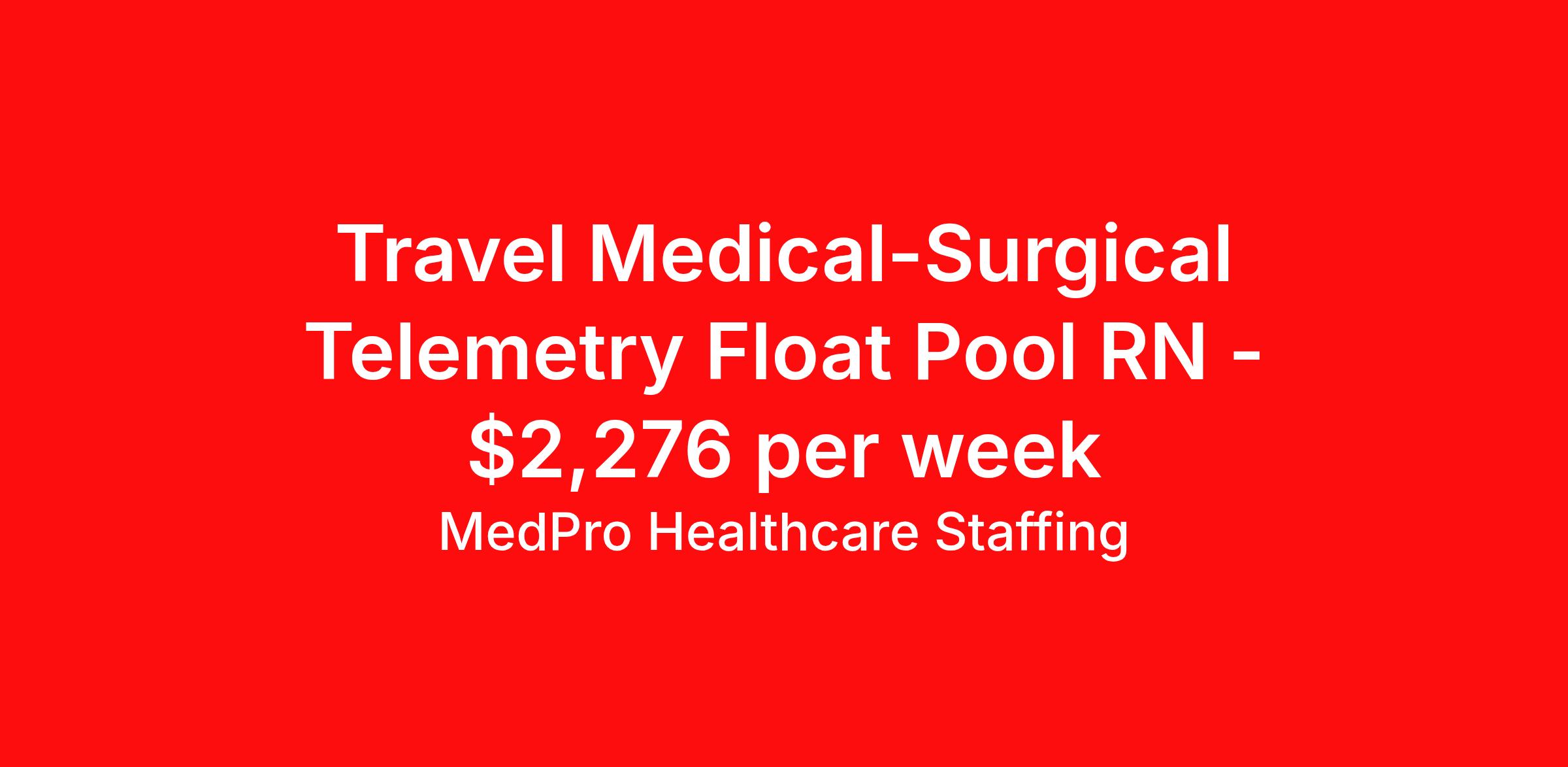 MedPro Healthcare Staffing is seeking a travel nurse RN Float Med Surg / Telemetry for a travel nursing job in Garden City, Kansas. Job Description & Requirements Specialty: Med Surg / Telemetry Discipline: RN Start Date: 04/13/2026 Duration: 13 weeks 36 hours per week Shift: 12 hours, nights Employment Type: Travel MedPro Healthcare Staffing , a Joint Commission-certified staffing agency, is seeking a quality Med-Surg registered nurse (RN) for a travel assignment with one of our top healthcare clients. Requirements Active RN License Degree from accredited nursing program BLS Certifications Eighteen months of recent experience in an Acute Care Med/Surg setting Other requirements to be determined by our client facility Benefits Weekly pay and direct deposit Full coverage of all credentialing fees Private housing or housing allowance Group Health insurance for you and your family Company-paid life and disability insurance Travel reimbursement 401(k) matching Unlimited Referral Bonuses up to $1,000 Duties Responsibilities Med-Surg Nurses (RN) provide care for primarily adult patients before and after surgical procedures; they also attend to those who are being treated with pharmaceuticals to manage illness. Due to the broad range of medical conditions Med/Surg Nurses will encounter, they must be well-versed in a large variety of health conditions. Complete assignments made by physicians. Provide routine treatment and post-surgical care. Assess changes in patient's health status and perform various treatments. Administer medication. Meticulous documentation as to medication and treatment administration to ensure continuity of care between nursing staff, physicians and other treatment team members. About Agency MedPro Healthcare Staffing is a Joint Commission certified provider of contract staffing services. Since 1983, we have placed nursing and allied travelers in top healthcare facilities nationwide. Join us today for your very own MedPro Experience®. If qualified and interested, please call for immediate consideration. MedPro Staffing is an Equal Opportunity Employer. All applicants will be considered for employment without attention to race, color, religion, national origin, age, sex, disability, marital status or veteran status. Key Words: Registered Nurse, RN, Medical-Surgical, Travel Nurse, Contract Nurse, Agency Nurse, Agency RN, RN-MS, RN- Medical Surgical, Travel RN, Contract, Nursing, RN Med-Surg, Travel Nursing *Weekly payment estimates are intended for informational purposes only and include a gross estimate of hourly wages and reimbursements for meal, incidental, and housing expenses. Your recruiter will confirm your eligibility and provide additional details. MedPro Job ID a0Fcx00000CCMKPEA5. Pay package is based on 12 hour shifts and 36 hours per week (subject to confirmation) with tax-free stipend amount to be determined. Posted job title: Med-Surg/Telemetry Registered Nurse Nursing: Med Surg/Tele. About MedPro Healthcare Staffing At MedPro Healthcare Staffing , we believe no one cares more for caregivers than we do. Our mission is simple: you focus on your patients, and we’ll take care of the rest. As a Joint Commission-certified leader in temporary and contract healthcare staffing since 1983, MedPro has proudly connected nursing and allied travelers with top healthcare facilities across the nation. With thousands of job opportunities available nationwide, we make it easy to find assignments that align with your goals and lifestyle. Our on-staff clinical support team—alongside a compassionate group of experienced recruiters—provides hands-on guidance every step of the way. From Day 1 medical benefits and a 401(k) plan to personalized career support, we’re committed to ensuring every professional we serve feels valued, cared for, and empowered to succeed. Guided by a CEO who is a Registered Nurse, MedPro is built on a foundation of clinical insight and genuine compassion for the caregiving community. Through The MedPro Experience® , we deliver travel assignments that are rewarding, memorable, and designed to help you DREAM big, EXPLORE often, and ACHIEVE greatness. Benefits Day 1 medical, dental, and vision benefits for you and your family Weekly pay and direct deposit Unlimited Referral Bonuses starting at $500 On Staff Clinical Support Team Access to nationwide travel assignments MPX Mobile app -24/7 real-time access to jobs, credentials, assignment details, and more Full coverage of all credentialing fees Private housing or housing allowance Tax Free Per Diems, Housing Stipends and Travel Reimbursements Company-paid life and disability insurance Travel reimbursement 401(k) matching Benefits Weekly pay Referral bonus Employee assistance programs