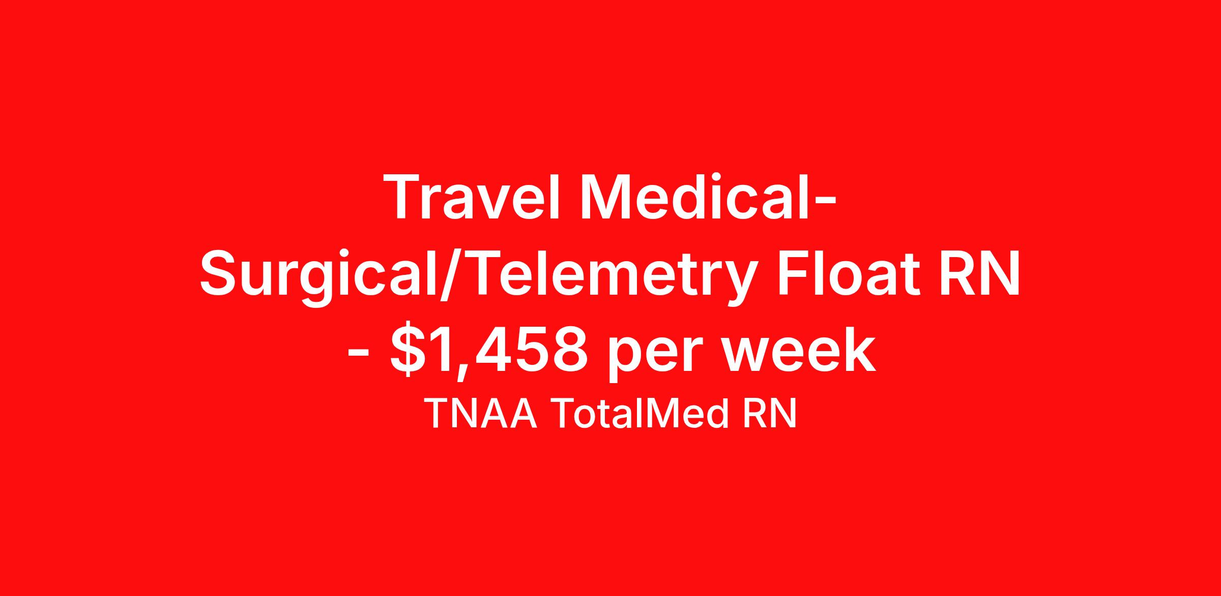 TNAA TotalMed RN is seeking a travel nurse RN Float Med Surg for a travel nursing job in Augusta, Georgia. Job Description & Requirements Specialty: Med Surg Discipline: RN Duration: 12 weeks 36 hours per week Shift: 12 hours, days Employment Type: Travel We're looking for Medical Surgical RNs for an immediate travel nurse opening in Augusta, GA. The right RN should have 1-2 years recent acute care experience. Read below for more requirements. As a MedSurg RN, you will conduct patient assessments and prioritize data collection based on patients' immediate conditions or needs. MedSurg RNs perform ongoing assessments and appropriate treatments as ordered by a physician. Documenting patient findings and providing education and support to patients' families is essential to this travel nurse position. As a Medical Surgical Travel Nurse, you should be prepared to perform the following tasks: Provide bedside care for a variety of patients, including pre- and post-op patients. Prepare, administer and record prescribed medication, reporting any adverse reactions to treatment. Change dressings, insert catheters and start IVs. Prepares equipment and aids physician during examination and treatment of patient. Educates patients on surgical procedures. Participates in discharge planning and initiates patient education plan as prescribed by physician. Medical Surgical Travel Nurses should be able to stand and walk for long periods of time, as well as bend, lean and stoop without difficulty. RNs should be able to easily lift 20 pounds. Moving or lifting of patients may require lifting of up to 50 pounds at times. RNs will work in a fast-paced environment treating patients that may be confused, agitated, and/or uncooperative. Requirements*: BLS, 1 Year * Additional certifications may be required before beginning an assignment. TotalMed Travel Job ID 1389282. Pay package is based on 12 hour shifts and 36 hours per week (subject to confirmation) with tax-free stipend amount to be determined. Posted job title: Medical/Surgical - MedSurg RN - Travel Nurse About TNAA TotalMed RN TotalMed is a Top Ten, travel nursing and healthcare staffing agency with the mission of igniting purpose in healthcare. The organization staffs nurses, therapists, pharmacists, and other clinicians of all specialties in all 50 states. They offer local and travel jobs and match caregivers with the right organization to assist both facilities and patients. As an organization, they focus on putting highly-skilled staff into facilities to ensure adequate staffing for a better patient experience. TotalMed specializes in recruiting and placing healthcare professionals in travel, PRN, and permanent positions across the country in Nursing and Allied Health. Throughout 2020, the organization filled roles at even the most short-staffed facilities during the most challenging time in healthcare. By matching the right travel healthcare professional with the right organization, TotalMed continues to offer a lifeline to facilities and their patients. Benefits Weekly pay Guaranteed Hours Continuing Education 401k retirement plan Sick pay Wellness and fitness programs Referral bonus Employee assistance programs Medical benefits Dental benefits Vision benefits Benefits start day 1