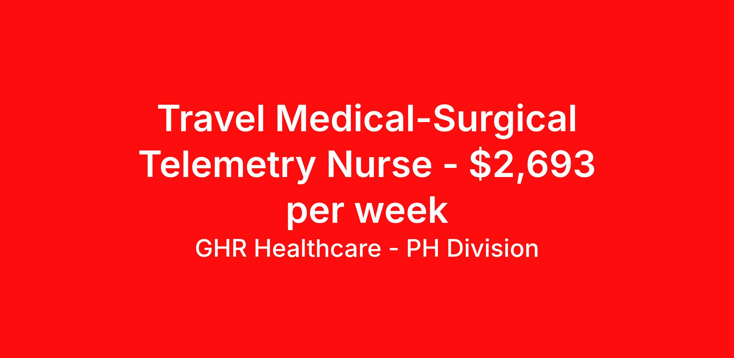 GHR Healthcare - PH Division is seeking a travel nurse RN Med Surg / Telemetry for a travel nursing job in Cambridge, Massachusetts. Job Description & Requirements Specialty: Med Surg / Telemetry Discipline: RN Start Date: ASAP Duration: 8 weeks 36 hours per week Shift: 12 hours Employment Type: Travel Planet Healthcare Job ID 74127150. Pay package is based on 12 hour shifts and 36 hours per week (subject to confirmation) with tax-free stipend amount to be determined. About GHR Healthcare - PH Division For over 30 years, GHR Healthcare has been the bridge between healthcare professionals and the facilities that need them nationwide. We're committed to uncovering your ideal fit, supported by GHR's dedication to competitive compensation, transparent communication, and a devoted team that genuinely cares about your career journey. You can trust us to stand by your side as your advocate, confidante, and partner in advancing your career. At GHR, care and consideration are at the heart of everything we do. Visit ghrhealthcare.com to learn more.