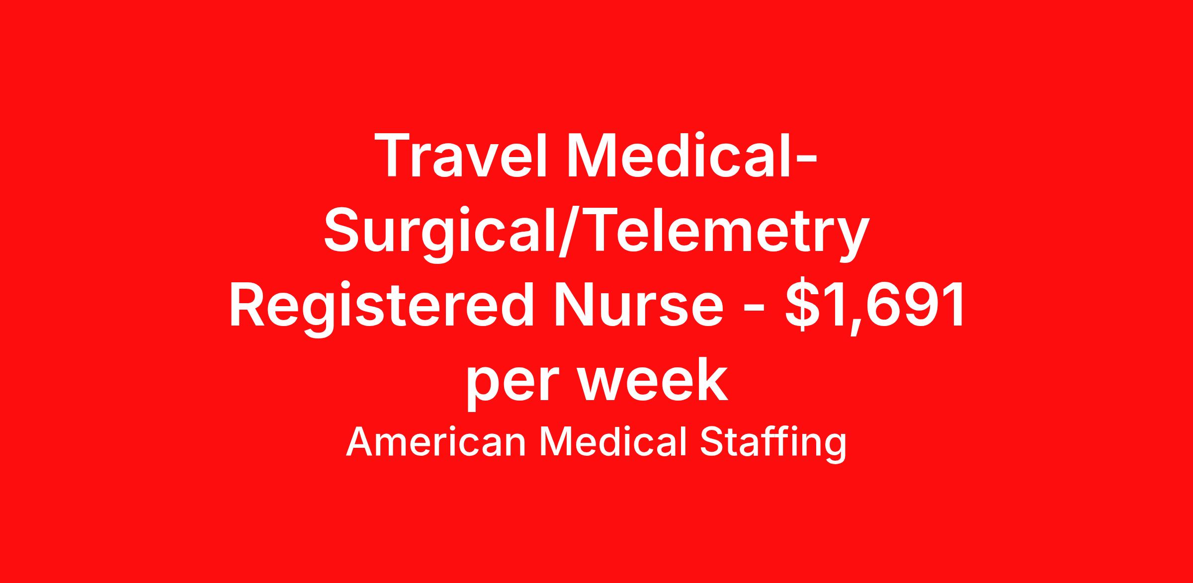 American Medical Staffing is seeking a travel nurse RN Med Surg / Telemetry for a travel nursing job in Washington, District of Columbia. Job Description & Requirements Specialty: Med Surg / Telemetry Discipline: RN Start Date: 04/06/2026 Duration: 13 weeks 36 hours per week Shift: 12 hours, rotating Employment Type: Travel We’re living in the new normal. Lives and careers look different today. So why shouldn’t you have a role that delivers excitement, fewer restrictions, and brings you closer to loved ones? At American Medical Staffing (AMS), we believe in supporting the pioneers who embody the sense of adventure each new placement brings and we’re looking for a RN: MedSurg/Tele for our Hospital contract assignment. Job Title : RN: MedSurg/Tele Location : Washington, District of Columbia Pay Range : Competitive, Negotiable, with Weekly Pay Schedule : Rotating Shifts, 07:00:00-19:00:00, 12.00-3 Contract Length : 13 Weeks Requirements : · 2 years of experience as a RN · Qualified applicants MUST have at least 2 years of experience in the MedSurg/Tele · Valid RN license · Be willing to obtain District of Columbia licensure Why Choose American Medical Staffing? · Day-One Benefits : Medical, dental, and vision plans with no waiting period. · Wellness PTO : Build 1 or 2 weeks of paid time off into your contract. · Hotel Discounts : Save up to 60% on hotel bookings with access to 700,000 discounted properties. · Loyalty Program : Earn financial incentives automatically based on hours worked and assignment type. · Referral Program : $500 for you and $500 for each referral after 450 hours—no limits. · Working Advantage : Access exclusive discounts on retail, entertainment, and travel. · Scrub Discount : 20% off all scrubs through our customized AMS store. · Retirement Plans : 401(k) options to help you plan for the future. · Compliance & Credentialing Support : Let us handle the logistics so you can focus on patient care. Responsibilities · Deliver specialized care to patients across a variety of acute and subacute units. · Work closely with a multidisciplinary team of healthcare professionals to provide comprehensive and compassionate care. · Monitor patient conditions, administer treatments and document outcomes. · Advocate for the best possible patient experience while supporting recovery, safety, and continuity of care. Apply now to take the next step in your journey. American Medical Staffing is an Equal Employment Opportunity Employer and does not discriminate on the basis of race, color, religion, sex, national origin, sexual orientation, gender identity, disability, age, or any other non-merit factor. American Medical Staffing Job ID 108178. Pay package is based on 12 hour shifts and 36.0 hours per week (subject to confirmation) with tax-free stipend amount to be determined. Posted job title: RN:MedSurg/Tele,07:00:00-19:00:00 About American Medical Staffing American Medical Staffing is a staffing agency headquartered in Baltimore, MD. Our goal is to CREATE an extraordinary experience for our health care professionals. Our roots are nurse owned and operated so we know what clinicians want - lots of options, a smooth and informed placement process, competitive and accurate pay, great customer service and responsiveness to requests, and advocacy when there is an issue. When AMS was founded in 2001, we started our company with a mission to be a better agency than our competitors. We have always put a heavy emphasis into what is best for our employees, not necessarily just our clients or our company. You are not an expense as you may be to a hospital; you are an asset. We take employee advocacy seriously; you are not just a number to us. The end result is that you don`t work for us; we work for you. Since starting in Baltimore, MD, we continue to grow throughout the country. Check out our industry leading reviews on Google and Indeed to see how much our clinicians enjoy working with us! · Benefits: AMS offers an array of benefits for any employee working 30 hours or more! Those eligible employees who choose to participate will pay the premiums with deductions from their pre-tax earnings. We offer a complete benefits package including Health Insurance, 401K with up to 2% match, Life, Vision, and Dental. From health and wellness support, financial or legal needs, or help with life's everyday challenges, our Employee Assistance Program provides you with resources, services and discounts to help you manage your unique concerns and save time, energy and money. We also offer additional Employee Perks that you can enjoy as an AMS employee: Scrubin – Uniform Discounts Working Advantage – unlimited access to thousands of exclusive discounts and special offers nationwide for theme parks, shows, tours, attractions, sports, concerts, hotels, rental cars, retail gift cards, movie tickets and much more Hotel Engine - Save up to 60% when booking hotel rooms, with access to more than 700,000 deeply discounted hotels worldwide. Discounted Pet Insurance Wellness Program, including fitness, nutrition and financial wellness Betterhelp - 1 month of free therapy, followed by a discounted rate for our Healthcare Professionals and their family members. Win Win Referral Bonus - $500 for you, and $500 for them! Benefits 401k retirement plan Life insurance Medical benefits Dental benefits Vision benefits