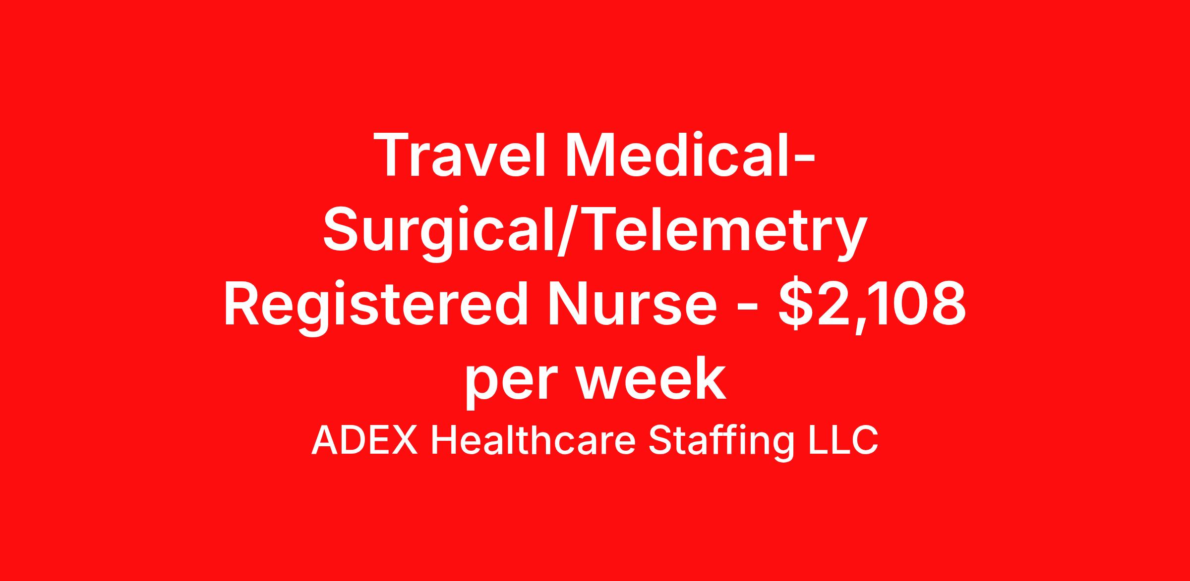 ADEX Healthcare Staffing LLC is seeking a travel nurse RN Telemetry for a travel nursing job in Rochester, New York. Job Description & Requirements Specialty: Telemetry Discipline: RN Start Date: 04/07/2026 Duration: 13 weeks 36 hours per week Shift: 12 hours, days Employment Type: Travel RN Position Job Notes: Travel or Local Registered Nurse needed for ASAP start. A minimum of 2 years of recent hospital bedside experience is required. Candidates must be able to start within 5 weeks. Opportunity for extension upon successful completion of the initial assignment. $750 referral bonus available. Opportunity: RN - Med Surg Tele Job Details: • Work day shifts from 7:00 AM to 7:00 PM • 13-week contract assignment • Every other weekend requirement • Must maintain patient ratio of 1:5 to 1:7 for Med Surg patients • Floating to other units required • Must have 1 year of nursing experience • New York license required in hand - no exceptions • Must live more than 75 miles from facility (locals not accepted) • Epic charting experience is a hard requirement • Required certifications: BLS and NIHSS • Scrub color requirements: any combination of navy and white • Skills include cardiac monitoring, interpretation and management of dysrhythmias, use of Rapid Response/Code teams, peripheral line care and management, respiratory support including nasal cannula and oxygen administration, and isolation precautions • Pre-start modules required (billable up to 5 hours, may total 10 hours) • Must have no more than 10 days of requested time off during contract • First-time travelers accepted Facility: This tertiary care hospital is a comprehensive healthcare facility with 528 total staffed beds, providing advanced medical services and specialized care to the community. The facility utilizes Epic charting systems and maintains high standards for patient care across multiple specialty units. The organization offers extensive support services and operates as a major regional healthcare provider with comprehensive emergency response capabilities. Location: Rochester, NY Rochester offers a vibrant city atmosphere with rich cultural attractions, excellent dining, and beautiful parks along the Genesee River. The area provides a perfect blend of urban amenities and outdoor recreation opportunities, with proximity to the Finger Lakes region and affordable cost of living compared to other major metropolitan areas. Adex Job ID 3218719. Pay package is based on 12 hour shifts and 36 hours per week (subject to confirmation) with tax-free stipend amount to be determined. About ADEX Healthcare Staffing LLC ADEX has been placing healthcare professionals across the US since 2004. Originally founded in Atlanta, GA, the company's headquarters are now located in Tampa, FL. JCAHO certified since 2009. Benefits Referral bonus