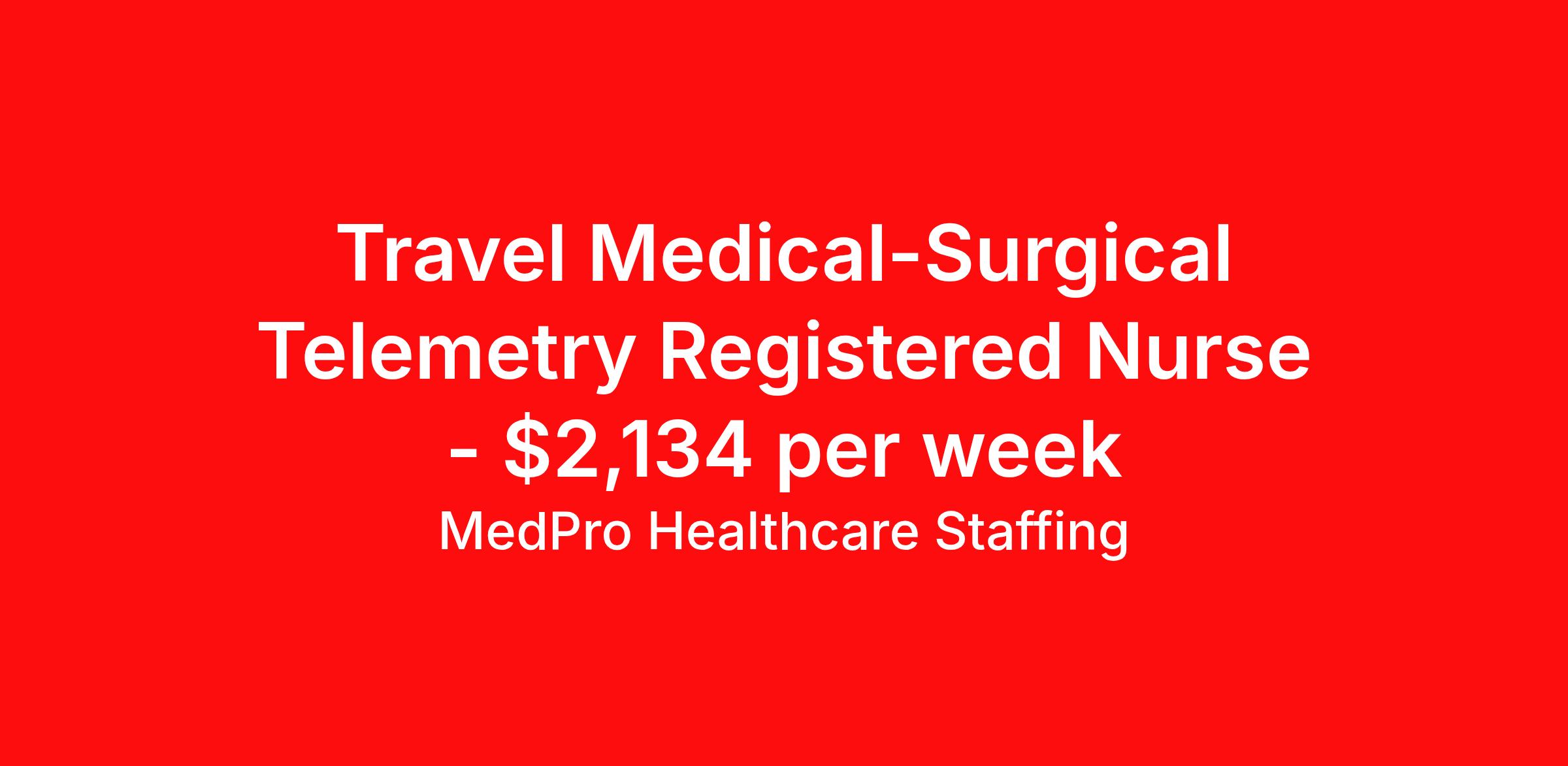 MedPro Healthcare Staffing is seeking a travel nurse RN Med Surg / Telemetry for a travel nursing job in Lafayette, Louisiana. Job Description & Requirements Specialty: Med Surg / Telemetry Discipline: RN Start Date: 04/13/2026 Duration: 13 weeks 36 hours per week Shift: 12 hours, nights Employment Type: Travel MedPro Healthcare Staffing , a Joint Commission-certified staffing agency, is seeking a quality Med-Surg registered nurse (RN) for a travel assignment with one of our top healthcare clients. Requirements Active RN License Degree from accredited nursing program BLS Certifications Eighteen months of recent experience in an Acute Care Med/Surg setting Other requirements to be determined by our client facility Benefits Weekly pay and direct deposit Full coverage of all credentialing fees Private housing or housing allowance Group Health insurance for you and your family Company-paid life and disability insurance Travel reimbursement 401(k) matching Unlimited Referral Bonuses up to $1,000 Duties Responsibilities Med-Surg Nurses (RN) provide care for primarily adult patients before and after surgical procedures; they also attend to those who are being treated with pharmaceuticals to manage illness. Due to the broad range of medical conditions Med/Surg Nurses will encounter, they must be well-versed in a large variety of health conditions. Complete assignments made by physicians. Provide routine treatment and post-surgical care. Assess changes in patient's health status and perform various treatments. Administer medication. Meticulous documentation as to medication and treatment administration to ensure continuity of care between nursing staff, physicians and other treatment team members. About Agency MedPro Healthcare Staffing is a Joint Commission certified provider of contract staffing services. Since 1983, we have placed nursing and allied travelers in top healthcare facilities nationwide. Join us today for your very own MedPro Experience®. If qualified and interested, please call for immediate consideration. MedPro Staffing is an Equal Opportunity Employer. All applicants will be considered for employment without attention to race, color, religion, national origin, age, sex, disability, marital status or veteran status. Key Words: Registered Nurse, RN, Medical-Surgical, Travel Nurse, Contract Nurse, Agency Nurse, Agency RN, RN-MS, RN- Medical Surgical, Travel RN, Contract, Nursing, RN Med-Surg, Travel Nursing *Weekly payment estimates are intended for informational purposes only and include a gross estimate of hourly wages and reimbursements for meal, incidental, and housing expenses. Your recruiter will confirm your eligibility and provide additional details. MedPro Job ID a0Fcx00000HtlPVEAZ. Pay package is based on 12 hour shifts and 36 hours per week (subject to confirmation) with tax-free stipend amount to be determined. Posted job title: Med-Surg/Telemetry Registered Nurse Nursing: Med Surg/Tele. About MedPro Healthcare Staffing At MedPro Healthcare Staffing , we believe no one cares more for caregivers than we do. Our mission is simple: you focus on your patients, and we’ll take care of the rest. As a Joint Commission-certified leader in temporary and contract healthcare staffing since 1983, MedPro has proudly connected nursing and allied travelers with top healthcare facilities across the nation. With thousands of job opportunities available nationwide, we make it easy to find assignments that align with your goals and lifestyle. Our on-staff clinical support team—alongside a compassionate group of experienced recruiters—provides hands-on guidance every step of the way. From Day 1 medical benefits and a 401(k) plan to personalized career support, we’re committed to ensuring every professional we serve feels valued, cared for, and empowered to succeed. Guided by a CEO who is a Registered Nurse, MedPro is built on a foundation of clinical insight and genuine compassion for the caregiving community. Through The MedPro Experience® , we deliver travel assignments that are rewarding, memorable, and designed to help you DREAM big, EXPLORE often, and ACHIEVE greatness. Benefits Day 1 medical, dental, and vision benefits for you and your family Weekly pay and direct deposit Unlimited Referral Bonuses starting at $500 On Staff Clinical Support Team Access to nationwide travel assignments MPX Mobile app -24/7 real-time access to jobs, credentials, assignment details, and more Full coverage of all credentialing fees Private housing or housing allowance Tax Free Per Diems, Housing Stipends and Travel Reimbursements Company-paid life and disability insurance Travel reimbursement 401(k) matching Benefits Weekly pay Referral bonus Employee assistance programs