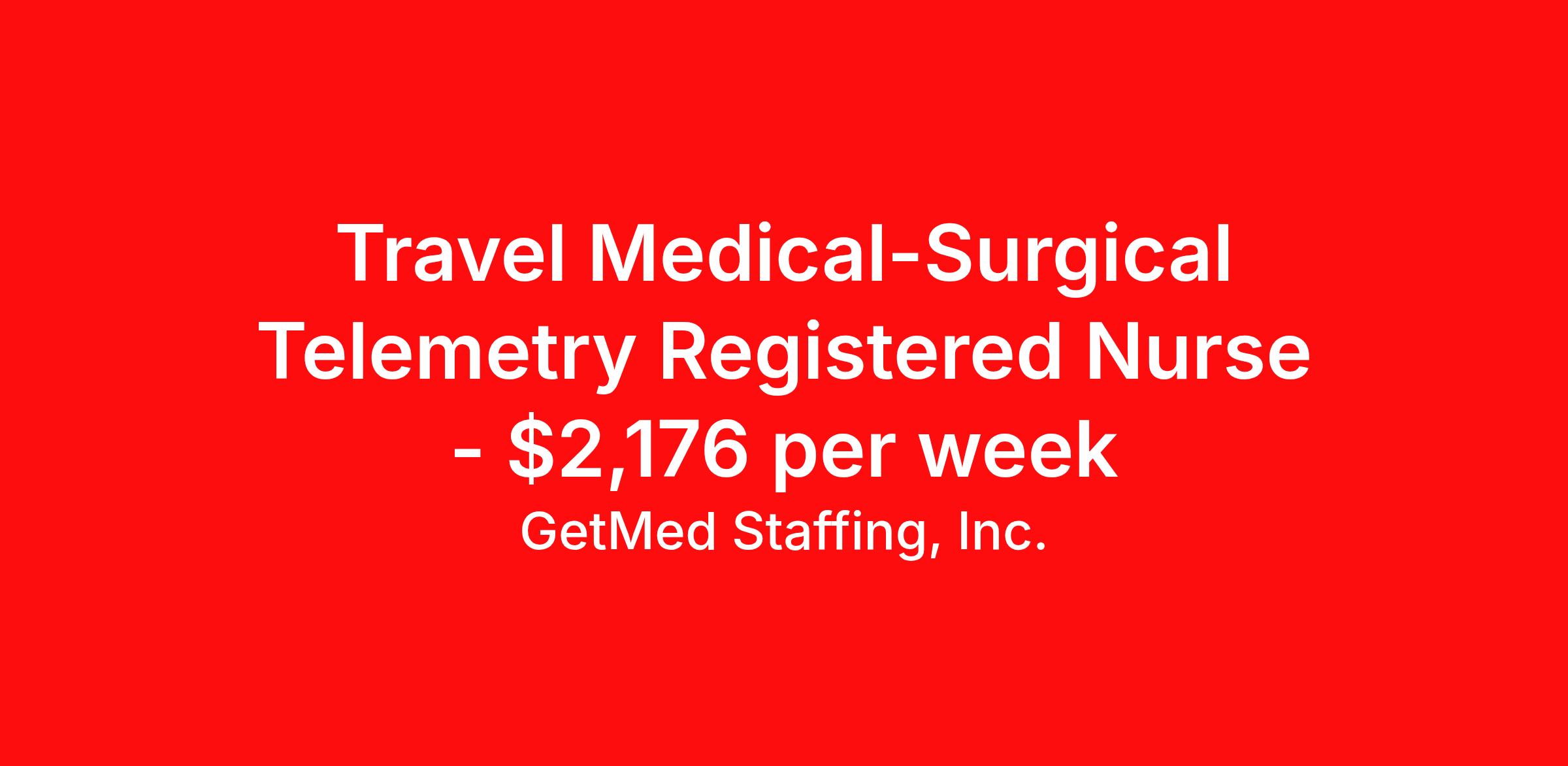 GetMed Staffing, Inc. is seeking a travel nurse RN Med Surg / Telemetry for a travel nursing job in Morgantown, West Virginia. Job Description & Requirements Specialty: Med Surg / Telemetry Discipline: RN Start Date: 04/06/2026 Duration: 13 weeks 48 hours per week Shift: 12 hours, nights Employment Type: Travel GetMed Staffing is searching for a strong MedSurg RN to assist our traveler-friendly client. A minimum of 1-2 years of experience is required. Traveling with GetMed Staffing offers the unique opportunity to gain diverse experiences, both personally and professionally. Gain experience that matters. GetMed Staffing, Inc. Job ID 36174101. Pay package is based on 12 hour shifts and 48.0 hours per week (subject to confirmation) with tax-free stipend amount to be determined. Posted job title: RN:MedSurg,19:00:00-07:00:00 About GetMed Staffing, Inc. We are a diversity owned company, specializing in healthcare recruiting services. We truly understand how important a healthcare travelers' relationship is with their recruiter, as well as our relationship is with our healthcare facilities. We recognize that the needs of our healthcare travelers can vary, and therefore we provide the personalized touch necessary to ensure a successful travel assignment each and every time. Our healthcare facilities and clients benefit from us putting our healthcare travelers first. GetMed Staffing is excited to be a leader within the industry by focusing on providing healthcare travelers with more choices and possibilities as they plan for their next healthcare travel assignment. Benefits Life insurance Medical benefits Dental benefits Vision benefits 401k retirement plan
