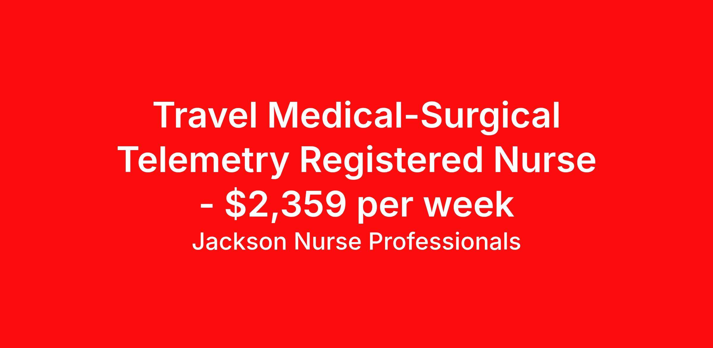 Jackson Nurse Professionals is seeking a travel nurse RN Med Surg / Telemetry for a travel nursing job in Morgantown, West Virginia. Job Description & Requirements Specialty: Med Surg / Telemetry Discipline: RN Start Date: 04/06/2026 Duration: 13 weeks 48 hours per week Shift: 12 hours, nights Employment Type: Travel At Jackson Nurse Professionals , we are dedicated to supporting travel nurses and helping you build a fulfilling nursing career. Whether you’re looking for your first or next travel nursing assignment, we specialize in connecting healthcare professionals with leading medical facilities. With a focus on personalized service and a wide range of opportunities, we make it easier than ever for nurses to find the right balance of adventure and professional growth. Qualifications: 2 years of recent experience in area of specialty listed on job Current BLS required (certifications vary by location – job may require ACLS) Valid license and/or certification in state of practice Valid Driver's License Background and drug screen Benefits: Full Medical, Dental and Vision Insurance 401(k) with Employer Match 24/7/365 Support from your Recruiter available by text, phone, or email Referral Bonus Program: Give $200, Get $500 for every referral Same Day Immediate Pay Access Certification & Licensure Reimbursement Apply today to experience the Jackson Nurse Professionals difference! Jackson Nurse Professionals Job ID 2476039. Pay package is based on 12 hour shifts and 48 hours per week (subject to confirmation) with tax-free stipend amount to be determined. About Jackson Nurse Professionals Filling critical needs in patient care, Jackson Nurse Professionals delivers cost-effective travel nurse staffing solutions to over 500 hospitals, outpatient clinics, and home health clients nationwide. Awarded Best of Staffing - Talent and Client 2024, and rated as a Top Workplace 2023 by the Orlando Sentinel, Jackson Nurse Professionals goes the extra mile to provide travel nurses the career they deserve, while providing clients with a large range of highly skilled nurses to fill short, long-term, and temporary assignments. As a member of Jackson Healthcare’s family of award-winning staffing companies, we’re part of a growing community that’s impacting 10 million patients nationwide. Join our mission to improve the delivery of patient care, and the lives of everyone we touch.