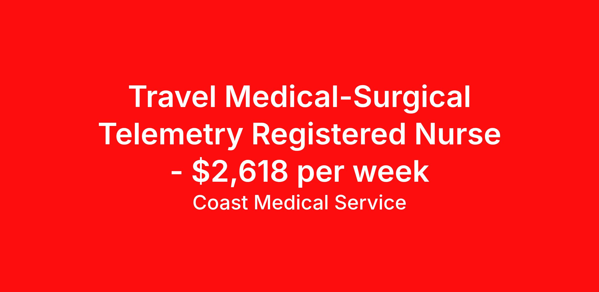 Coast Medical Service is seeking a travel nurse RN Med Surg / Telemetry for a travel nursing job in Fayetteville, North Carolina. Job Description & Requirements Specialty: Med Surg / Telemetry Discipline: RN Start Date: 04/06/2026 Duration: 13 weeks 48 hours per week Shift: 12 hours, nights Employment Type: Travel Coast Medical Service is a nationwide travel nursing & allied healthcare staffing agency dedicated to providing an elite traveler experience for the experienced or first-time traveler. Coast is featured on Blue Pipes' 2023 Best Travel Agencies and named a 2022 Top Rated Healthcare Staffing Firm & 2023 First Half Top Rated Healthcare Staffing Firm by Great Recruiters. Please note that pay rate may differ for locally based candidates. Please apply here or contact a recruiter directly to learn more about this position & the facility, and/or explore others that may be of interest to you. We look forward to speaking with you! Coast Medical Services Job ID 36101538. Pay package is based on 12 hour shifts and 48.0 hours per week (subject to confirmation) with tax-free stipend amount to be determined. Posted job title: RN:MS/Tele,19:00:00-07:00:00