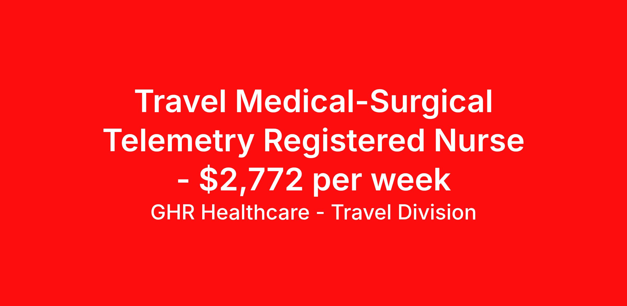 GHR Healthcare - Travel Division is seeking a travel nurse RN Med Surg / Telemetry for a travel nursing job in Cambridge, Massachusetts. Job Description & Requirements Specialty: Med Surg / Telemetry Discipline: RN Start Date: ASAP Duration: 8 weeks 36 hours per week Shift: 12 hours Employment Type: Travel GHR Healthcare - Travel Division Job ID 74127172. Pay package is based on 12 hour shifts and 36 hours per week (subject to confirmation) with tax-free stipend amount to be determined. About GHR Healthcare - Travel Division For over 30 years, GHR Healthcare has been the bridge between healthcare professionals and the facilities that need them nationwide. We're committed to uncovering your ideal fit, supported by GHR's dedication to competitive compensation, transparent communication, and a devoted team that genuinely cares about your career journey. You can trust us to stand by your side as your advocate, confidante, and partner in advancing your career. At GHR, care and consideration are at the heart of everything we do. Visit ghrhealthcare.com to learn more.