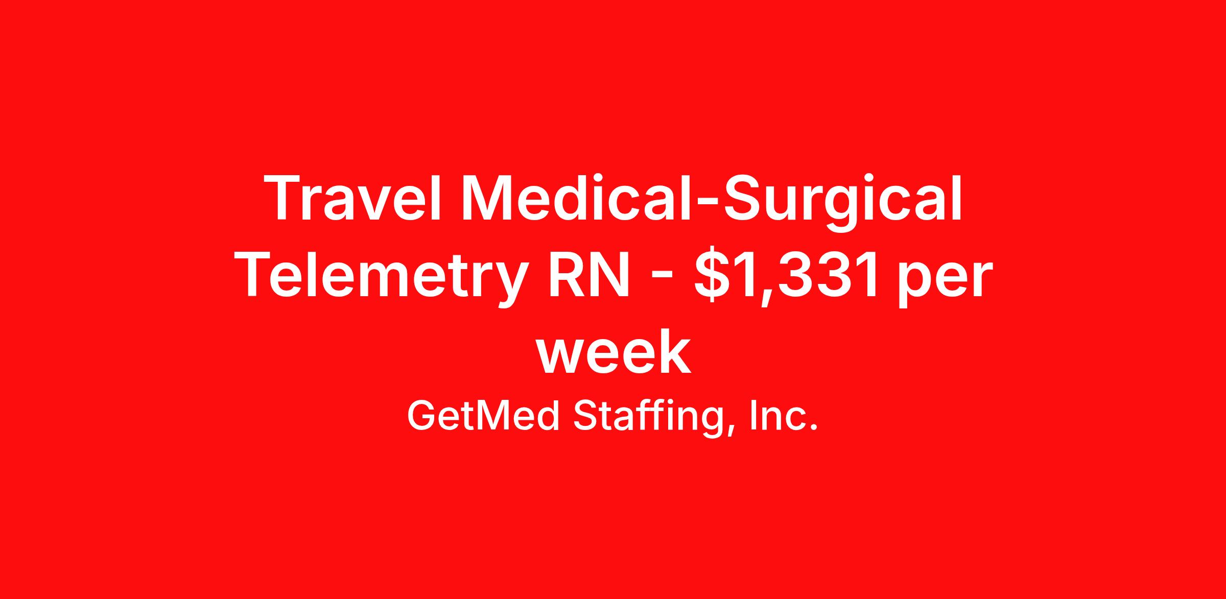 GetMed Staffing, Inc. is seeking a travel nurse RN Med Surg for a travel nursing job in Tyler, Texas. Job Description & Requirements Specialty: Med Surg Discipline: RN Start Date: 04/20/2026 Duration: 13 weeks 36 hours per week Shift: 12 hours, nights Employment Type: Travel GetMed Staffing is searching for a strong MedSurg RN to assist our traveler-friendly client. A minimum of 1-2 years of experience is required. Traveling with GetMed Staffing offers the unique opportunity to gain diverse experiences, both personally and professionally. Gain experience that matters. GetMed Staffing, Inc. Job ID 36030976. Pay package is based on 12 hour shifts and 36.0 hours per week (subject to confirmation) with tax-free stipend amount to be determined. Posted job title: RN:MedSurg,19:00:00-07:00:00 About GetMed Staffing, Inc. We are a diversity owned company, specializing in healthcare recruiting services. We truly understand how important a healthcare travelers' relationship is with their recruiter, as well as our relationship is with our healthcare facilities. We recognize that the needs of our healthcare travelers can vary, and therefore we provide the personalized touch necessary to ensure a successful travel assignment each and every time. Our healthcare facilities and clients benefit from us putting our healthcare travelers first. GetMed Staffing is excited to be a leader within the industry by focusing on providing healthcare travelers with more choices and possibilities as they plan for their next healthcare travel assignment. Benefits Life insurance Medical benefits Dental benefits Vision benefits 401k retirement plan