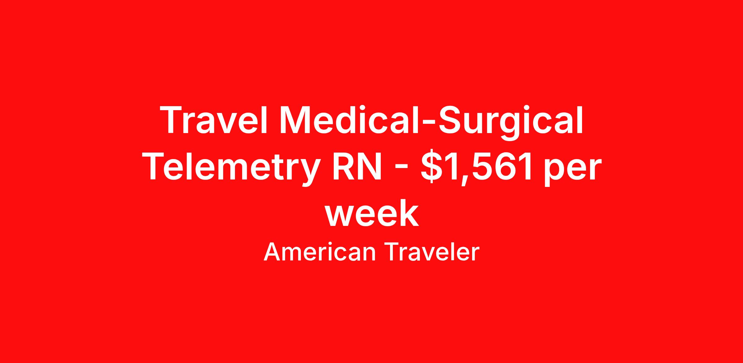 American Traveler is seeking a travel nurse RN Med Surg / Telemetry for a travel nursing job in Tyler, Texas. Job Description & Requirements Specialty: Med Surg / Telemetry Discipline: RN Start Date: 04/06/2026 Duration: 13 weeks 36 hours per week Shift: 12 hours, nights Employment Type: Travel Assignment Overview Shift: Nights, 3x12hrs Hours: 36 hrs/wk Start Date: Apr 6, 2026 Length: 13 weeks Openings: 3 Description American Traveler is seeking an experienced RN for a Medical-Surgical/Telemetry position requiring Epic proficiency and a minimum of 2 years of experience for a 13-week night shift contract in Texas. Details Work in a 19-bed Medical-Surgical/Telemetry unit (2 South) consisting of 18 private rooms and one semi-private room with a maximum census of 20 patients Patient population ranges from young adults through geriatrics with a broad range of care needs Telemetry capabilities are available on this unit Patient ratio is 1:6 Night shift schedule: 3x12-hour shifts, 19:00–07:00 Half of all scheduled shifts will include weekend hours Epic EMR — experience required Requirements Active TX RN license or compact RN license valid in Texas, required at time of consideration Current certifications required: BLS and NIH Stroke Scale (NIHSS) Minimum 2 years of RN experience required Prior travel nursing experience preferred Epic EMR experience required Additional Information Candidates must reside outside of the following TX counties to be eligible: Henderson, Anderson, Cherokee, Rusk, Panola, Smith, Gregg, Van Zandt, Wood, Upshur, Camp, Hopkins, Franklin, Titus, and Morris — candidates residing within 50 miles of the facility are not accepted Former permanent staff must have been separated from the facility for at least 1 year before being eligible to return as a traveler No travel pairs or groups accepted RTO is limited to no more than 3 days and none during the first week of orientation 2 professional references from a supervisor within the past 2 years are required for consideration American Traveler Job ID P-684103. Pay package is based on 12 hour shifts and 36 hours per week (subject to confirmation) with tax-free stipend amount to be determined. Posted job title: Travel RN - Med/Surg About American Traveler With over 25 years of experience, American Traveler has established a reputation for outstanding customer service. Our team ensures a smooth, worry-free experience for those starting on or expanding their travel nursing and allied careers. With thousands of travel nursing and allied jobs nationwide, our attentive and approachable recruiters find positions that align perfectly with your career aspirations and personal requirements. American Traveler offers exceptional benefits, including premium medical, dental, vision and life insurance beginning day one of your assignment, generous 401(k) match, substantial housing stipends, and more. Additionally, with 24/7 support and access to our in-house clinicians, you are assured confidence and comfort throughout your assignment. With our team behind you, you can relax and enjoy a rewarding travel career.